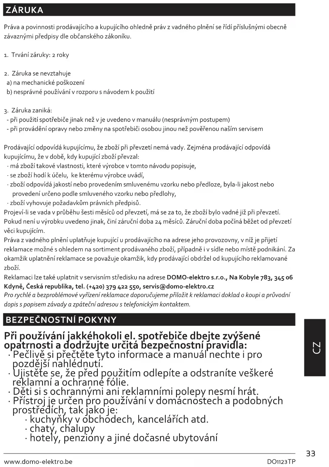 - zboží vyhovuje požadavkům právních předpisů. Projeví-li se vada v průběhu šesti měsíců od převzetí, má se za to, že zboží bylo vadné již při převzetí. Pokud není u výrobku uvedeno jinak, činí záruční doba 24 měsíců. Záruční doba počíná běžet od převzetí věci kupujícím. Práva z vadného plnění uplatňuje kupující u prodávajícího na adrese jeho provozovny, v níž je přijetí reklamace možné s ohledem na sortiment prodávaného zboží, případně i v sídle nebo místě podnikání. Za okamžik uplatnění reklamace se považuje okamžik, kdy prodávající obdržel od kupujícího reklamované zboží. Reklamaci lze také uplatnit v servisním středisku na adrese DOMO-elektro s.r.o., Na Kobyle 783, 345 06 Kdyně, Česká republika, tel. (+420) 379 422 550, servis@domo-elektro.cz Pro rychlé a bezproblémové vyřízení reklamace doporučujeme přiložit k reklamaci doklad o koupi a průvodní dopis s popisem závady a zpáteční adresou s telefonickým kontaktem.