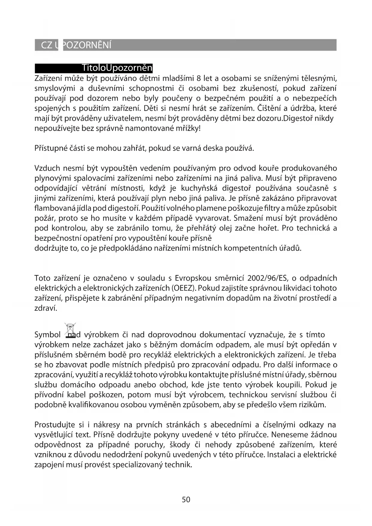 TitoloUpozornění Zařízení může být používáno dětmi mladšími 8 let a osobami se sníženými tělesnými, smyslovými a duševními schopnostmi či osobami bez zkušeností, pokud zařízení používají pod dozorem nebo byly poučeny o bezpečném použití a o nebezpečích spojených s použitím zařízení. Děti si nesmí hrát se zařízením. Čištění a údržba, které mají být prováděny uživatelem, nesmí být prováděny dětmi bez dozoru.Digestoř nikdy nepoužívejte bez správně namontované mřížky! Přístupné části se mohou zahřát, pokud se varná deska používá. Vzduch nesmí být vypouštěn vedením používaným pro odvod kouře produkovaného plynovými spalovacími zařízeními nebo zařízeními na jiná paliva. Musí být připraveno odpovídající větrání místnosti, když je kuchyňská digestoř používána současně s jinými zařízeními, která používají plyn nebo jiná paliva. Je přísně zakázáno připravovat ambovaná jídla pod digestoří. Použití volného plamene poškozuje ltry a může způsobit požár, proto se ho musíte v každém případě vyvarovat. Smažení musí být prováděno pod kontrolou, aby se zabránilo tomu, že přehřátý olej začne hořet. Pro technická a bezpečnostní opatření pro vypouštění kouře přísně dodržujte to, co je předpokládáno nařízeními místních kompetentních úřadů. Toto zařízení je označeno v souladu s Evropskou směrnicí 2002/96/ES, o odpadních elektrických a elektronických zařízeních (OEEZ). Pokud zajistíte správnou likvidaci tohoto zařízení, přispějete k zabránění případným negativním dopadům na životní prostředí a zdraví. Symbol nad výrobkem či nad doprovodnou dokumentací vyznačuje, že s tímto výrobkem nelze zacházet jako s běžným domácím odpadem, ale musí být opředán v příslušném sběrném bodě pro recykláž elektrických a elektronických zařízení. Je třeba se ho zbavovat podle místních předpisů pro zpracování odpadu. Pro další informace o zpracování, využití a recykláž tohoto výrobku kontaktujte příslušné místní úřady, sběrnou službu domácího odpoadu anebo obchod, kde jste tento výrobek koupili. Pokud je přívodní kabel poškozen, potom musí být výrobcem, technickou servisní službou či podobně kvalikovanou osobou vyměněn způsobem, aby se předešlo všem rizikům. Prostudujte si i nákresy na prvních stránkách s abecedními a číselnými odkazy na vysvětlující text. Přísně dodržujte pokyny uvedené v této příručce. Neneseme žádnou odpovědnost za případné poruchy, škody či nehody způsobené zařízením, které vzniknou z důvodu nedodržení pokynů uvedených v této příručce. Instalaci a elektrické zapojení musí provést specializovaný technik. AVVERTENZE