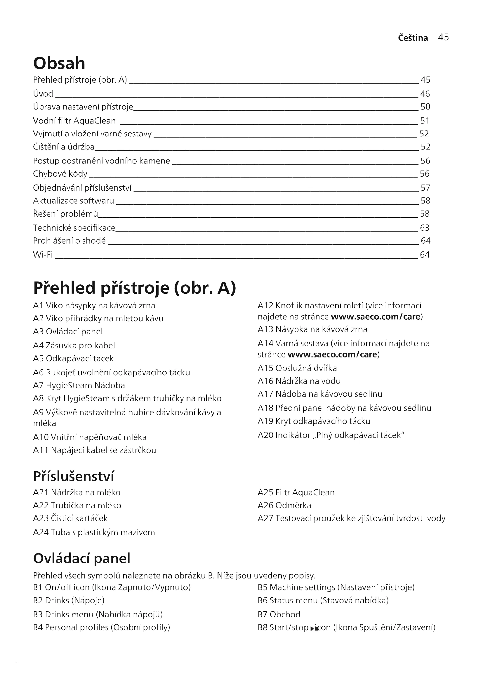 Čeština Obsah Přehled přístroje (obr.A) ___________________________________________________________________ 45 Úvod ____________________________________________________________________________________ 46 Úprava nastavení přístroje__________________________________________________________________ 50 Vodní filtr AquaClean _____________________________________________________________________ 51 Vyjmutí avložení varné sestavy _____________________________________________________________ 52 Čištění aúdržba___________________________________________________________________________ 52 Postup odstranění vodního kamene _________________________________________________________ 56 Chybové kódy ____________________________________________________________________________ 56 Objednávání příslušenství __________________________________________________________________ 57 Aktualizace softwaru ______________________________________________________________________ 58 Řešení problémů__________________________________________________________________________ 58 Technické specifikace______________________________________________________________________ 63 Prohlášení oshodě ________________________________________________________________________ 64 Wi-Fi ____________________________________________________________________________________ 64 Přehled přístroje (obr.A) A1 Víko násypky na kávová zrna A2 Víko přihrádky na mletou kávu A3 Ovládací panel A4 Zásuvka pro kabel A5 Odkapávací tácek A6 Rukojeť uvolnění odkapávacího tácku A7 HygieSteam Nádoba A8 Kryt HygieSteam sdržákem trubičky na mléko A9 Výškově nastavitelná hubice dávkování kávy a mléka A10 Vnitřní napěňovač mléka A11 Napájecí kabel se zástrčkou A12 Knoflík nastavení mletí (více informací najdete na stránce www.saeco.com/care) A13 Násypka na kávová zrna A14 Varná sestava (více informací najdete na stránce www.saeco.com/care) A15 Obslužná dvířka A16 Nádržka na vodu A17 Nádoba na kávovou sedlinu A18 Přední panel nádoby na kávovou sedlinu A19 Kryt odkapávacího tácku A20 Indikátor „Plný odkapávací tácek“ Příslušenství A21 Nádržka na mléko A22 Trubička na mléko A23 Čisticí kartáček A24 Tuba splastickým mazivem A25 Filtr AquaClean A26 Odměrka A27 Testovací proužek ke zjišťování tvrdosti vody Ovládací panel Přehled všech symbolů naleznete na obrázkuB. Níže jsou uvedeny popisy. B1 On/off icon (Ikona Zapnuto/Vypnuto) B2 Drinks (Nápoje) B3 Drinks menu (Nabídka nápojů) B4 Personal profiles (Osobní profily) B5 Machine settings (Nastavení přístroje) B6 Status menu (Stavová nabídka) B7 Obchod B8 Start/stop icon (Ikona Spuštění/Zastavení)46 Čeština Úvod Gratulujeme vám kzakoupení plně automatického kávovaru Saeco! Chcete-li plně využívat výhod online podpory nabízené společností Saeco, můžete pomocí ovládacího panelu provést registraci přístroje přes vestavěné Wi-Fi připojení, případně můžete navštívit web www.saeco.com/MyCoffeeMachine asvůj produkt zaregistrovat tam. Před prvním použitím kávovaru si pečlivě přečtěte samostatnou brožuru sbezpečnostními informacemi a uschovejte ji pro budoucí použití. Plně automatický kávovar Saeco nabízí prostřednictvím připojení kWi-Fi síti rozšířené možnosti. Přístroj připojený kWi-Fi síti nabízí uživateli tyto funkce:
