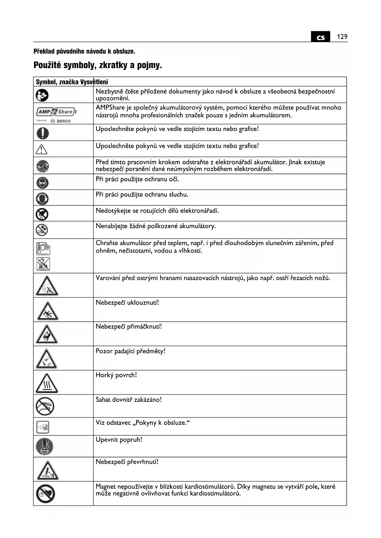 Překlad původního návodu k obsluze. Použité symboly, zkratky a pojmy. Symbol, značka Vysvětlení Nezbytně čtěte přiložené dokumenty jako návod k obsluze a všeobecná bezpečnostní upozornění. AMPShare je společný akumulátorový systém, pomocí kterého můžete používat mnoho nástrojů mnoha profesionálních značek pouze s jedním akumulátorem. Uposlechněte pokynů ve vedle stojícím textu nebo grafice! Uposlechněte pokynů ve vedle stojícím textu nebo grafice! Před tímto pracovním krokem odstraňte z elektronářadí akumulátor. Jinak existuje nebezpečí poranění dané neúmyslným rozběhem elektronářadí. Při práci použijte ochranu očí. Při práci použijte ochranu sluchu. Nedotýkejte se rotujících dílů elektronářadí. Nenabíjejte žádné poškozené akumulátory. Chraňte akumulátor před teplem, např. i před dlouhodobým slunečním zářením, před ohněm, nečistotami, vodou a vlhkostí. Varování před ostrými hranami nasazovacích nástrojů, jako např. ostří řezacích nožů. Nebezpečí uklouznutí! Nebezpečí přimáčknutí! Pozor padající předměty! Horký povrch! Sahat dovnitř zakázáno! Viz odstavec „Pokyny k obsluze.“ Upevnit popruh! Nebezpečí převrhnutí! Magnet nepoužívejte v blízkosti kardiostimulátorů. Díky magnetu se vytváří pole, které může negativně ovlivňovat funkci kardiostimulátorů. max.50°C130
