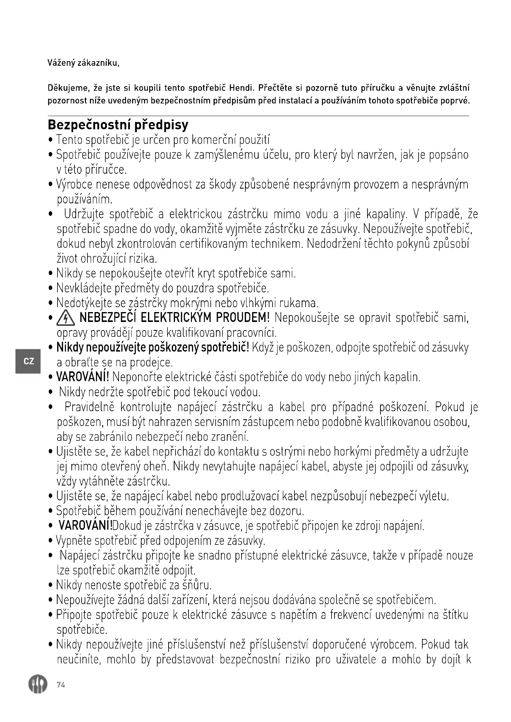 Vážený zákazníku, Děkujeme, že jste si koupili tento spotřebič Hendi. Přečtěte si pozorně tuto příručku a věnujte zvláštní pozornost níže uvedeným bezpečnostním předpisům před instalací a používáním tohoto spotřebiče poprvé. Bezpečnostní předpisy