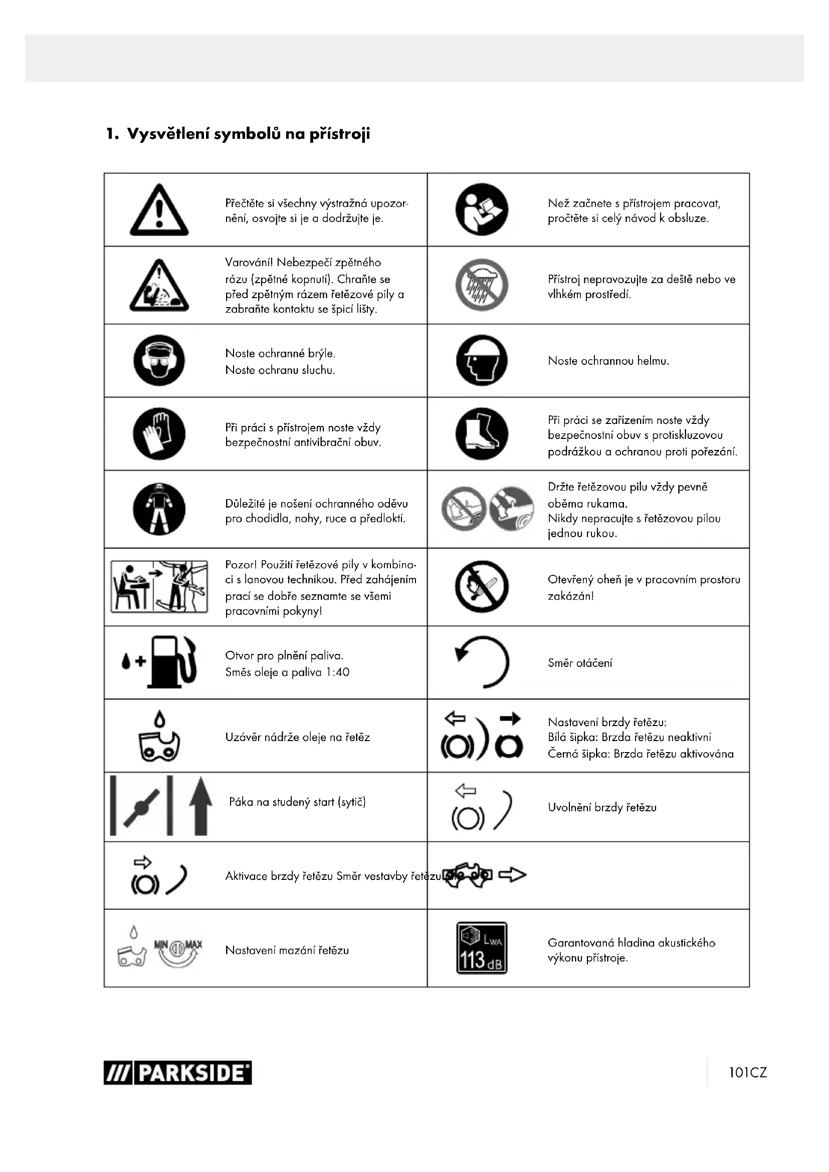 Přečtěte si všechny výstražná upozor- nění, osvojte si je a dodržujte je. Než začnete s přístrojem pracovat, pročtěte si celý návod k obsluze. Varování! Nebezpečí zpětného rázu (zpětné kopnutí). Chraňte se před zpětným rázem řetězové pily a zabraňte kontaktu se špicí lišty. Přístroj neprovozujte za deště nebo ve vlhkém prostředí. Noste ochranné brýle. Noste ochranu sluchu. Noste ochrannou helmu. Při práci s přístrojem noste vždy bezpečnostní antivibrační obuv. Při práci se zařízením noste vždy bezpečnostní obuv s protiskluzovou podrážkou a ochranou proti pořezání. Důležité je nošení ochranného oděvu pro chodidla, nohy, ruce a předloktí. Držte řetězovou pilu vždy pevně oběma rukama. Nikdy nepracujte s řetězovou pilou jednou rukou. Pozor! Použití řetězové pily v kombina- ci s lanovou technikou. Před zahájením prací se dobře seznamte se všemi pracovními pokyny! Otevřený oheň je v pracovním prostoru zakázán! Otvor pro plnění paliva. Směs oleje a paliva 1:40 Směr otáčení Uzávěr nádrže oleje na řetěz Nastavení brzdy řetězu: Bílá šipka: Brzda řetězu neaktivní Černá šipka: Brzda řetězu aktivována Páka na studený start (sytič) Uvolnění brzdy řetězu Aktivace brzdy řetězu Směr vestavby řetězu pily Nastavení mazání řetězu Garantovaná hladina akustického výkonu přístroje.102 CZ Pozor! Horké části. push primer 6 times Stiskněte 6x palivové čerpadlo (Primer). Směr chodu řetězu RIZIKO Signální slovo označující bezprostředně nastávající nebezpečnou situaci, která může mít za následek smrt nebo vážné zranění, pokud se jí nezabrání. VAROVÁNÍ Signální slovo označující potenciálně nebezpečnou situaci, která by mohla mít za následek smrt nebo vážné zranění, pokud se jí nezabrání. OPATRNĚ Signální slovo označující potenciálně nebezpečnou situaci, která by mohla mít za následek lehké nebo středně těžké zranění, pokud se jí nezabrání. UPOZORNĚNÍ Signální slovo označující potenciálně nebezpečnou situaci, která by mohla mít za následek poškození výrobku nebo vlastnictví/majetku.