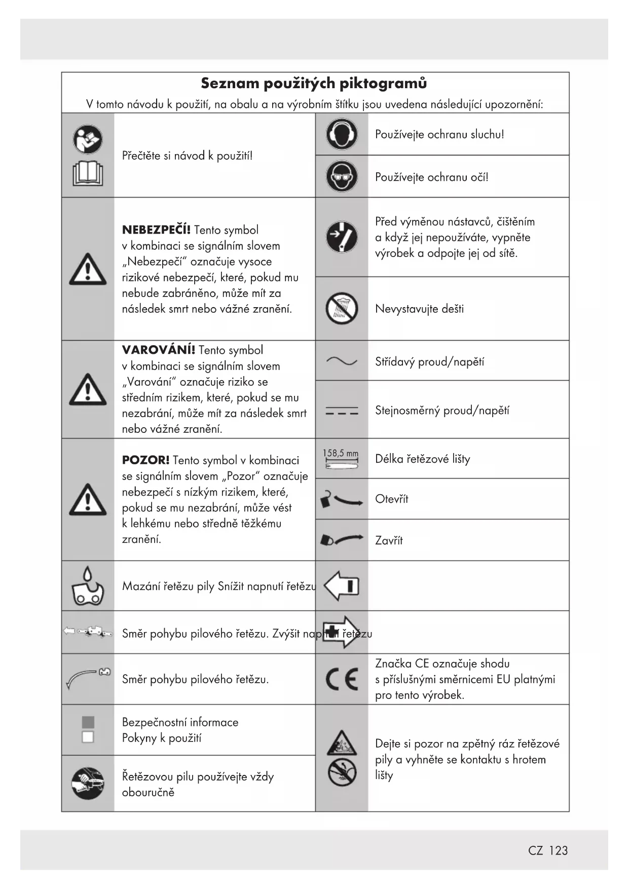 Seznam použitých piktogramů Vtomto návodu kpoužití, na obalu ana výrobním štítku jsou uvedena následující upozornění: Přečtěte si návod kpoužití! Používejte ochranu sluchu! Používejte ochranu očí! NEBEZPEČÍ! Tento symbol vkombinaci se signálním slovem „Nebezpečí“ označuje vysoce rizikové nebezpečí, které, pokud mu nebude zabráněno, může mít za následek smrt nebo vážné zranění. Před výměnou nástavců, čištěním akdyž jej nepoužíváte, vypněte výrobek aodpojte jej od sítě. Nevystavujte dešti VAROVÁNÍ! Tento symbol vkombinaci se signálním slovem „Varování“ označuje riziko se středním rizikem, které, pokud se mu nezabrání, může mít za následek smrt nebo vážné zranění. Střídavý proud/napětí Stejnosměrný proud/napětí POZOR! Tento symbol vkombinaci se signálním slovem „Pozor“ označuje nebezpečí snízkým rizikem, které, pokud se mu nezabrání, může vést klehkému nebo středně těžkému zranění. 158,5 mm Délka řetězové lišty Otevřít Zavřít Mazání řetězu pily Snížit napnutí řetězu Směr pohybu pilového řetězu. Zvýšit napnutí řetězu Směr pohybu pilového řetězu. Značka CE označuje shodu spříslušnými směrnicemi EU platnými pro tento výrobek. Bezpečnostní informace Pokyny kpoužití Dejte si pozor na zpětný ráz řetězové pily avyhněte se kontaktu shrotem lišty Řetězovou pilu používejte vždy obouručně124