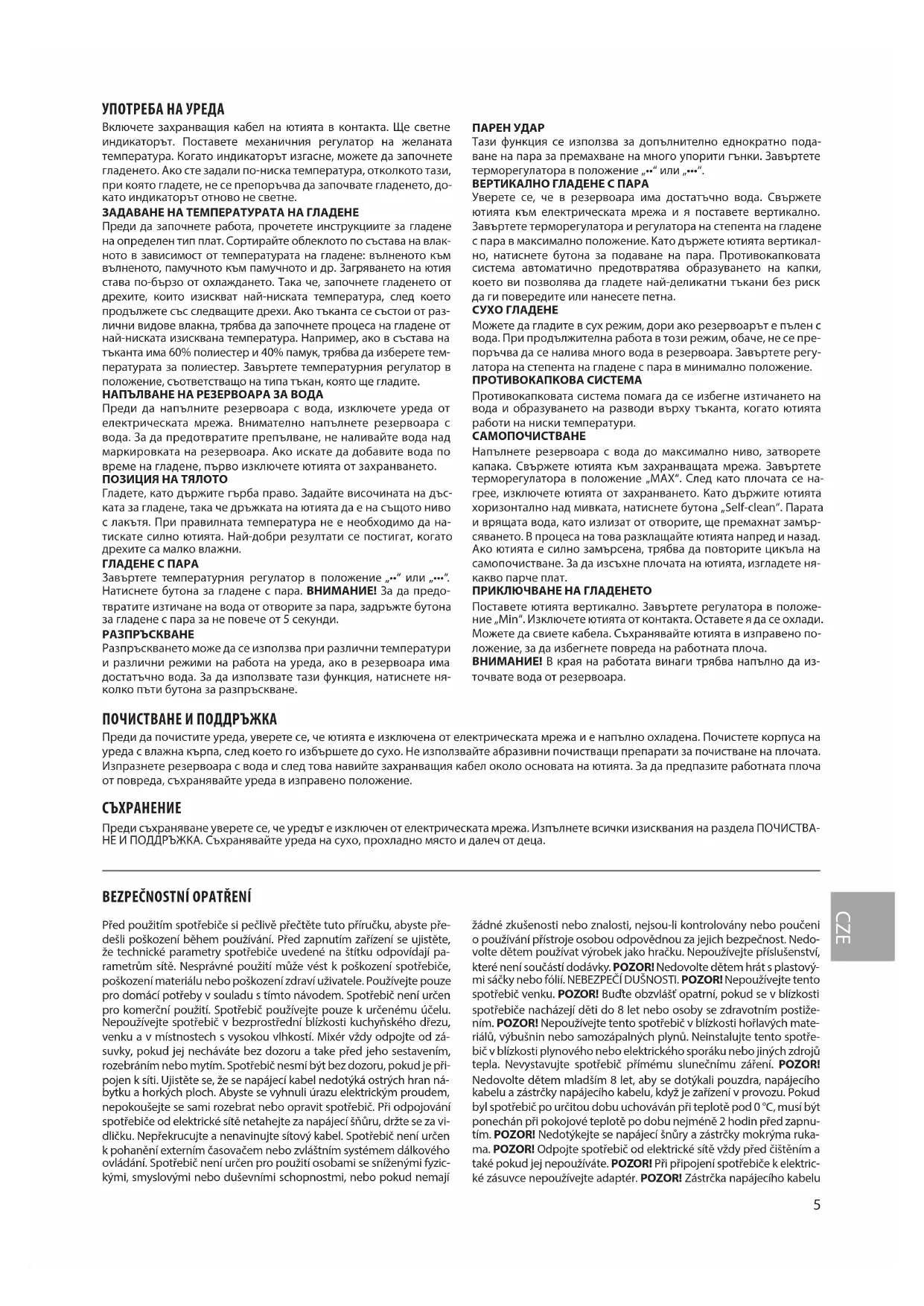 bEzPEČNOSTNÍ OPATŘENÍ Před použitím spotřebiče si pečlivě přečtěte tuto příručku, abyste pře- dešli poškození během používání. Před zapnutím zařízení se ujistěte, že technické parametry spotřebiče uvedené na štítku odpovídají pa- rametrům sítě. Nesprávné použití může vést k poškození spotřebiče, poškození materiálu nebo poškození zdraví uživatele. Používejte pouze pro domácí potřeby v souladu s tímto návodem. Spotřebič není určen pro komerční použití. Spotřebič používejte pouze k určenému účelu. Nepoužívejte spotřebič v bezprostřední blízkosti kuchyňského dřezu, venku a v místnostech s vysokou vlhkostí. Mixér vždy odpojte od zá- suvky, pokud jej necháváte bez dozoru a take před jeho sestavením, rozebráním nebo mytím. Spotřebič nesmí být bez dozoru, pokud je při- pojen k síti. Ujistěte se, že se napájecí kabel nedotýká ostrých hran ná- bytku a horkých ploch. Abyste se vyhnuli úrazu elektrickým proudem, nepokoušejte se sami rozebrat nebo opravit spotřebič. Při odpojování spotřebiče od elektrické sítě netahejte za napájecí šňůru, držte se za vi- dličku. Nepřekrucujte a nenavinujte sítový kabel. Spotřebič není určen k pohanění externím časovačem nebo zvláštním systémem dálkového ovládání. Spotřebič není určen pro použití osobami se sníženými fyzic- kými, smyslovými nebo duševními schopnostmi, nebo pokud nemají žádné zkušenosti nebo znalosti, nejsou-li kontrolovány nebo poučeni o používání přístroje osobou odpovědnou za jejich bezpečnost. Nedo- volte dětem používat výrobek jako hračku. Nepoužívejte příslušenství, které není součástí dodávky. POZOR! Nedovolte dětem hrát s plastový- mi sáčky nebo fólií. NEBEZPEČÍ DUŠNOSTI. POZOR! Nepoužívejte tento spotřebič venku. POZOR! Buďte obzvlášť opatrní, pokud se v blízkosti spotřebiče nacházejí děti do 8 let nebo osoby se zdravotním postiže- ním. POZOR! Nepoužívejte tento spotřebič v blízkosti hořlavých mate- riálů, výbušnin nebo samozápalných plynů. Neinstalujte tento spotře- bič v blízkosti plynového nebo elektrického sporáku nebo jiných zdrojů tepla. Nevystavujte spotřebič přímému slunečnímu záření. POZOR! Nedovolte dětem mladším 8 let, aby se dotýkali pouzdra, napájecího kabelu a zástrčky napájecího kabelu, když je zařízení v provozu. Pokud byl spotřebič po určitou dobu uchováván při teplotě pod 0 °C, musí být ponechán při pokojové teplotě po dobu nejméně 2 hodin před zapnu- tím. POZOR! Nedotýkejte se napájecí šnůry a zástrčky mokrýma ruka- ma. POZOR! Odpojte spotřebič od elektrické sítě vždy před čištěním a také pokud jej nepoužíváte. POZOR! Při připojení spotřebiče k elektric- ké zásuvce nepoužívejte adaptér. POZOR! Zástrčka napájecího kabelu CZE6 má drát a zemnicí kontakt. Připojujte spotřebič pouze k řádně uzemně- né zásuvce. POZOR! Aby nedošlo k přetížení sítě, nepřipojujte spotře- bič a další elektrické spotřebiče do stejné sítě. Před naplněním a nebo vypuštěním vody z nádrže a také pokud nepoužíváte výrobek, odpojte jej od elektrické sítě. Postavte žehličku na žehlící prkno opatrně, abyste nepoškodili pracovní povrch. POZOR! Do nádrže pro vodu nenalívejte aromatizované těkutiny, ocet, roztok škrobu, reagenty pro odstranění usazenin, chemické látky a.t.d. POZOR! Zástrčka přívodního kabelu má uzemění. Připojujte výrobek jen k odpovídajícím uzeměným zásuvkám. POZOR! Nepokládejte žehličku na kovové a nerovné povrchy. Nežeh- lete přes knoíky, zipy a patentky, protože mohou poškodit pracovní povrch. POZOR! Buďte opatrní , nedotýkejte se kovových částí žehličky. POZOR! Pravidelně čistěte žehličku od usazenin. Závady, které vznikly v důsledku usazenin nejsou záručním případem. POZOR! Pro doda- tečnou ochranu v napájecím obvodu je vhodné nainstalovat zařízení s proudovým proudem s jmenovitým provozním proudem nepřesa- hujícím 30 mA. Chcete-li zařízení nainstalovat, kontaktujte odborníka. POUŽÍVÁNÍ VÝRObKU Připojte elektrický kabel k zásuvce. Zasvítí se indikátor. Přepojte mecha- nický regulátor na potřebnou teplotu. Když indikátor zhasne, můžete zahájit žehlení. Pokud jste uložili teplotu menší, než při které jste žehlili, nedoporučuje se začínat žehlit, dokud se indikátor znovu nerozsvítí.