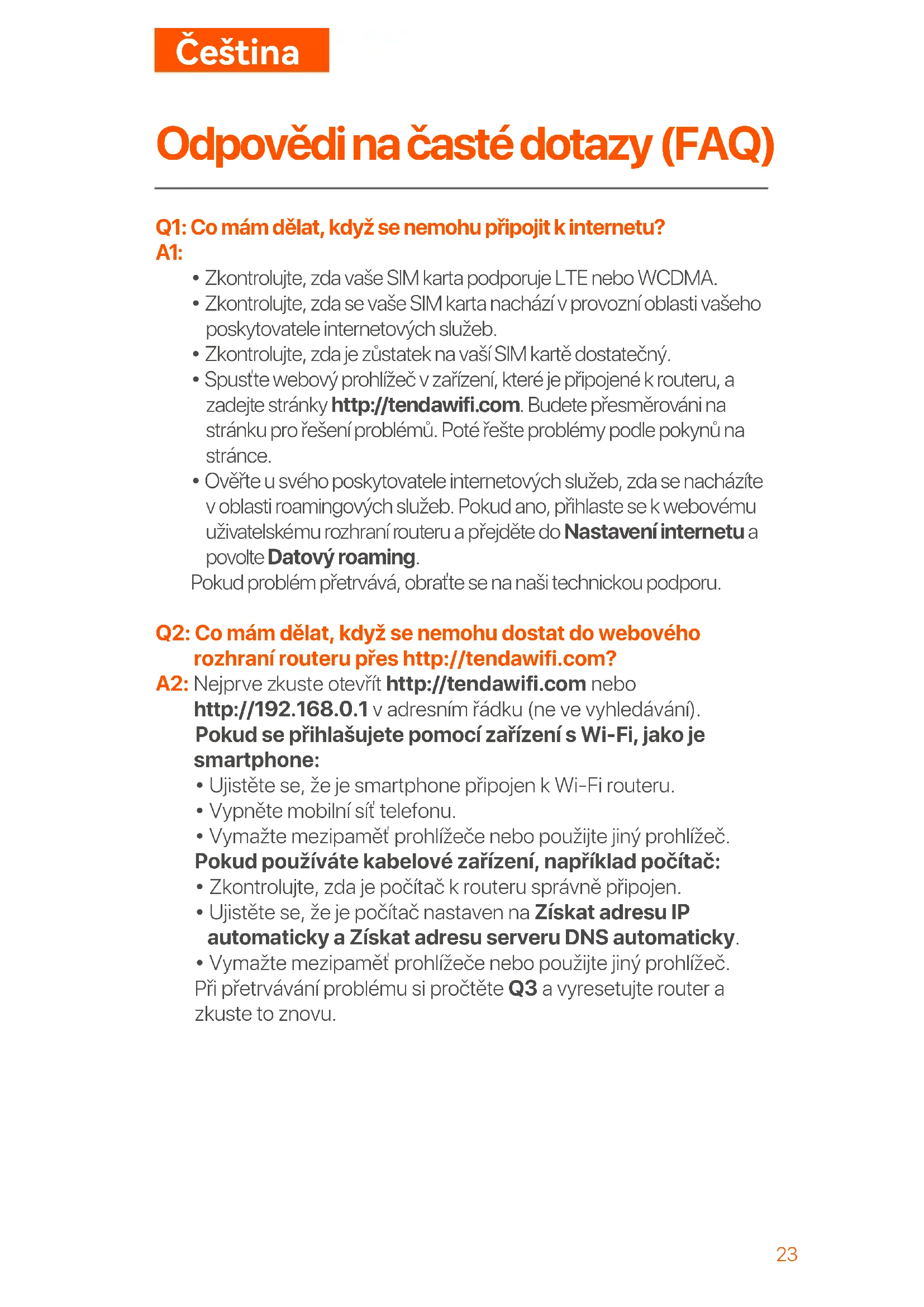 - Ověřte u svého poskytovatele internetových služeb, zda se nacházíte v oblasti roamingových služeb. Pokud ano, přihlaste se k webovému uživatelskému rozhraní routeru a přejděte do Nastavení internetu a povolte Datový roaming. Pokud problém přetrvává, obraťte se na naši technickou podporu. Q2: Co mám dělat, když se nemohu dostat do webového rozhraní routeru přes http://tendawifi.com? A2: Nejprve zkuste otevřít http://tendawifi.com nebo http://192.168.0.1 v adresním řádku (ne ve vyhledávání). Pokud se přihlašujete pomocí zařízení s Wi-Fi, jako je smartphone: