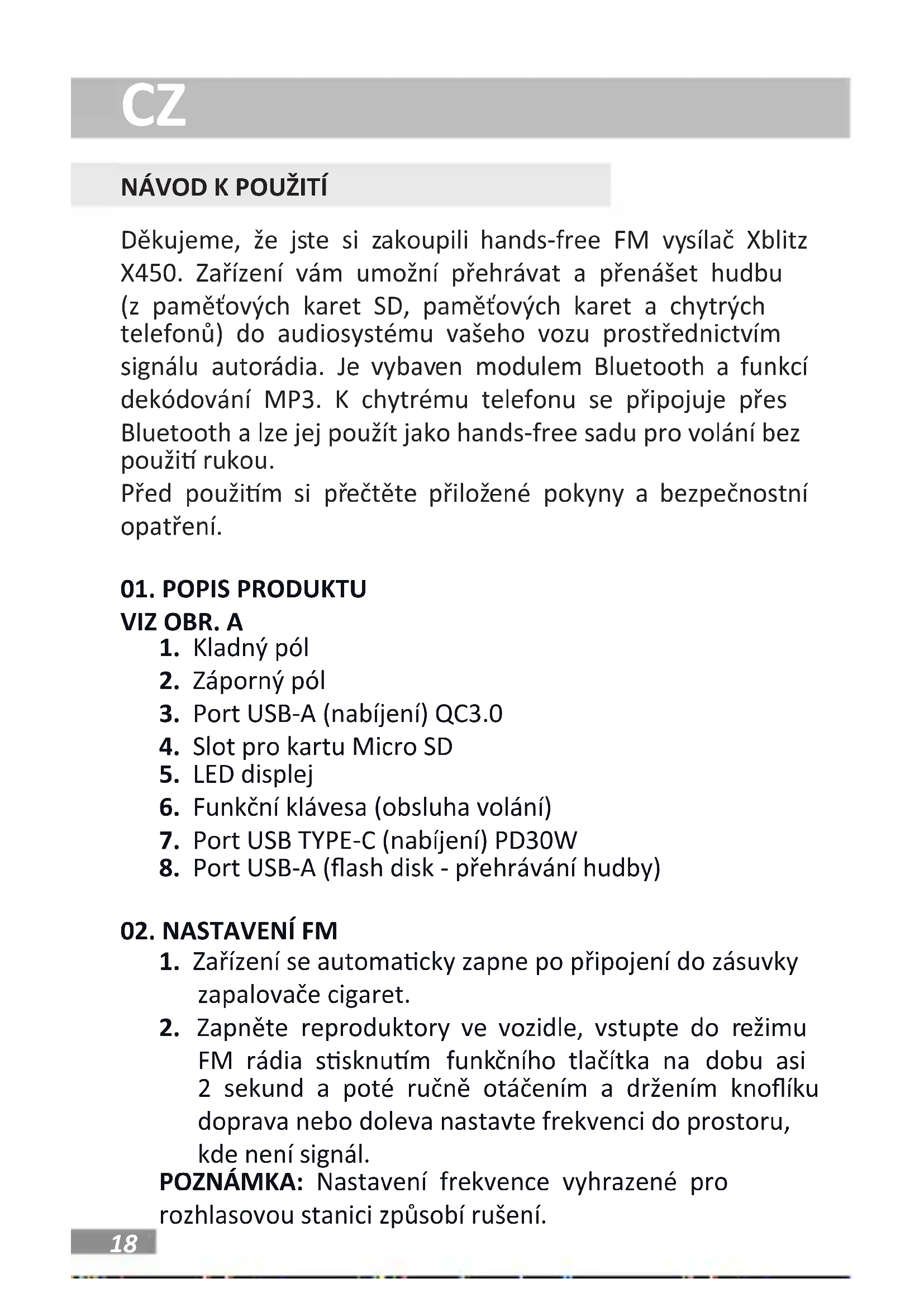 Děkujeme, že jste si zakoupili hands-free FM vysílač Xblitz X450. Zařízení vám umožní přehrávat a přenášet hudbu (z paměťových karet SD, paměťových karet a chytrých telefonů) do audiosystému vašeho vozu prostřednictvím signálu autorádia. Je vybaven modulem Bluetooth a funkcí dekódování MP3. K chytrému telefonu se připojuje přes Bluetooth a lze jej použít jako hands-free sadu pro volání bez použi rukou. Před použim si přečtěte přiložené pokyny a bezpečnostní opatření.