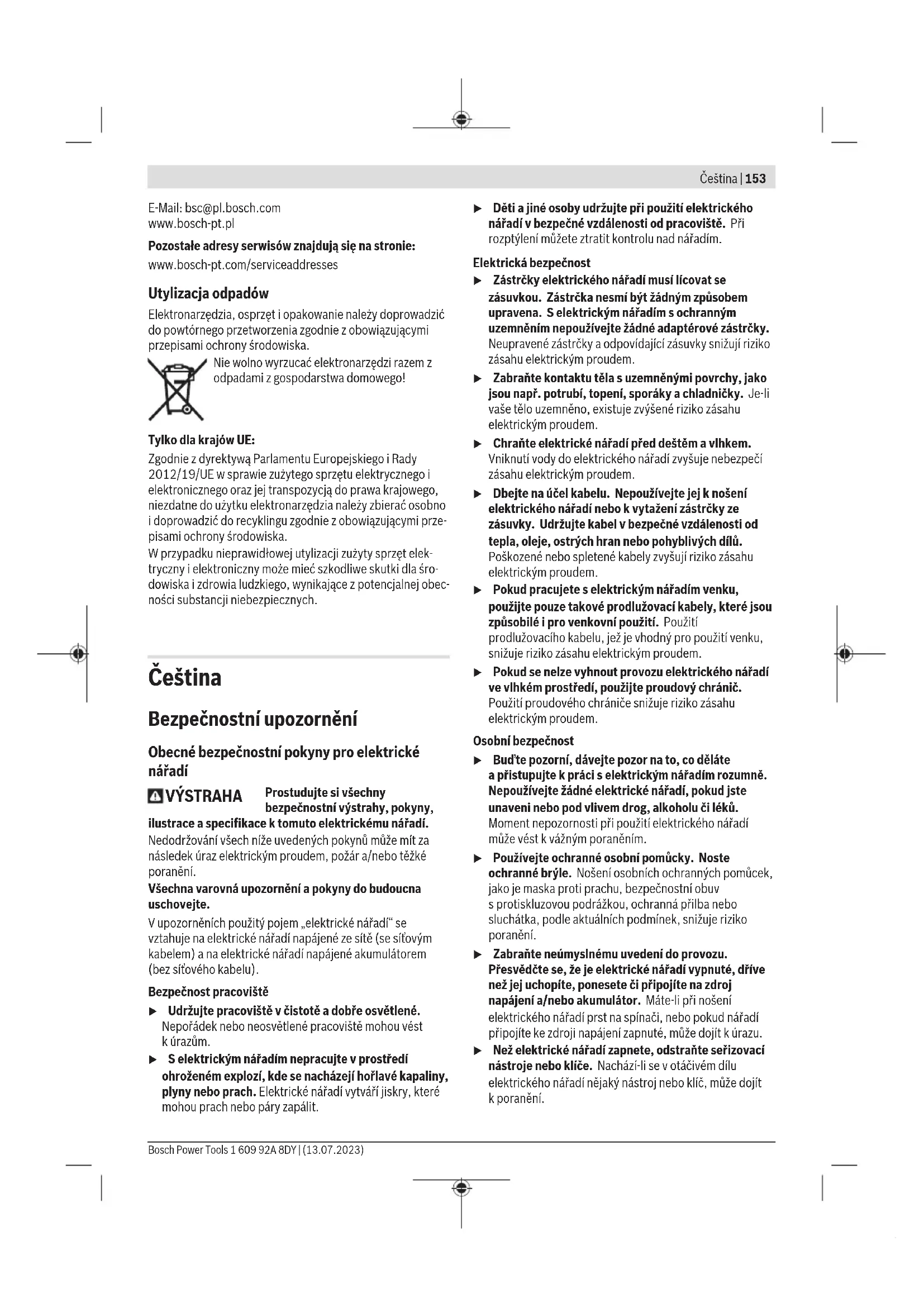 vzávislosti na použitém ochranném krytu ((8),(7),(9)) apoužité přídavné rukojeti ((5),(4)) Údaje platí pro jmenovité napětí [U] 230V. Uodlišných napětí auspecifických provedení pro příslušné země se mohou tyto údaje lišit. Hodnoty se mohou podle výrobku lišit amají na ně vliv podmínky použití aprostředí. Další informace najdete na www.bosch-professional.com/wac. Informace ohluku avibracích Hodnoty hlučnosti zjištěny podle ENIEC62841-2-3. Hladina hlučnosti při použití váhového filtruA činí utohoto elektrického nářadí typicky: 94 dB(A); hladina akustického výkonu 102 dB(A). Nejistota K= 3 dB. Noste chrániče sluchu! Bosch Power Tools 1 609 92A 8DY | (13.07.2023)158 | Čeština Celkové hodnoty vibrací a