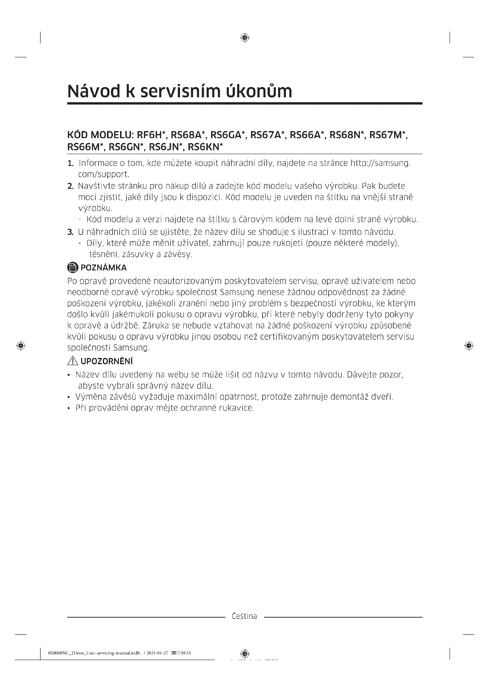 suchou zásuvku. Zpětné nasazení zásuvek Nasazení zásuvek probíhá v opačném pořadí kroků postupu pro jejich vyjmutí. RS8000NC_2Door_User-servicing-manual.indb 4 2021-01-27 7:39:53Čeština Výměna závěsu Při výměně závěsů je třeba nejprve demontovat dveře. UPOZORNĚNÍ