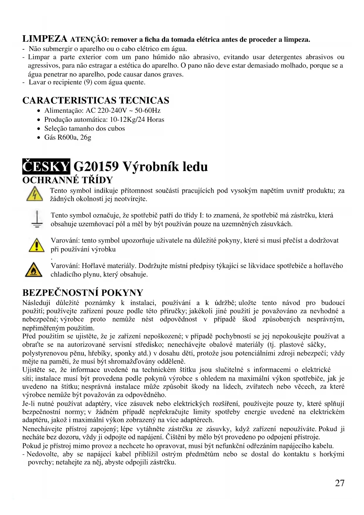 Následují důležité poznámky k instalaci, používání a k údržbě; uložte tento návod pro budoucí použití; používejte zařízení pouze podle této příručky; jakékoli jiné použití je považováno za nevhodné a nebezpečné; výrobce proto nemůže nést odpovědnost v případě škod způsobených nesprávným, nepřiměřeným použitím. Před použitím se ujistěte, že je zařízení nepoškozené; v případě pochybností se jej nepokoušejte používat a obraťte se na autorizované servisní středisko; nenechávejte obalové materiály (tj. plastové sáčky, polystyrenovou pěnu, hřebíky, sponky atd.) v dosahu dětí, protože jsou potenciálními zdroji nebezpečí; vždy mějte na paměti, že musí být shromažďovány odděleně. Ujistěte se, že informace uvedené na technickém štítku jsou slučitelné s informacemi o elektrické síti; instalace musí být provedena podle pokynů výrobce s ohledem na maximální výkon spotřebiče, jak je uvedeno na štítku; nesprávná instalace může způsobit škody na lidech, zvířatech nebo věcech, za které výrobce nemůže být považován za odpovědného. Je-li nutné používat adaptéry, více zásuvek nebo elektrických rozšíření, používejte pouze ty, které splňují bezpečnostní normy; v žádném případě nepřekračujte limity spotřeby energie uvedené na elektrickém adaptéru, jakož i maximální výkon zobrazený na více adaptérech. Nenechávejte přístroj zapojený; lépe vytáhněte zástrčku ze zásuvky, když zařízení nepoužíváte. Pokud ji necháte bez dozoru, vždy ji odpojte od napájení. Čištění by mělo být provedeno po odpojení přístroje. Pokud je přístroj mimo provoz a nechcete ho opravovat, musí být nefunkční odřezáním napájecího kabelu. - Nedovolte, aby se napájecí kabel přiblížil ostrým předmětům nebo se dostal do kontaktu s horkými povrchy; netahejte za něj, abyste odpojili zástrčku.28 - Nepoužívejte přístroj v případě poškození napájecího kabelu, zástrčky nebo v případě zkratu; produkt nechte opravit pouze v autorizovaném servisním středisku. - Přístroj neovládejte mokrýma rukama nebo bosýma nohama ani se ho nedotýkejte. Nevystavujte přístroj škodlivým povětrnostním podmínkám, jako je déšť, vlhkost, mráz atd. Vždy ji skladujte na suchém místě. - Tento přístroj mohou používat děti od 8 let a osoby se sníženými fyzickými, smyslovými nebo duševními schopnostmi nebo s nedostatkem zkušeností a znalostí, pokud obdržely dohled nebo pokyny týkající se bezpečného používání spotřebiče a pochopení s tím spojených nebezpečí; děti si nesmí hrát s přístrojem; čištění a údržbu uživatele nesmí být prováděna dětmi bez dozoru. - Děti si s přístrojem nesmí hrát. Přístroj a jeho přívodní šňůru uchovávejte mimo dosah dětí mladších 8 let. - Používejte pouze originální náhradní díly a příslušenství. Pokud je napájecí kabel poškozen nebo v případě poruchy nemanipuluje s přístrojem. Reparace musí být provedena výrobcem nebo servisním střediskem autorizovaným výrobcem. Nedodržení výše uvedeného může ohrozit bezpečnost přístroje a zrušit záruku. - Tento spotřebič je určen k použití v domácnostech a podobných jako jsou: kuchyňské kouty pro zaměstnance v obchodech, kancelářích a jiných pracovních prostředích; klienty v hotelech, motelech a jiných obytných prostředích; zemědělské domy, nocleh se snídaní. - Přístroj není určen k ovládání pomocí externího časovače nebo samostatného dálkového ovládání. - Před každým použitím rozbalte napájecí kabel. Nepoužívejte v blízkosti hořlavých materiálů nebo pod jejich vlivem (jako jsou záclony), teplo, studené skvrny a pára. OBECNÉ POKYNY Tato jednotka je automatickým výrobcem kostek ledu třídy I, používá se pouze k výrobě ledu Připojte zařízení ke kompatibilní zásuvce. Neponořujte přístroj do vody ani do jiné kapaliny. Po použití nebo před čištěním přístroj odpojte. Nezavřete větrací otvory a udržujte přístroj 8 cm od jiných předmětů, abyste zajistili uvolnění dobrého tepla. Aby nedošlo k úrazu elektrickým proudem, nelijte vodu na kabel, zástrčku a větrání. Nepoužívejte přístroj v blízkosti plamenů, plynu, hořlavých materiálů, varných desek nebo kamen. Nezapínejte často tlačítko napájení (dbejte na interval nejméně 5 minut), aby nedošlo k poškození kompresoru. Před instalací příslušenství nezapínání napájení. Do přístroje neschováváte žádnou výbušnou látku ani hořlavé kapaliny, jako jsou pohonné hmoty. Používejte pouze vodu, která splňuje požadavky na pití Použití v okolí s teplotou mezi 10° a 43° Neuchovávejte v tomto přístroji výbušné látky, jako jsou aerosolové plechovky s hořlavým pohonem. UPOZORNĚNÍ: Nepoužívejte jiné typy elektrických spotřebičů uvnitř výrobníku ledu. UPOZORNĚNÍ: Nepoužívejte mechanická zařízení ani jiné prostředky k urychlení procesu odmrazování nebo odebírání ledu s jinými prostředky než které doporučuje výrobce. POPIS G20159