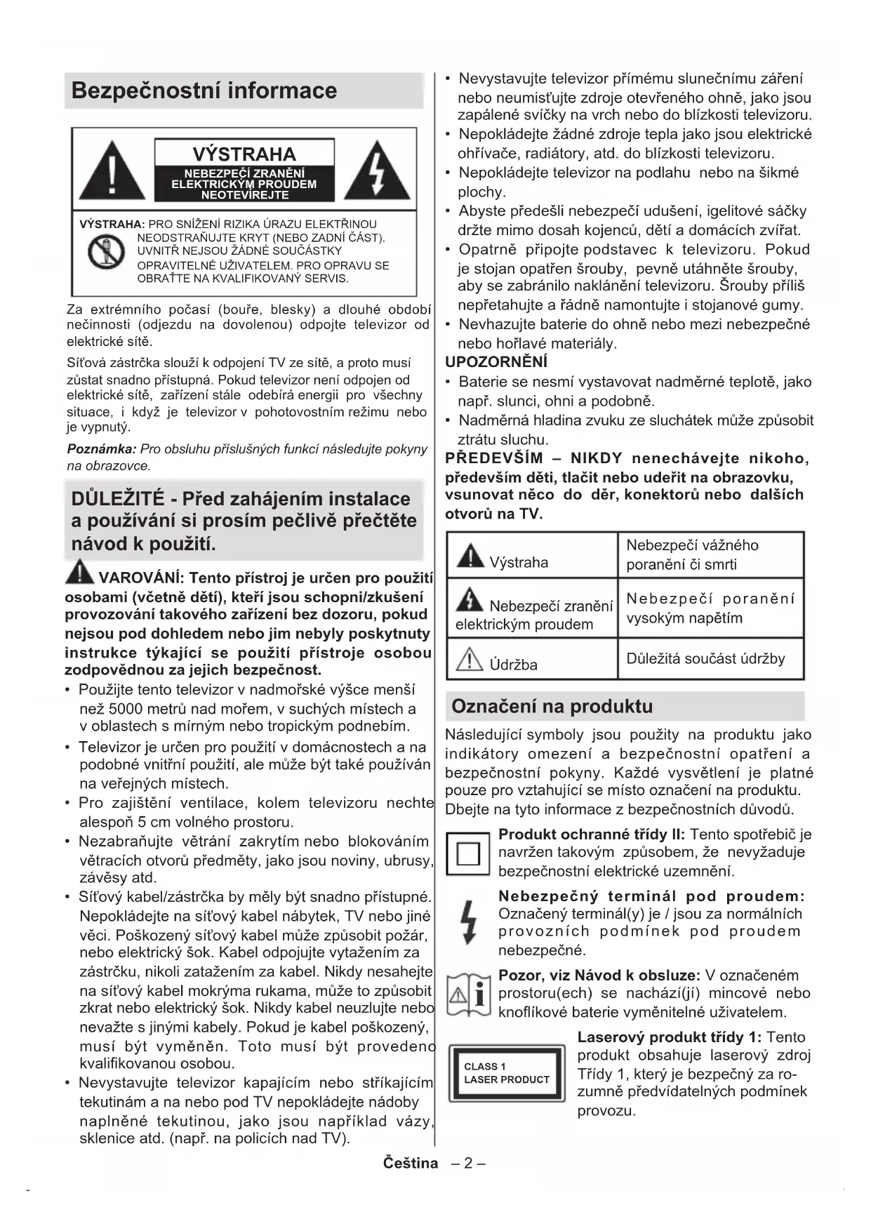 Laserový produkt třídy 1: Tento produkt obsahuje laserový zdroj Třídy 1, který je bezpečný za ro- zumně předvídatelných podmínek provozu.Čeština – 3 – UPOZORNĚNÍ Dejte pozor, ať baterie nespolknete, hrozí nebezpečí chemického popálení Tento výrobek nebo jeho příslušenství dodávané s výrobkem může obsahovat knoflíkovou/mincovou baterii. Pokud dojde k požití knoíkové baterie, může to způsobit vážné vnitřní popáleniny během 2 hodin a může to vést ke smrti. Udržujte nové a použité baterie mimo dosah dětí. Pokud část s baterií není možné bezpečně uzavřít, přestaňte výrobek používat a odložte ho mimo dosah dětí. Pokud si myslíte, že baterie byly spolknuty nebo vloženy do jakékoliv části těla, okamžitě vyhledejte lékařskou pomoc. – – – – – – – – – – – – Varování nebezpečí nestability TV může spadnout a způsobit vážné zranění nebo smrt. Velkému množství zranění, najme dětí, je možné se vyhnout jednoduchými opatřeními:
