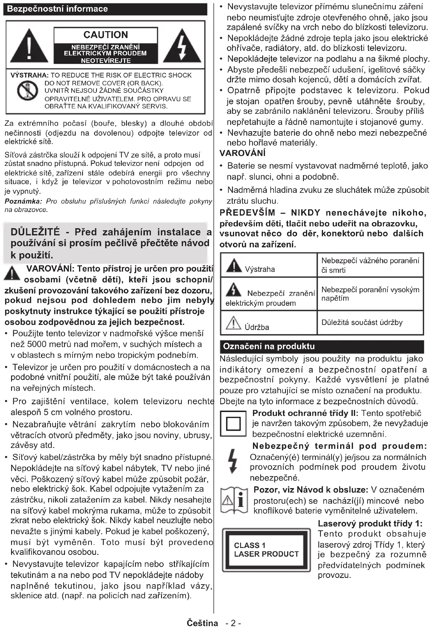 - Informace o funkcích DVB Čeština - 2 - Bezpečnostní informace CAUTION NEBEZPEČÍ ZRANĚNÍ ELEKTRICKÝM PROUDEMNEOTEVÍREJTEVÝSTRAHA: TO REDUCE THE RISK OF ELECTRIC SHOCK DO NOT REMOVE COVER (OR BACK). UVNITŘ NEJSOU ŽÁDNÉ SOUČÁSTKY OPRAVITELNÉ UŽIVATELEM. PRO OPRAVU SE OBRAŤTE NA KVALIFIKOVANÝ SERVIS.Poznámka: Pro obsluhu příslušných funkcí následujte pokyny na obrazovce. Za extrémního počasí (bouře, blesky) a dlouhé období nečinnosti (odjezdu na dovolenou) odpojte televizor od elektrické sítě. Síťová zástrčka slouží k odpojení TV ze sítě, a proto musí zůstat snadno přístupná. Pokud televizor není odpojen od elektrické sítě, zařízení stále odebírá energii pro všechny situace, i když je televizor v pohotovostním režimu nebo je vypnutý. DŮLEŽITÉ - Před zahájením instalace a používání si prosím pečlivě přečtěte návod k použití. VAROVÁNÍ: Tento přístroj je určen pro použití osobami (včetně dětí), kteří jsou schopni/ zkušení provozování takového zařízení bez dozoru, pokud nejsou pod dohledem nebo jim nebyly poskytnuty instrukce týkající se použití přístroje osobou zodpovědnou za jejich bezpečnost. p. 39