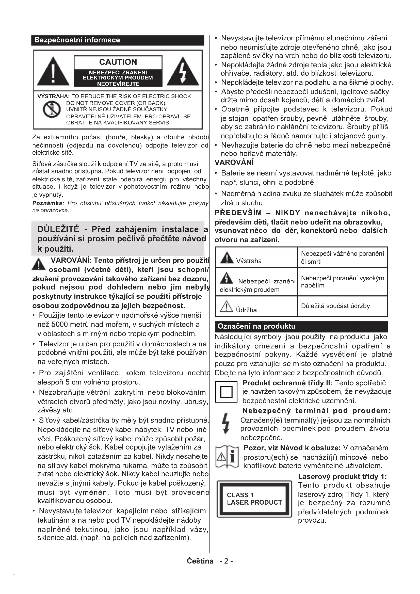 - Informace o funkcích DVB Čeština - 2 - Bezpečnostní informace CAUTION NEBEZPEČÍ ZRANĚNÍ ELEKTRICKÝM PROUDEMNEOTEVÍREJTEVÝSTRAHA: TO REDUCE THE RISK OF ELECTRIC SHOCK DO NOT REMOVE COVER (OR BACK). UVNITŘ NEJSOU ŽÁDNÉ SOUČÁSTKY OPRAVITELNÉ UŽIVATELEM. PRO OPRAVU SE OBRAŤTE NA KVALIFIKOVANÝ SERVIS.Poznámka: Pro obsluhu příslušných funkcí následujte pokyny na obrazovce. Za extrémního počasí (bouře, blesky) a dlouhé období nečinnosti (odjezdu na dovolenou) odpojte televizor od elektrické sítě. Síťová zástrčka slouží k odpojení TV ze sítě, a proto musí zůstat snadno přístupná. Pokud televizor není odpojen od elektrické sítě, zařízení stále odebírá energii pro všechny situace, i když je televizor v pohotovostním režimu nebo je vypnutý. DŮLEŽITÉ - Před zahájením instalace a používání si prosím pečlivě přečtěte návod k použití. VAROVÁNÍ: Tento přístroj je určen pro použití osobami (včetně dětí), kteří jsou schopni/ zkušení provozování takového zařízení bez dozoru, pokud nejsou pod dohledem nebo jim nebyly poskytnuty instrukce týkající se použití přístroje osobou zodpovědnou za jejich bezpečnost. p. 39