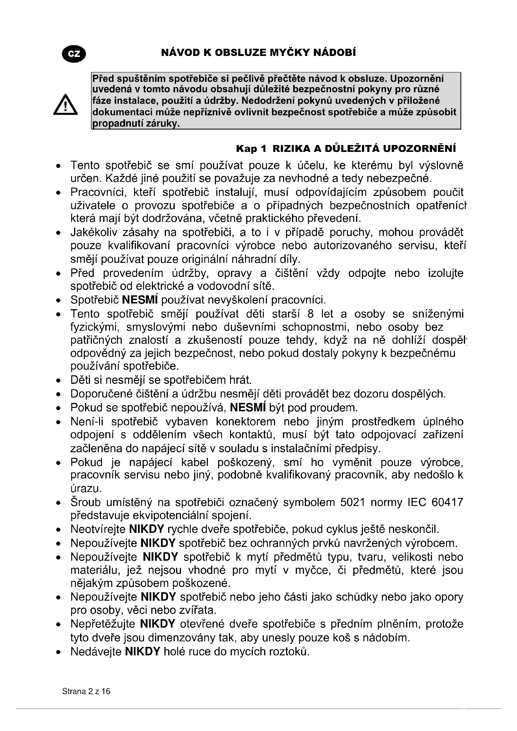 Před spuštěním spotřebiče si pečlivě přečtěte návod k obsluze. Upozornění uvedená v tomto návodu obsahují důležité bezpečnostní pokyny pro různé fáze instalace, použití a údržby. Nedodržení pokynů uvedených v přiložené dokumentaci může nepříznivě ovlivnit bezpečnost spotřebiče a může způsobit propadnutí záruky. Kap 1 RIZIKA A DŮLEŽITÁ UPOZORNĚNÍ Tento spotřebič se smí používat pouze k účelu, ke kterému byl výslovně určen. Každé jiné použití se považuje za nevhodné a tedy nebezpečné. Pracovníci, kteří spotřebič instalují, musí odpovídajícím způsobem poučit uživatele o provozu spotřebiče a o případných bezpečnostních opatřeních, která mají být dodržována, včetně praktického převedení. Jakékoliv zásahy na spotřebiči, a to i v případě poruchy, mohou provádět pouze kvalifikovaní pracovníci výrobce nebo autorizovaného servisu, kteří smějí používat pouze originální náhradní díly. Před provedením údržby, opravy a čištění vždy odpojte nebo izolujte spotřebič od elektrické a vodovodní sítě. Spotřebič NESMÍ používat nevyškolení pracovníci. Tento spotřebič smějí používat děti starší 8 let a osoby se sníženými fyzickými, smyslovými nebo duševními schopnostmi, nebo osoby bez patřičných znalostí a zkušeností pouze tehdy, když na ně dohlíží dospělý odpovědný za jejich bezpečnost, nebo pokud dostaly pokyny k bezpečnému používání spotřebiče. Děti si nesmějí se spotřebičem hrát. Doporučené čištění a údržbu nesmějí děti provádět bez dozoru dospělých. Pokud se spotřebič nepoužívá, NESMÍ být pod proudem. Není-li spotřebič vybaven konektorem nebo jiným prostředkem úplného odpojení s oddělením všech kontaktů, musí být tato odpojovací zařízení začleněna do napájecí sítě v souladu s instalačními předpisy. Pokud je napájecí kabel poškozený, smí ho vyměnit pouze výrobce, pracovník servisu nebo jiný, podobně kvalifikovaný pracovník, aby nedošlo k úrazu. Šroub umístěný na spotřebiči označený symbolem 5021 normy IEC 60417 představuje ekvipotenciální spojení. Neotvírejte NIKDY rychle dveře spotřebiče, pokud cyklus ještě neskončil. Nepoužívejte NIKDY spotřebič bez ochranných prvků navržených výrobcem. Nepoužívejte NIKDY spotřebič k mytí předmětů typu, tvaru, velikosti nebo materiálu, jež nejsou vhodné pro mytí v myčce, či předmětů, které jsou nějakým způsobem poškozené. Nepoužívejte NIKDY spotřebič nebo jeho části jako schůdky nebo jako opory pro osoby, věci nebo zvířata. Nepřetěžujte NIKDY otevřené dveře spotřebiče s předním plněním, protože tyto dveře jsou dimenzovány tak, aby unesly pouze koš s nádobím. Nedávejte NIKDY holé ruce do mycích roztoků.NÁVOD K OBSLUZE MYČKY NÁDOBÍ Strana 3 z 16