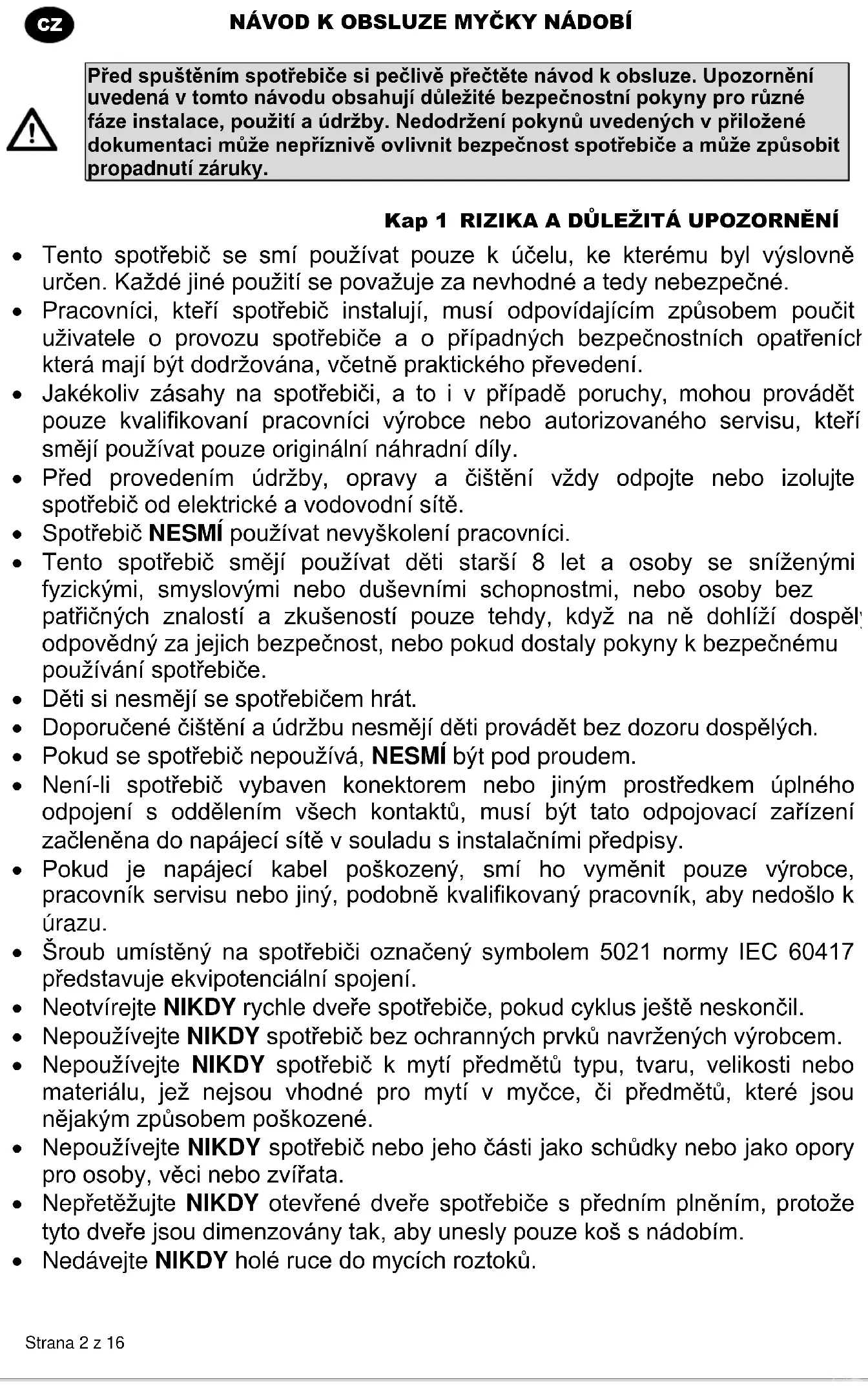 Před spuštěním spotřebiče si pečlivě přečtěte návod k obsluze. Upozornění uvedená v tomto návodu obsahují důležité bezpečnostní pokyny pro různé fáze instalace, použití a údržby. Nedodržení pokynů uvedených v přiložené dokumentaci může nepříznivě ovlivnit bezpečnost spotřebiče a může způsobit propadnutí záruky. Kap 1 RIZIKA A DŮLEŽITÁ UPOZORNĚNÍ Tento spotřebič se smí používat pouze k účelu, ke kterému byl výslovně určen. Každé jiné použití se považuje za nevhodné a tedy nebezpečné. Pracovníci, kteří spotřebič instalují, musí odpovídajícím způsobem poučit uživatele o provozu spotřebiče a o případných bezpečnostních opatřeních, která mají být dodržována, včetně praktického převedení. Jakékoliv zásahy na spotřebiči, a to i v případě poruchy, mohou provádět pouze kvalifikovaní pracovníci výrobce nebo autorizovaného servisu, kteří smějí používat pouze originální náhradní díly. Před provedením údržby, opravy a čištění vždy odpojte nebo izolujte spotřebič od elektrické a vodovodní sítě. Spotřebič NESMÍ používat nevyškolení pracovníci. Tento spotřebič smějí používat děti starší 8 let a osoby se sníženými fyzickými, smyslovými nebo duševními schopnostmi, nebo osoby bez patřičných znalostí a zkušeností pouze tehdy, když na ně dohlíží dospělý odpovědný za jejich bezpečnost, nebo pokud dostaly pokyny k bezpečnému používání spotřebiče. Děti si nesmějí se spotřebičem hrát. Doporučené čištění a údržbu nesmějí děti provádět bez dozoru dospělých. Pokud se spotřebič nepoužívá, NESMÍ být pod proudem. Není-li spotřebič vybaven konektorem nebo jiným prostředkem úplného odpojení s oddělením všech kontaktů, musí být tato odpojovací zařízení začleněna do napájecí sítě v souladu s instalačními předpisy. Pokud je napájecí kabel poškozený, smí ho vyměnit pouze výrobce, pracovník servisu nebo jiný, podobně kvalifikovaný pracovník, aby nedošlo k úrazu. Šroub umístěný na spotřebiči označený symbolem 5021 normy IEC 60417 představuje ekvipotenciální spojení. Neotvírejte NIKDY rychle dveře spotřebiče, pokud cyklus ještě neskončil. Nepoužívejte NIKDY spotřebič bez ochranných prvků navržených výrobcem. Nepoužívejte NIKDY spotřebič k mytí předmětů typu, tvaru, velikosti nebo materiálu, jež nejsou vhodné pro mytí v myčce, či předmětů, které jsou nějakým způsobem poškozené. Nepoužívejte NIKDY spotřebič nebo jeho části jako schůdky nebo jako opory pro osoby, věci nebo zvířata. Nepřetěžujte NIKDY otevřené dveře spotřebiče s předním plněním, protože tyto dveře jsou dimenzovány tak, aby unesly pouze koš s nádobím. Nedávejte NIKDY holé ruce do mycích roztoků.NÁVOD K OBSLUZE MYČKY NÁDOBÍ Strana 3 z 16