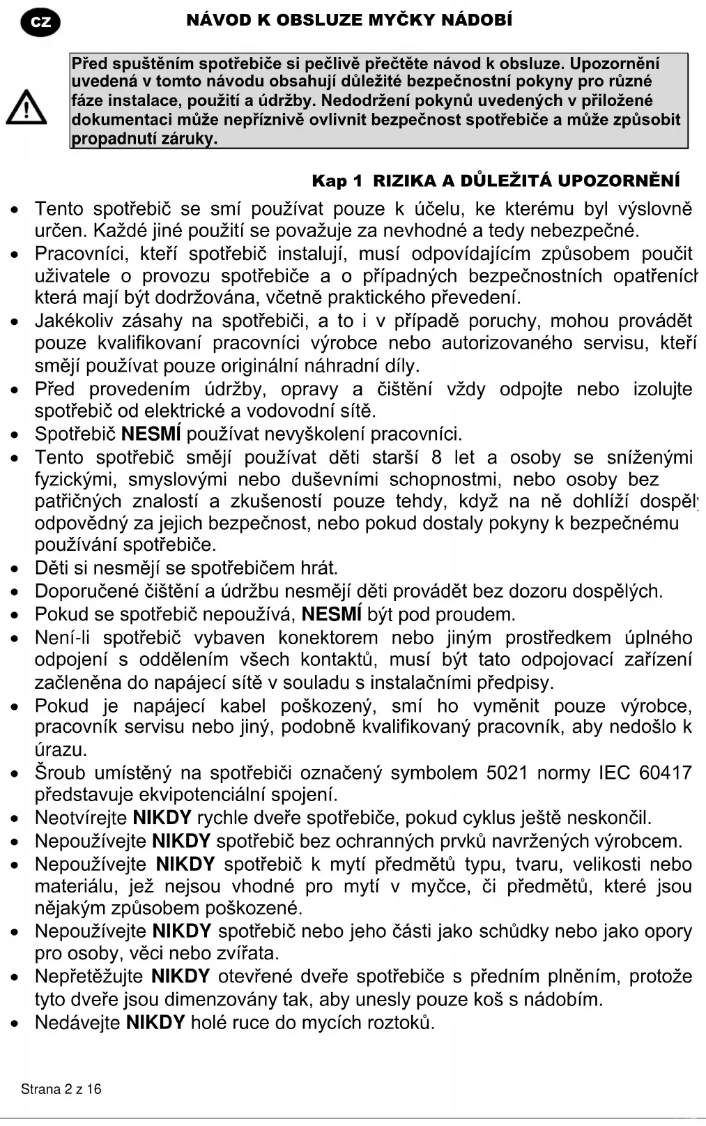 Před spuštěním spotřebiče si pečlivě přečtěte návod k obsluze. Upozornění uvedená v tomto návodu obsahují důležité bezpečnostní pokyny pro různé fáze instalace, použití a údržby. Nedodržení pokynů uvedených v přiložené dokumentaci může nepříznivě ovlivnit bezpečnost spotřebiče a může způsobit propadnutí záruky. Kap 1 RIZIKA A DŮLEŽITÁ UPOZORNĚNÍ Tento spotřebič se smí používat pouze k účelu, ke kterému byl výslovně určen. Každé jiné použití se považuje za nevhodné a tedy nebezpečné. Pracovníci, kteří spotřebič instalují, musí odpovídajícím způsobem poučit uživatele o provozu spotřebiče a o případných bezpečnostních opatřeních, která mají být dodržována, včetně praktického převedení. Jakékoliv zásahy na spotřebiči, a to i v případě poruchy, mohou provádět pouze kvalifikovaní pracovníci výrobce nebo autorizovaného servisu, kteří smějí používat pouze originální náhradní díly. Před provedením údržby, opravy a čištění vždy odpojte nebo izolujte spotřebič od elektrické a vodovodní sítě. Spotřebič NESMÍ používat nevyškolení pracovníci. Tento spotřebič smějí používat děti starší 8 let a osoby se sníženými fyzickými, smyslovými nebo duševními schopnostmi, nebo osoby bez patřičných znalostí a zkušeností pouze tehdy, když na ně dohlíží dospělý odpovědný za jejich bezpečnost, nebo pokud dostaly pokyny k bezpečnému používání spotřebiče. Děti si nesmějí se spotřebičem hrát. Doporučené čištění a údržbu nesmějí děti provádět bez dozoru dospělých. Pokud se spotřebič nepoužívá, NESMÍ být pod proudem. Není-li spotřebič vybaven konektorem nebo jiným prostředkem úplného odpojení s oddělením všech kontaktů, musí být tato odpojovací zařízení začleněna do napájecí sítě v souladu s instalačními předpisy. Pokud je napájecí kabel poškozený, smí ho vyměnit pouze výrobce, pracovník servisu nebo jiný, podobně kvalifikovaný pracovník, aby nedošlo k úrazu. Šroub umístěný na spotřebiči označený symbolem 5021 normy IEC 60417 představuje ekvipotenciální spojení. Neotvírejte NIKDY rychle dveře spotřebiče, pokud cyklus ještě neskončil. Nepoužívejte NIKDY spotřebič bez ochranných prvků navržených výrobcem. Nepoužívejte NIKDY spotřebič k mytí předmětů typu, tvaru, velikosti nebo materiálu, jež nejsou vhodné pro mytí v myčce, či předmětů, které jsou nějakým způsobem poškozené. Nepoužívejte NIKDY spotřebič nebo jeho části jako schůdky nebo jako opory pro osoby, věci nebo zvířata. Nepřetěžujte NIKDY otevřené dveře spotřebiče s předním plněním, protože tyto dveře jsou dimenzovány tak, aby unesly pouze koš s nádobím. Nedávejte NIKDY holé ruce do mycích roztoků.NÁVOD K OBSLUZE MYČKY NÁDOBÍ Strana 3 z 16