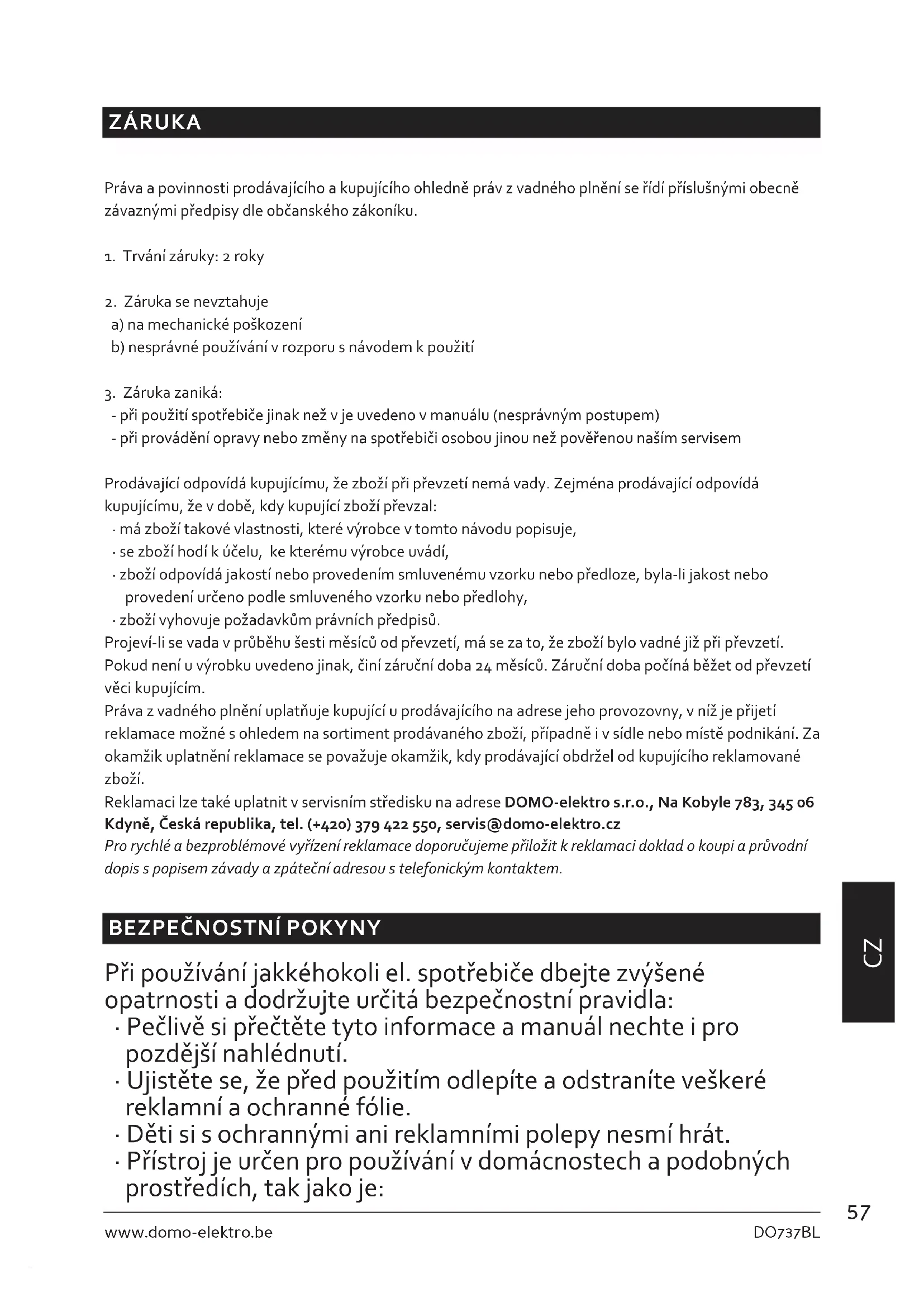 - zboží vyhovuje požadavkům právních předpisů. Projeví-li se vada v průběhu šesti měsíců od převzetí, má se za to, že zboží bylo vadné již při převzetí. Pokud není u výrobku uvedeno jinak, činí záruční doba 24 měsíců. Záruční doba počíná běžet od převzetí věci kupujícím. Práva z vadného plnění uplatňuje kupující u prodávajícího na adrese jeho provozovny, v níž je přijetí reklamace možné s ohledem na sortiment prodávaného zboží, případně i v sídle nebo místě podnikání. Za okamžik uplatnění reklamace se považuje okamžik, kdy prodávající obdržel od kupujícího reklamované zboží. Reklamaci lze také uplatnit v servisním středisku na adrese DOMO-elektro s.r.o., Na Kobyle 783, 345 06 Kdyně, Česká republika, tel. (+420) 379 422 550, servis@domo-elektro.cz Pro rychlé a bezproblémové vyřízení reklamace doporučujeme přiložit k reklamaci doklad o koupi a průvodní dopis s popisem závady a zpáteční adresou s telefonickým kontaktem.