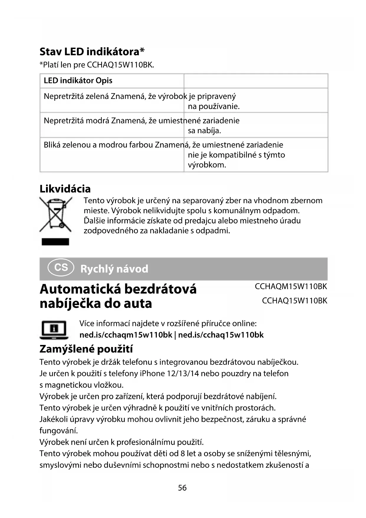 - Pouze umodelu CCHAQ15W110BK. LED ukazatel Popis Stálá zelená Značí, že výrobek je nyní připraven kpoužití. Stálá modrá Značí, že umístěné zařízení se nabíjí. Bliká zeleně amodře Značí, že umístěné zařízení není svýrobkem kompatibilní. Likvidace Likvidaci tohoto produktu provádějte v příslušné sběrně. Nevyhazujte tento výrobek s komunálním odpadem. Pro více informací se obraťte na prodejce nebo místní orgány odpovědné za nakládání s odpady.60