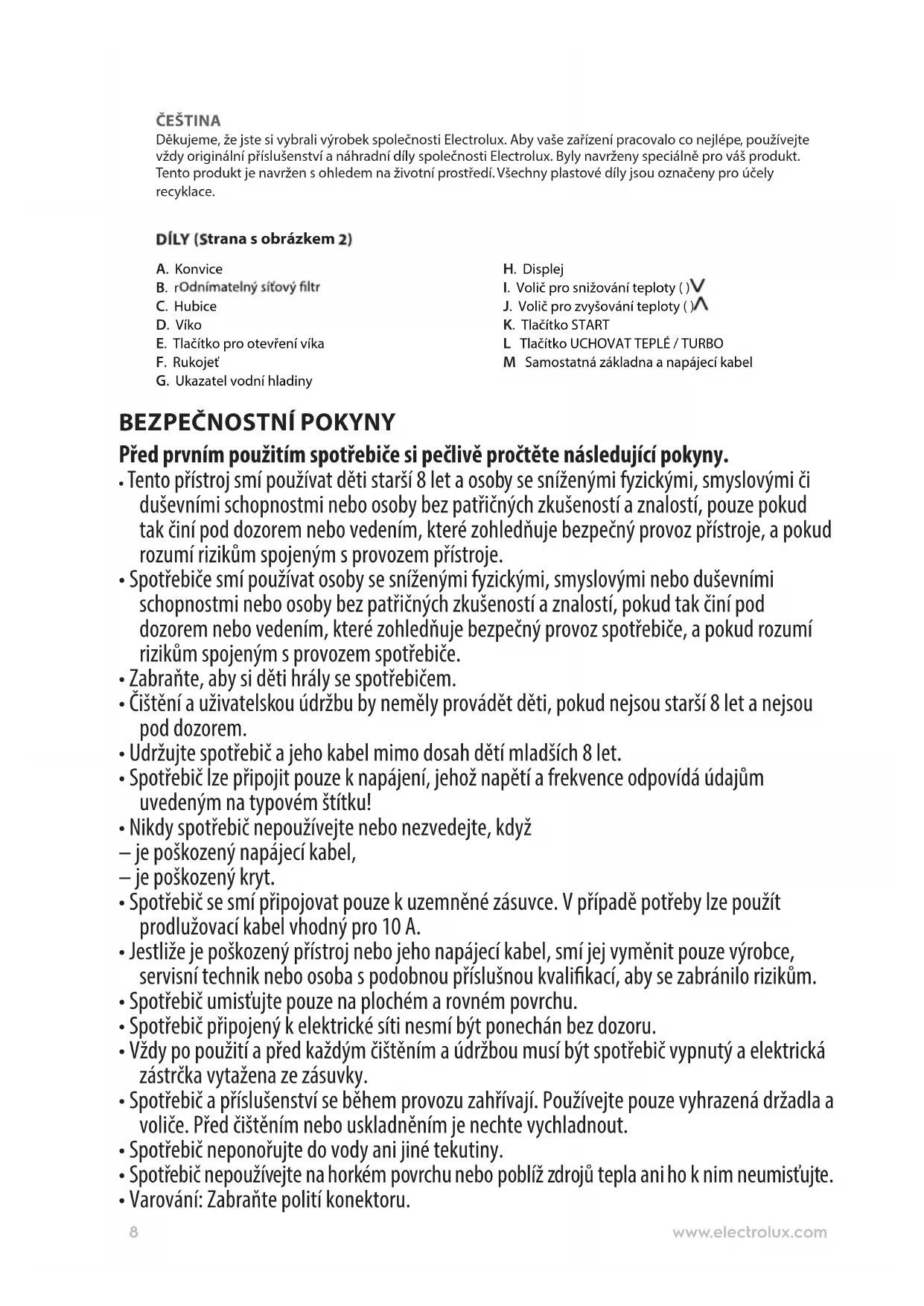 Reciklirajte materijale sa simbolom . Ambalažu za recikliranje odložite u prikladne spremnike. Pomozite u zaštiti okoliša i ljudskog zdravlja, kao i u recikliranju otpada od električnih i elektroničkih uređaja. Uređaje označene simbolom ne bacajte zajedno s kućnim otpadom. Proizvod odnesite na lokalno reciklažno mjesto ili kontaktirajte nadležnu službu. BRIGA ZA OKOLIŠ8 www.electrolux.com ČEŠTINA Děkujeme, že jste si vybrali výrobek společnosti Electrolux. Aby vaše zařízení pracovalo co nejlépe, používejte vždy originální příslušenství a náhradní díly společnosti Electrolux. Byly navrženy speciálně pro váš produkt. Tento produkt je navržen s ohledem na životní prostředí. Všechny plastové díly jsou označeny pro účely recyklace. trana s obrázkem A. Konvice B. r C. Hubice D. Víko E. Tlačítko pro otevření víka F. Rukojeť G. Ukazatel vodní hladiny H. Displej