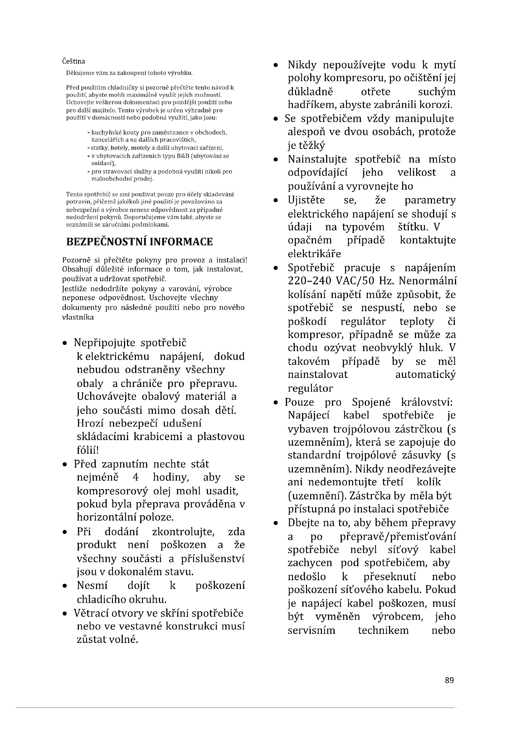- Spotřebič pracuje s napájením 220–240 VAC/50 Hz. Nenormální kolísání napětí může způsobit, že spotřebič se nespustí, nebo se poškodí regulátor teploty či kompresor, případně se může za chodu ozývat neobvyklý hluk. V takovém případě by se měl nainstalovat automatický regulátor