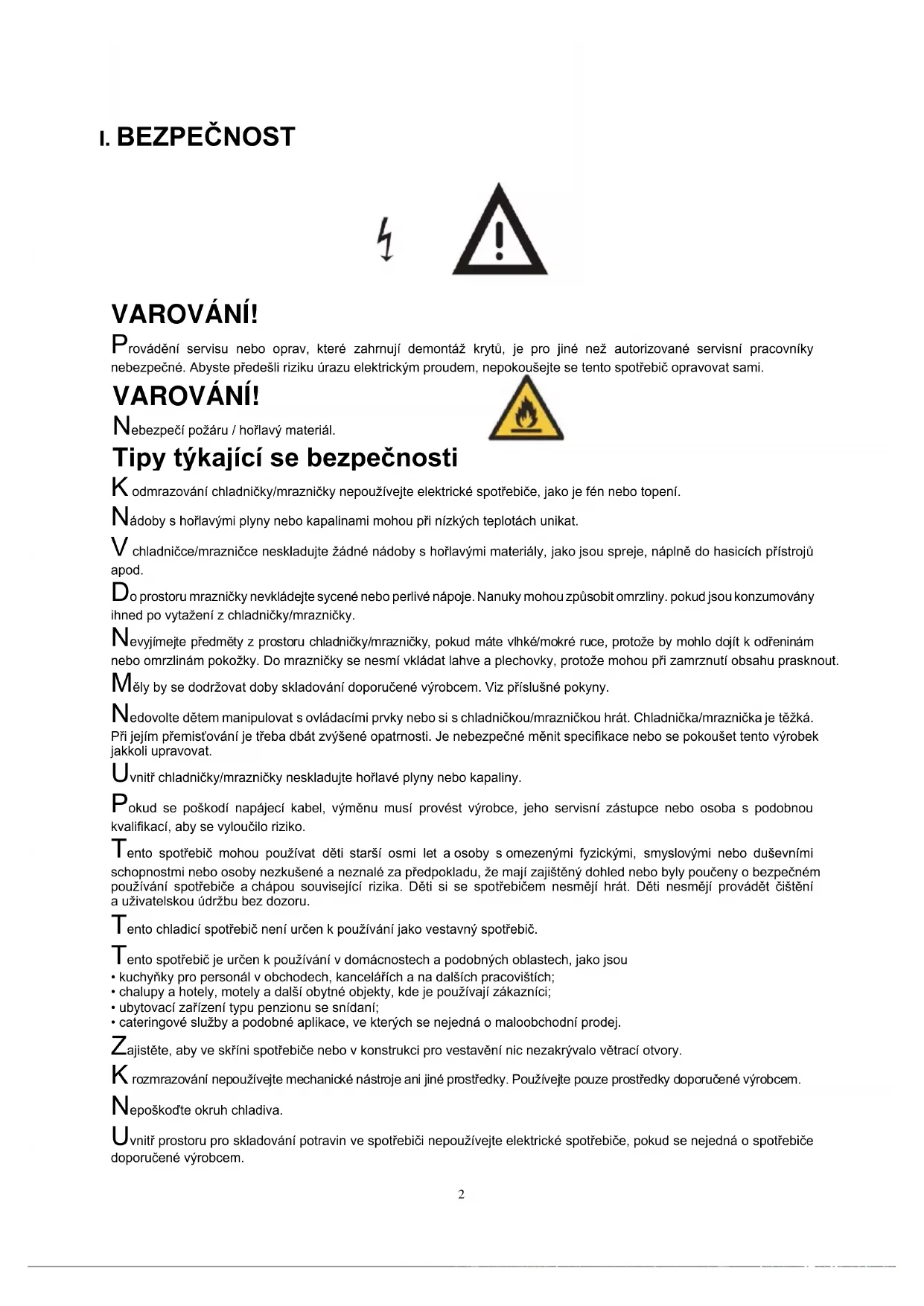 VAROVÁNÍ! Provádění servisu nebo oprav, které zahrnují demontáž krytů, je pro jiné než autorizované servisní pracovníky nebezpečné. Abyste předešli riziku úrazu elektrickým proudem, nepokoušejte se tento spotřebič opravovat sami. VAROVÁNÍ! Nebezpečí požáru / hořlavý materiál. Tipy týkající se bezpečnosti K odmrazování chladničky/mrazničky nepoužívejte elektrické spotřebiče, jako je fén nebo topení. Nádoby s hořlavými plyny nebo kapalinami mohou při nízkých teplotách unikat. V chladničce/mrazničce neskladujte žádné nádoby s hořlavými materiály, jako jsou spreje, náplně do hasicích přístrojů apod. Do prostoru mrazničky nevkládejte sycené nebo perlivé nápoje. Nanuky mohou způsobit omrzliny. pokud jsou konzumovány ihned po vytažení z chladničky/mrazničky. Nevyjímejte předměty z prostoru chladničky/mrazničky, pokud máte vlhké/mokré ruce, protože by mohlo dojít k odřeninám nebo omrzlinám pokožky. Do mrazničky se nesmí vkládat lahve a plechovky, protože mohou při zamrznutí obsahu prasknout. Měly by se dodržovat doby skladování doporučené výrobcem. Viz příslušné pokyny. Nedovolte dětem manipulovat s ovládacími prvky nebo si s chladničkou/mrazničkou hrát. Chladnička/mraznička je těžká. Při jejím přemisťování je třeba dbát zvýšené opatrnosti. Je nebezpečné měnit specifikace nebo se pokoušet tento výrobek jakkoli upravovat. Uvnitř chladničky/mrazničky neskladujte hořlavé plyny nebo kapaliny. Pokud se poškodí napájecí kabel, výměnu musí provést výrobce, jeho servisní zástupce nebo osoba s podobnou kvalifikací, aby se vyloučilo riziko. Tento spotřebič mohou používat děti starší osmi let a osoby s omezenými fyzickými, smyslovými nebo duševními schopnostmi nebo osoby nezkušené a neznalé za předpokladu, že mají zajištěný dohled nebo byly poučeny o bezpečném používání spotřebiče a chápou související rizika. Děti si se spotřebičem nesmějí hrát. Děti nesmějí provádět čištění a uživatelskou údržbu bez dozoru. Tento chladicí spotřebič není určen k používání jako vestavný spotřebič. Tento spotřebič je určen k používání v domácnostech a podobných oblastech, jako jsou