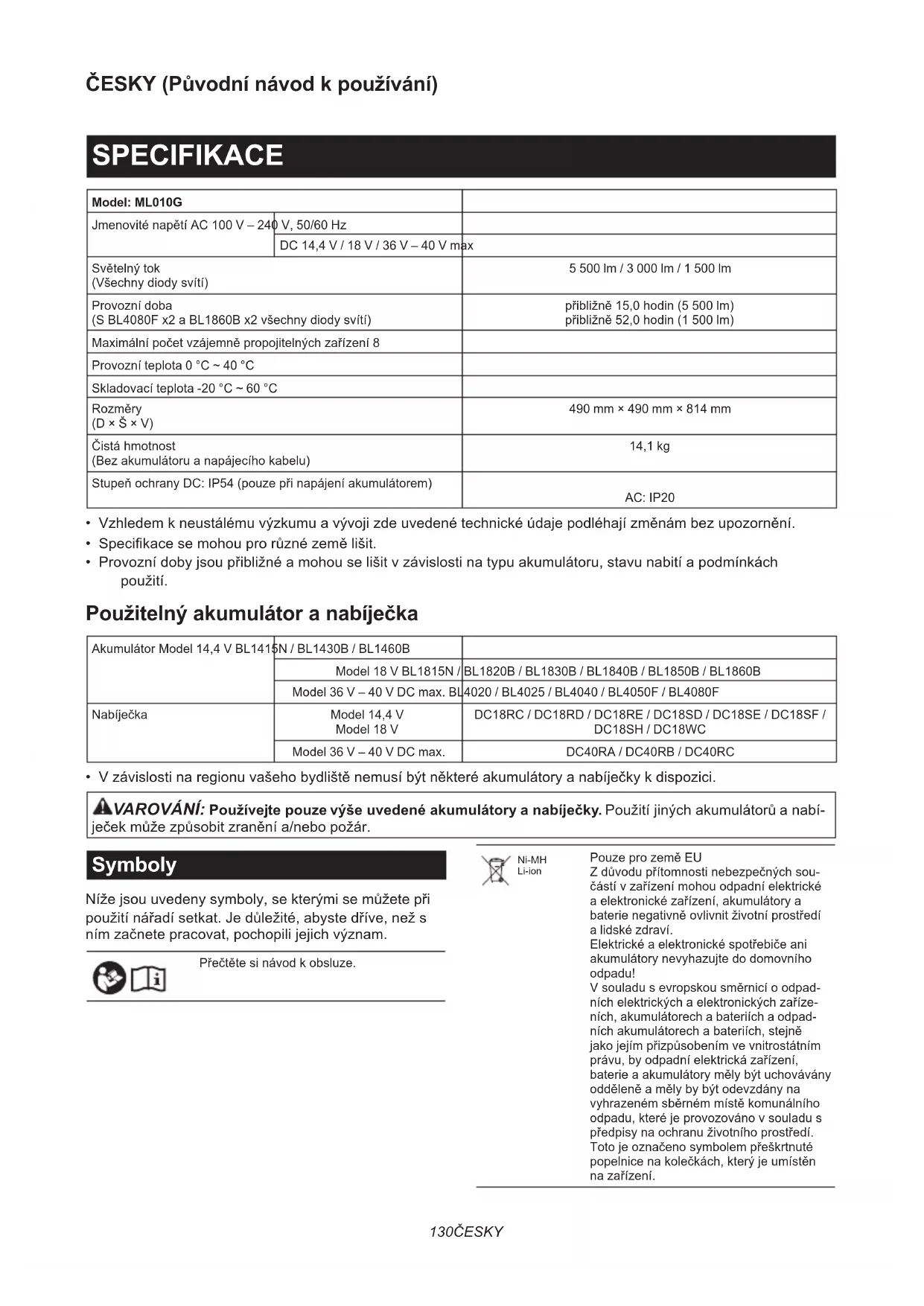 - Originálna batéria a nabíjačka Makita POZNÁMKA: Niektoré položky zo zoznamu môžu byť súčasťou balenia nástrojov vo forme štandardného príslušenstva. Rozsah týchto položiek môže byť v každej krajine odlišný.130 ČESKY ČESKY (Původní návod k používání) SPECIFIKACE Model: ML010G Jmenovité napětí AC 100 V – 240 V, 50/60 Hz DC 14,4 V / 18 V / 36 V – 40 V max Světelný tok (Všechny diody svítí) 5 500 lm / 3 000 lm / 1 500 lm Provozní doba (S BL4080F x2 a BL1860B x2 všechny diody svítí) přibližně 15,0 hodin (5 500 lm) přibližně 52,0 hodin (1 500 lm) Maximální počet vzájemně propojitelných zařízení 8 Provozní teplota 0 °C ~ 40 °C Skladovací teplota -20 °C ~ 60 °C Rozměry (D × Š × V) 490 mm × 490 mm × 814 mm Čistá hmotnost (Bez akumulátoru a napájecího kabelu) 14,1 kg Stupeň ochrany DC: IP54 (pouze při napájení akumulátorem) AC: IP20