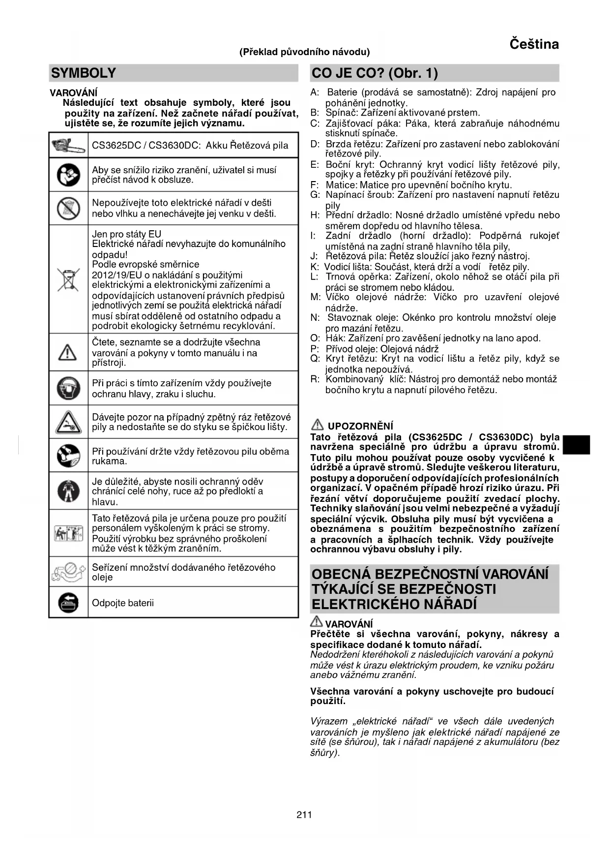 - rozsdás Élezze meg a fűrészláncot. Ha a kopás vagy a törés nagyon súlyos, akkor cserélje ki a láncot. A fűrészlánc forgásiránya fordított. Szerelje fel újra megfelelő forgásirányban. A fűrészlánc túl laza. Ellenőrizze a fűrészlánc feszességét, és ha túl laza, feszítse meg. Láncolaj ○ lassan áramlik ○ nem jön ki (beragad) Kevés az olaj az olajtartályban. Töltsön be láncolajat. A láncolaj cső eltömődött. Tisztítsa meg a láncolaj csövet. Az akkumulátort nem lehet behelyezni Az eszközhöz meghatározott típusú akkumulátortól eltérő típusú akkumulátor behelyezése. Szabályozható feszültség ű akkumulátort helyezzen be. 00BookCS3625DCEU.indb21000BookCS3625DCEU.indb210 2022/12/0816:29:552022/12/0816:29:55211 Čeština SYMBOLY VAROVÁNÍ Následující text obsahuje symboly, které jsou použity na zařízení. Než začnete nářadí používat, ujistěte se, že rozumíte jejich významu. CS3625DC / CS3630DC: Akku Řetězová pila Aby se snížilo riziko zranění, uživatel si musí přečíst návod k obsluze. Nepoužívejte toto elektrické nářadí v dešti nebo vlhku a nenechávejte jej venku v dešti. Jen pro státy EU Elektrické nářadí nevyhazujte do komunálního odpadu! Podle evropské směrnice 2012/19/EU o nakládání s použitými elektrickými a elektronickými zařízeními a odpovídajících ustanovení právních předpisů jednotlivých zemí se použitá elektrická nářadí musí sbírat odděleně od ostatního odpadu a podrobit ekologicky šetrnému recyklování. Čtete, seznamte se a dodržujte všechna varování a pokyny v tomto manuálu i na přístroji. Při práci s tímto zařízením vždy používejte ochranu hlavy, zraku i sluchu. Dávejte pozor na případný zpětný ráz řetězové pily a nedostaňte se do styku se špičkou lišty. Při používání držte vždy řetězovou pilu oběma rukama. Je důležité, abyste nosili ochranný oděv chránící celé nohy, ruce až po předloktí a hlavu. Tato řetězová pila je určena pouze pro použití personálem vyškoleným k práci se stromy. Použití výrobku bez správného proškolení může vést k těžkým zraněním. Seřízení množství dodávaného řetězového oleje Odpojte baterii CO JE CO? (Obr. 1) A: Baterie (prodává se samostatně): Zdroj napájení pro pohánění jednotky. B: Spínač: Zařízení aktivované prstem. C: Zajišťovací páka: Páka, která zabraňuje náhodnému stisknutí spínače. D: Brzda řetězu: Zařízení pro zastavení nebo zablokování řetězové pily. E: Boční kryt: Ochranný kryt vodicí lišty řetězové pily, spojky a řetězky při používání řetězové pily. F: Matice: Matice pro upevnění bočního krytu. G: Napínací šroub: Zařízení pro nastavení napnutí řetězu pily H: Přední držadlo: Nosné držadlo umístěné vpředu nebo směrem dopředu od hlavního tělesa. I: Zadní držadlo (horní držadlo): Podpěrná rukojeť umístěná na zadní straně hlavního těla pily, J: Řetězová pila: Řetěz sloužící jako řezný nástroj. K: Vodicí lišta: Součást, která drží a vodí řetěz pily. L: Trnová opěrka: Zařízení, okolo něhož se otáčí pila při práci se stromem nebo kládou. M: Víčko olejové nádrže: Víčko pro uzavření olejové nádrže. N: Stavoznak oleje: Okénko pro kontrolu množství oleje pro mazání řetězu. O: Hák: Zařízení pro zavěšení jednotky na lano apod. P: Přívod oleje: Olejová nádrž Q: Kryt řetězu: Kryt na vodicí lištu a řetěz pily, když se jednotka nepoužívá. R: Kombinovaný klíč: Nástroj pro demontáž nebo montáž bočního krytu a napnutí pilového řetězu. UPOZORNĚNÍ Tato řetězová pila (CS3625DC / CS3630DC) byla navržena speciálně pro údržbu a úpravu stromů. Tuto pilu mohou používat pouze osoby vycvičené k údržbě a úpravě stromů. Sledujte veškerou literaturu, postupy a doporučení odpovídajících profesionálních organizací. V opačném případě hrozí riziko úrazu. Při řezání větví doporučujeme použití zvedací plochy. Techniky slaňování jsou velmi nebezpečné a vyžadují speciální výcvik. Obsluha pily musí být vycvičena a obeznámena s použitím bezpečnostního zařízení a pracovních a šplhacích technik. Vždy používejte ochrannou výbavu obsluhy i pily.