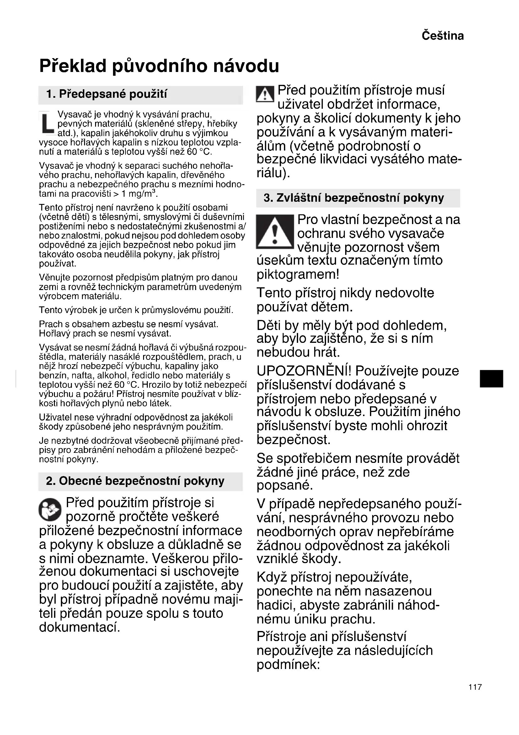 Csak EU-országok számára Az elektromos szerszámokat ne dobja a háztartási szemétbe! Az elektromos és elektronikus berendezések hulladékairól szóló 2012/19/EU irányelv és annak a nemzeti jogba való átültetése szerint az elhasznált elektromos szerszámokat külön kell gyűjteni, és egy környezetbarát újrafeldolgozó létesítménybe kell visszavinni. GARANCIA A HiKOKI Power Tools szerszámokra a törvény által előírt országos előírásoknak megfelelő garanciát vállalunk. A garancia nem vonatkozik a helytelen vagy nem rendeltetésszerű használatból, továbbá a normál mértékűnek számító elhasználódásból, kopásból származó meghibásodásokra, károkra. Reklamáció esetén kérjük, küldje el a – nem szétszerelt – szerszámot a kezelési útmutató végén található GARANCIA BIZONYLATTAL együtt a hivatalos HiKOKI szervizközpontba. A környezeti zajra vonatkozó információk A mért értékek az EN60335-2-69 szabványnak megfelelően kerültek meghatározásra és az ISO 4871 alapján kerülnek közzétételre. Mért A-hangnyomásszint: 69 dB (A) Bizonytalanság K: 2 dB (A). Viseljen hallásvédő eszközt. Munka közben a zajszint meghaladhatja a 80 dB(A) értéket. MEGJEGYZÉS A HiKOKI folyamatos kutatási és fejlesztési programja következtében az itt szereplő műszaki adatok előzetes bejelentés nélkül változhatnak. RP350YBL_C99749971_305.book 116 ページ 2023年4月6日 木曜日 午後1時6分117 Čeština Překlad původního návodu Vysavač je vhodný k vysávání prachu, pevných materiálů (skleněné střepy, hřebíky atd.), kapalin jakéhokoliv druhu s výjimkou vysoce hořlavých kapalin s nízkou teplotou vzpla- nutí a materiálů s teplotou vyšší než 60 °C. Vysavač je vhodný k separaci suchého nehořla- vého prachu, nehořlavých kapalin, dřevěného prachu a nebezpečného prachu s mezními hodno- tami na pracovišti > 1 mg/m³. Tento přístroj není navrženo k použití osobami (včetně dětí) s tělesnými, smyslovými či duševními postiženími nebo s nedostatečnými zkušenostmi a/ nebo znalostmi, pokud nejsou pod dohledem osoby odpovědné za jejich bezpečnost nebo pokud jim takováto osoba neudělila pokyny, jak přístroj používat. Věnujte pozornost předpisům platným pro danou zemi a rovněž technickým parametrům uvedeným výrobcem materiálu. Tento výrobek je určen k průmyslovému použití. Prach s obsahem azbestu se nesmí vysávat. Hořlavý prach se nesmí vysávat. Vysávat se nesmí žádná hořlavá či výbušná rozpou- štědla, materiály nasáklé rozpouštědlem, prach, u nějž hrozí nebezpečí výbuchu, kapaliny jako benzín, nafta, alkohol, ředidlo nebo materiály s teplotou vyšší než 60 °C. Hrozilo by totiž nebezpečí výbuchu a požáru! Přístroj nesmíte používat v blíz- kosti hořlavých plynů nebo látek. Uživatel nese výhradní odpovědnost za jakékoli škody způsobené jeho nesprávným použitím. Je nezbytné dodržovat všeobecně přijímané před- pisy pro zabránění nehodám a přiložené bezpeč- nostní pokyny. Před použitím přístroje si pozorně pročtěte veškeré přiložené bezpečnostní informace a pokyny k obsluze a důkladně se s nimi obeznamte. Veškerou přilo- ženou dokumentaci si uschovejte pro budoucí použití a zajistěte, aby byl přístroj případně novému maji- teli předán pouze spolu s touto dokumentací. Před použitím přístroje musí uživatel obdržet informace, pokyny a školicí dokumenty k jeho používání a k vysávaným materi- álům (včetně podrobností o bezpečné likvidaci vysátého mate- riálu). Pro vlastní bezpečnost a na ochranu svého vysavače věnujte pozornost všem úsekům textu označeným tímto piktogramem! Tento přístroj nikdy nedovolte používat dětem. Děti by měly být pod dohledem, aby bylo zajištěno, že si s ním nebudou hrát. UPOZORNĚNÍ! Používejte pouze příslušenství dodávané s přístrojem nebo předepsané v návodu k obsluze. Použitím jiného