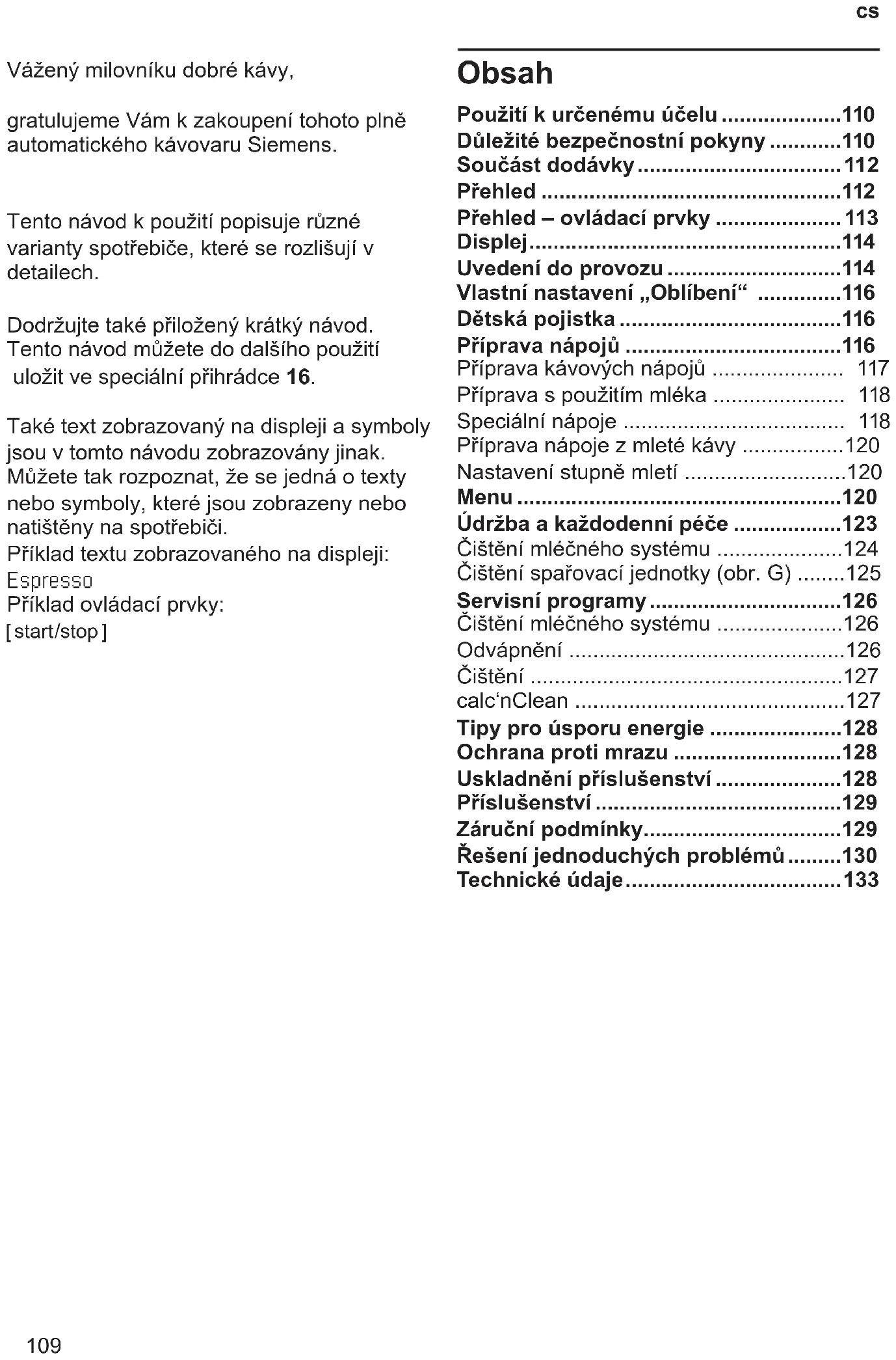 Obsah Váženýmilovníkudobrékávy, gratulujemeVámkzakoupenítohotoplně automatickéhokávovaruSiemens. Tentonávodkpoužitípopisujerůzné variantyspotřebiče,kteréserozlišujív detailech. Dodržujtetaképřiloženýkrátkýnávod. Tentonávodmůžetedodalšíhopoužití uložitvespeciálnípřihrádce16. Takétextzobrazovanýnadisplejiasymboly jsouvtomtonávoduzobrazoványjinak. Můžetetakrozpoznat,žesejednáotexty nebosymboly,kteréjsouzobrazenynebo natištěnynaspotřebiči. Příkladtextuzobrazovanéhonadispleji: Espresso Příkladovládacíprvky: