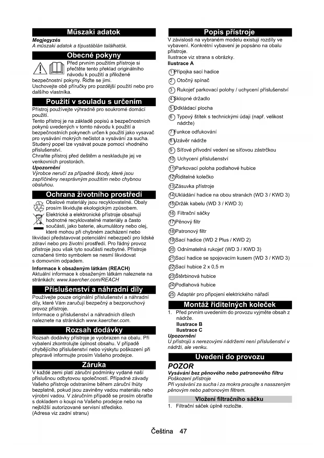 Ábra R Segítség üzemzavarok esetén Az üzemzavarok gyakran egyszerű okokra vezethetők vissza, amelyeket az alábbi áttekintés segítségével a kezelő maga is könnyen elháríthat. Kétség esetén vagy az itt meg nem nevezett üzemzavarok esetén, kérjük, forduljon a hivatalos ügyfélszolgálathoz. Csökkenő szívóteljesítmény A tartozékok, a szívótömlő vagy a szívócsövek eldugultak. Távolítsa el a dugulást megfelelő segédeszközzel. A porzsák tele van. Cserélje ki a porzsákot. A habosított anyag szűrő/patronszűrő szennyezett. Tisztítsa meg a habosított anyag szűrőt / patronszű- rőt (lásd a(z) A habosított anyag szűrő / patronszűrő tisztítása fejezetet). A habosított anyag szűrő / patronszűrő sérült. Cserélje ki a habosított anyag szűrőt / patronszűrőt.Čeština 47 Műszaki adatok Megjegyzés A műszaki adatok a típustáblán találhatók. Obecné pokyny Před prvním použitím přístroje si přečtěte tento překlad originálního návodu k použití a přiložené bezpečnostní pokyny. Řiďte se jimi. Uschovejte obě příručky pro pozdější použití nebo pro dalšího vlastníka. Použití v souladu s určením Přístroj používejte výhradně pro soukromé domácí použití. Tento přístroj je na základě popisů a bezpečnostních pokynů uvedených v tomto návodu k použití a bezpečnostních pokynech určen k použití jako vysavač pro vysávání mokrých nečistot a vysávání za sucha. Studený popel lze vysávat pouze pomocí vhodného příslušenství. Chraňte přístroj před deštěm a neskladujte jej ve venkovních prostorách. Upozornění Výrobce neručí za případné škody, které jsou zapříčiněny nesprávným použitím nebo chybnou obsluhou. Ochrana životního prostředí Obalové materiály jsou recyklovatelné. Obaly prosím likvidujte ekologickým způsobem. Elektrické a elektronické přístroje obsahují hodnotné recyklovatelné materiály a často součásti, jako baterie, akumulátory nebo olej, které mohou při chybném zacházení nebo likvidaci představovat potenciální nebezpečí pro lidské zdraví nebo pro životní prostředí. Pro řádný provoz přístroje jsou však tyto součásti nezbytné. Přístroje označené tímto symbolem se nesmí likvidovat s domovním odpadem. Informace k obsaženým látkám (REACH) Aktuální informace k obsaženým látkám naleznete na stránkách: www.kaercher.com/REACH Příslušenství a náhradní díly Používejte pouze originální příslušenství a náhradní díly, které Vám zaručují bezpečný a bezporuchový provoz přístroje. Informace o příslušenství a náhradních dílech naleznete na stránkách www.kaercher.com. Rozsah dodávky Rozsah dodávky přístroje je vyobrazen na obalu. Při vybalení zkontrolujte úplnost obsahu. V případě chybějícího příslušenství nebo výskytu poškození při přepravě informujte prosím Vašeho prodejce. Záruka V každé zemi platí záruční podmínky vydané naší příslušnou odbytovou společností. Případné závady Vašeho přístroje odstraníme během záruční lhůty bezplatně, pokud jsou zaviněny vadou materiálu nebo výrobní vadou. V záručním případě se prosím obraťte s dokladem o koupi na Vašeho prodejce nebo na nejbližší autorizované servisní středisko. (Adresa viz zadní stranu) Popis přístroje V závislosti na vybraném modelu existují rozdíly ve vybavení. Konkrétní vybavení je popsáno na obalu přístroje. Ilustrace viz strana s obrázky. Ilustrace A 1 Přípojka sací hadice 2 Otočný spínač 3 Rukojeť parkovací polohy / uchycení příslušenství 4 Sklopné držadlo 5 Odkládací plocha 6 Typový štítek s technickými údaji (např. velikost nádrže) 7 Funkce odfukování 8 Uzávěr nádrže 9 Síťové přívodní vedení se síťovou zástrčkou 10 Uchycení příslušenství 11 Parkovací poloha podlahové hubice 12 Řiditelné kolečko 13 Zásuvka přístroje 14 Ukládání hadice na obou stranách (WD 3 / KWD 3) 15 Držák kabelu (WD 3 / KWD 3) 16 Filtrační sáčky 17 Pěnový filtr 18 Patronový filtr 19 Sací hadice (WD 2 Plus / KWD 2) 20 Odnímatelná rukojeť (WD 3 / KWD 3) 21 Sací hadice se spojovacím kusem (WD 3 / KWD 3) 22 Sací hubice 2 x 0,5 m 23 Štěrbinová hubice 24 Podlahová hubice 25 Adaptér pro připojení elektrického nářadí Montáž řiditelných koleček