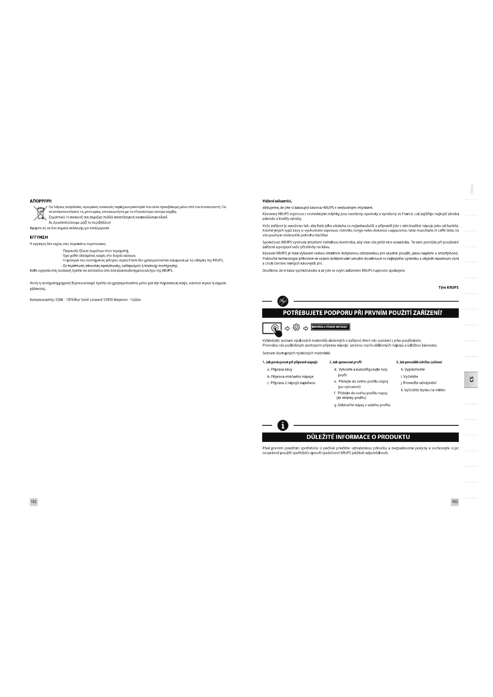 Κατασκευαστής: GSM – 1076 Rue Saint-Léonard 53100 Mayenne - Γαλλία Vážení zákazníci, děkujeme, že jste si zakoupili kávovar KRUPS svestavěným mlýnkem. Kávovary KRUPS espresso svestavěnými mlýnky jsou navrženy, vyvinuty avyrobeny ve Francii, což zajišťuje nejlepší záruku původu akvality výroby. Vaše zařízení je navrženo tak, aby byla jeho obsluha co nejjednodušší apřipravili jste sním kvalitní nápoje jako od baristy. Kromě jiných typů kávy si vychutnáte espresso, ristretto, lungo nebo dokonce cappuccino, latte macchiato či caé latte, to vše pouhým stisknutím jednoho tlačítka! Společnost KRUPS vyvinula intuitivní světelnou kontrolku, aby vám vše ještě více usnadnila. Ta vám pomůže při používání zařízení aprojasní vaše přestávky na kávu. Kávovar KRUPS je také vybaven velkou intuitivní dotykovou obrazovkou pro snadné použití, jakou najdete usmartphonů. Pokročilé technologie přítomné ve vašem zařízení vám umožní dosáhnout co nejlepšího výsledku aobjevit maximum vůní achutí čerstvě mletých kávových zrn. Doufáme, že si kávu vychutnáváte aže jste se svým zařízením KRUPS naprosto spokojení. Tým KRUPS POTŘEBUJETE PODPORU PŘI PRVNÍM POUŽITÍ ZAŘÍZENÍ? NÁPOVĚDA AVÝUKOVÉ MATERIÁLY Vyhledejte seznam výukových materiálů uložených vzařízení, které vás seznámí sjeho používáním. Provedou vás podrobným postupem přípravy nápoje, správou svých oblíbených nápojů aúdržbou kávovaru. Seznam dostupných výukových materiálů: