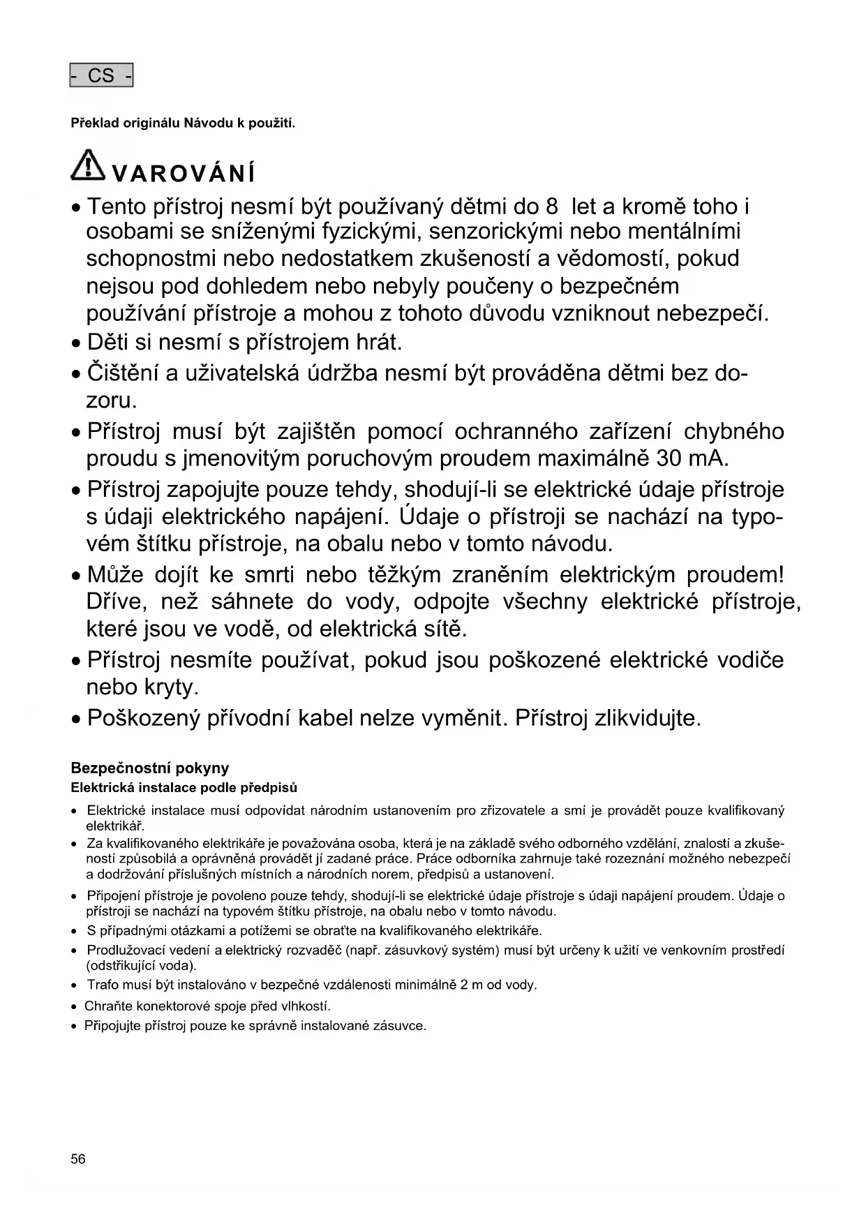 - Může dojít ke smrti nebo těžkým zraněním elektrickým proudem! Dříve, než sáhnete do vody, odpojte všechny elektrické přístroje, které jsou ve vodě, od elektrická sítě.