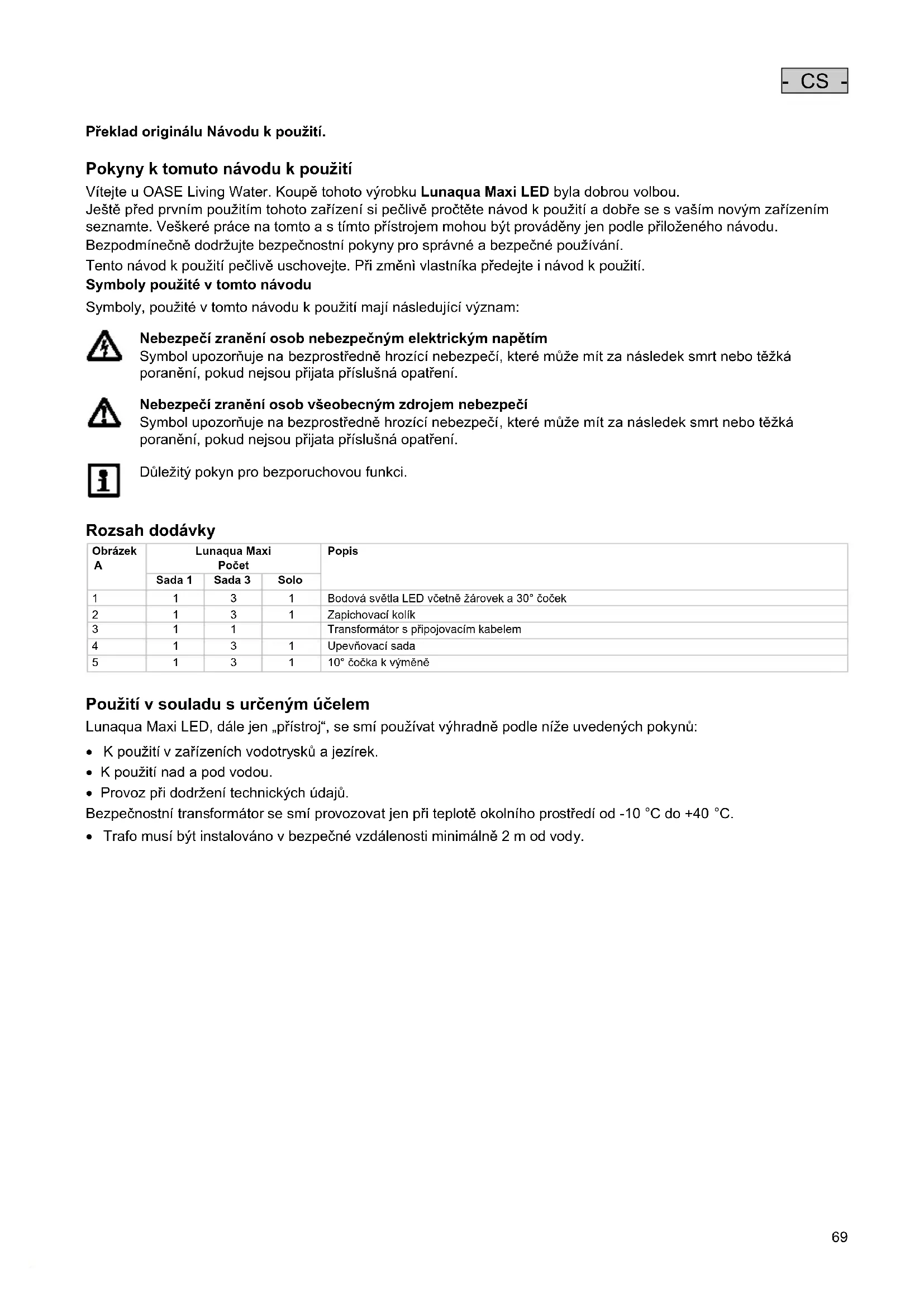 Pokyny k tomuto návodu k použití Vítejte u OASE Living Water. Koupě tohoto výrobku Lunaqua Maxi LED byla dobrou volbou. Ještě před prvním použitím tohoto zařízení si pečlivě pročtěte návod k použití a dobře se s vaším novým zařízením seznamte. Veškeré práce na tomto a s tímto přístrojem mohou být prováděny jen podle přiloženého návodu. Bezpodmínečně dodržujte bezpečnostní pokyny pro správné a bezpečné používání. Tento návod k použití pečlivě uschovejte. Při změnì vlastníka předejte i návod k použití. Symboly použité v tomto návodu
