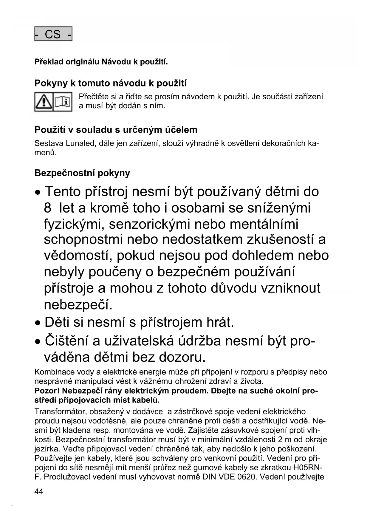 - Čištění a uživatelská údržba nesmí být pro- váděna dětmi bez dozoru. Kombinace vody a elektrické energie může při připojení v rozporu s předpisy nebo nesprávné manipulaci vést k vážnému ohrožení zdraví a života. Pozor! Nebezpečí rány elektrickým proudem. Dbejte na suché okolní pro- středí připojovacích míst kabelù. Transformátor, obsažený v dodávce a zástrčkové spoje vedení elektrického proudu nejsou vodotěsné, ale pouze chráněné proti dešti a odstřikující vodě. Ne- smí být kladena resp. montována ve vodě. Zajistěte zásuvkové spojení proti vlh- kosti. Bezpečnostní transformátor musí být v minimální vzdálenosti 2 m od okraje jezírka. Veďte připojovací vedení chráněné tak, aby nedošlo k jeho poškození. Používejte jen kabely, které jsou schváleny pro venkovní použití. Vedení pro při- pojení do sítě nesmějí mít menší průřez než gumové kabely se zkratkou H05RN- F. Prodlužovací vedení musí vyhovovat normě DIN VDE 0620. Vedení používejte- CS -