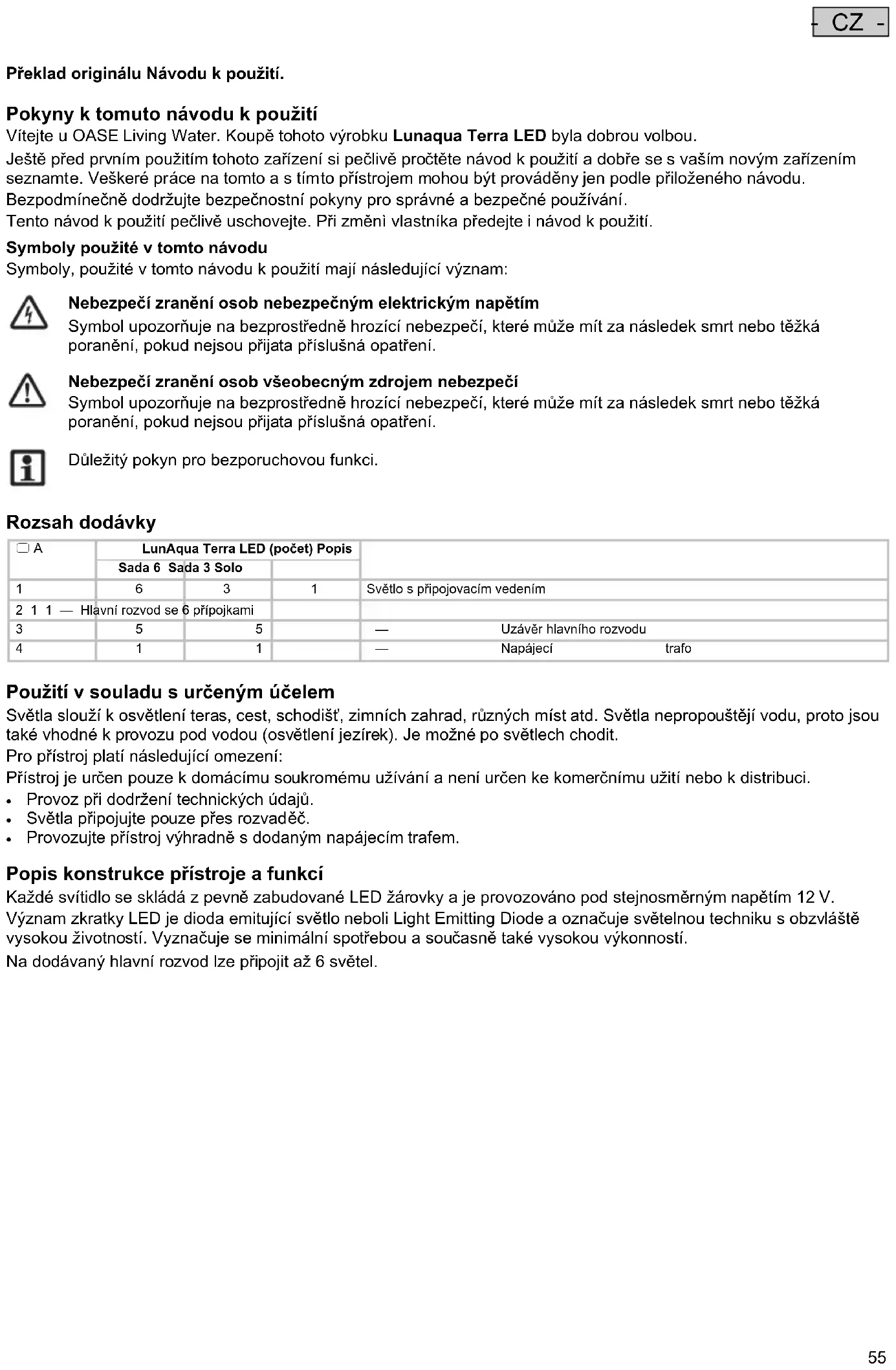 - CZ - Překlad originálu Návodu k použití. Pokyny k tomuto návodu k použití Vítejte u OASE Living Water. Koupě tohoto výrobku Lunaqua Terra LED byla dobrou volbou. Ještě před prvním použitím tohoto zařízení si pečlivě pročtěte návod k použití a dobře se s vaším novým zařízením seznamte. Veškeré práce na tomto a s tímto přístrojem mohou být prováděny jen podle přiloženého návodu. Bezpodmínečně dodržujte bezpečnostní pokyny pro správné a bezpečné používání. Tento návod k použití pečlivě uschovejte. Při změnì vlastníka předejte i návod k použití. Symboly použité v tomto návodu Symboly, použité v tomto návodu k použití mají následující význam:
