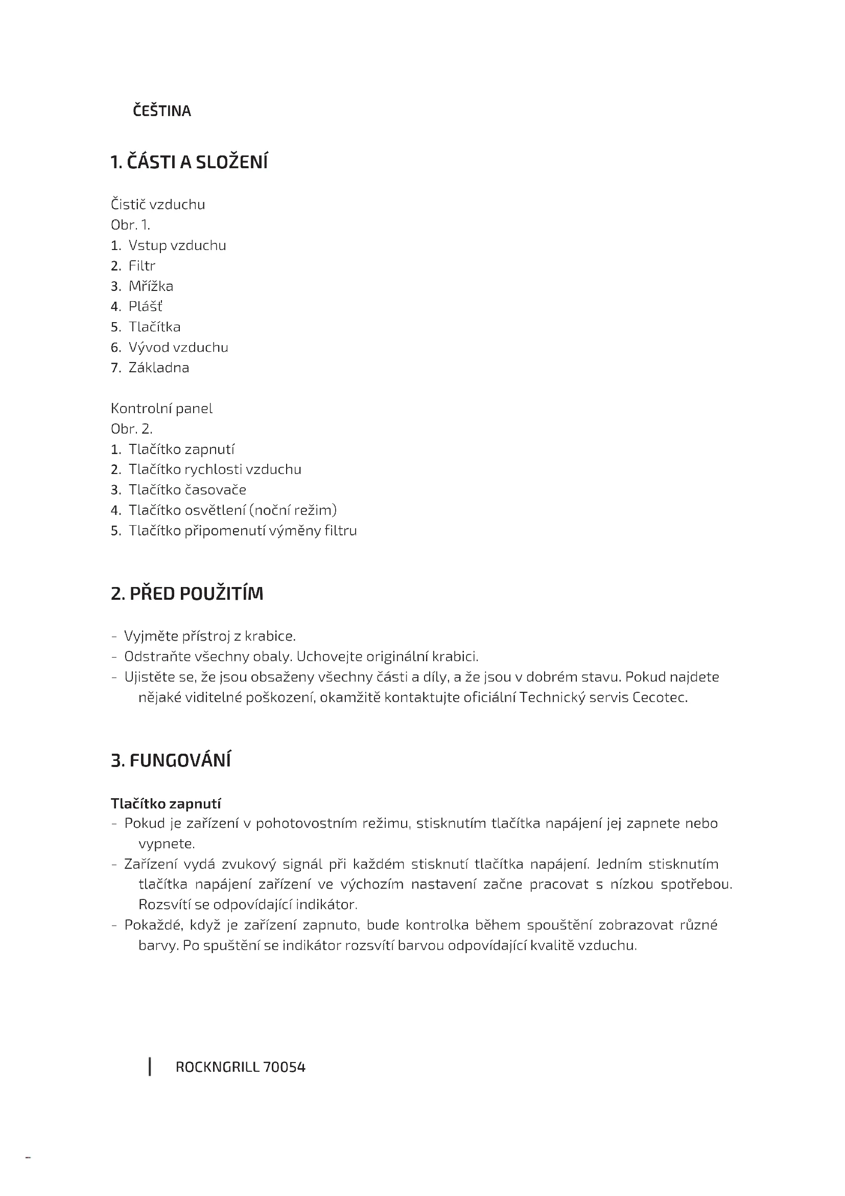 Před použitím přístroje si pozorně přečtěte následující bezpečnostní pokyny. Uchovejte tento manuál pro pozdější použití nebo pro nové uživatele. - Ujistěte se, že elektrická síť má stejné napětí jako je uvedené na etiketě produktu a že zásuvka je uzemněná. - Tento produkt je vhodný výlučně pro domácí využití. - Pravidelně kontrolujte přívodový kabel, abyste zjistili viditelná poškození. Pokud je kabel poškozen, musí být opraven u oficiálního technického servisu Cecotec, aby se tak předešlo jakýmkoli nebezpečím. - Abyste zabránili elektrickému výboji, nepoužívejte vodu, hořlavé látky ani další tekutiny, aby vniknuly do přístroje. - Nedávejte kabel, zásuvku nebo jinou část přístroje do vody ani jiné tekutiny. Nevystavujte elektrické spoje vodě. Ujistěte se, že máte naprosto suché ruce, než se dotknete zásuvky nebo zapnete přístroj. - Přístroj okamžitě vypněte a odpojte v případě defektu a nebo špatného fungování. - Pokud jsoou některá část přístroje nebo kabel poškozené, přístroj nepoužívejte. V takovém případě kontaktujte Asistenční technický servis Cecotec. - Neinstalujte přístroj v blízkosti přístrojů, které generují teplo, ani v blízkosti hořlavých nebo nebezpečných materiálů nebo na místech, kde je vysoká teplota nebo vlhkost. - Tento přístroj nemůže nahradit jiné normální formy ventilace nebo extrakce. - Ujistěte se, že přístroj používáte a skladujete na dobře větraných místech. - Instalujte přítroj tak, aby byla zásrčka přístupná. - Nesedejte si ani nestoupejte na přístroj. - Nepoužívejte venku. 05658_TotalPure 1800 Style Pro Connected_IM_YV_01210317.indd 2005658_TotalPure 1800 Style Pro Connected_IM_YV_01210317.indd 20 22/3/21 13:2522/3/21 13:25ROCKNGRILL 700 21 - Nestrkejte prsty ani žádné předměty do otvorů vstupu nebo výstupu vzduchu, abyste zabránili zraněním nebo poškození přístroje. - Neotáčejte, neohýbejte, nenatahujte ani jinak nepoškozujte napájecí kabel. Chraňte ho před ostrými hranami a zdroji tepla. Nedovolte, aby se kabel dotýkal horkých povrchů. Nedovolte, aby kabel visel přes okraj pracovní desky. - Pravidelně čistěte zásuvku suchým hadříkem, abyste zabránili akumulaci prachu. - Tento produkt nemůže být používán dětmi ani osobami s omezenými mentálními, fyzickými anebo senzorickými schopnostmi, nebo kterým chybí zkušenost a znalost. Nedovolte, aby si s přístrojem hrály děti. 05658_TotalPure 1800 Style Pro Connected_IM_YV_01210317.indd 2105658_TotalPure 1800 Style Pro Connected_IM_YV_01210317.indd 21 22/3/21 13:2522/3/21 13:25ROCKNGRILL 70022 ESPAÑOL