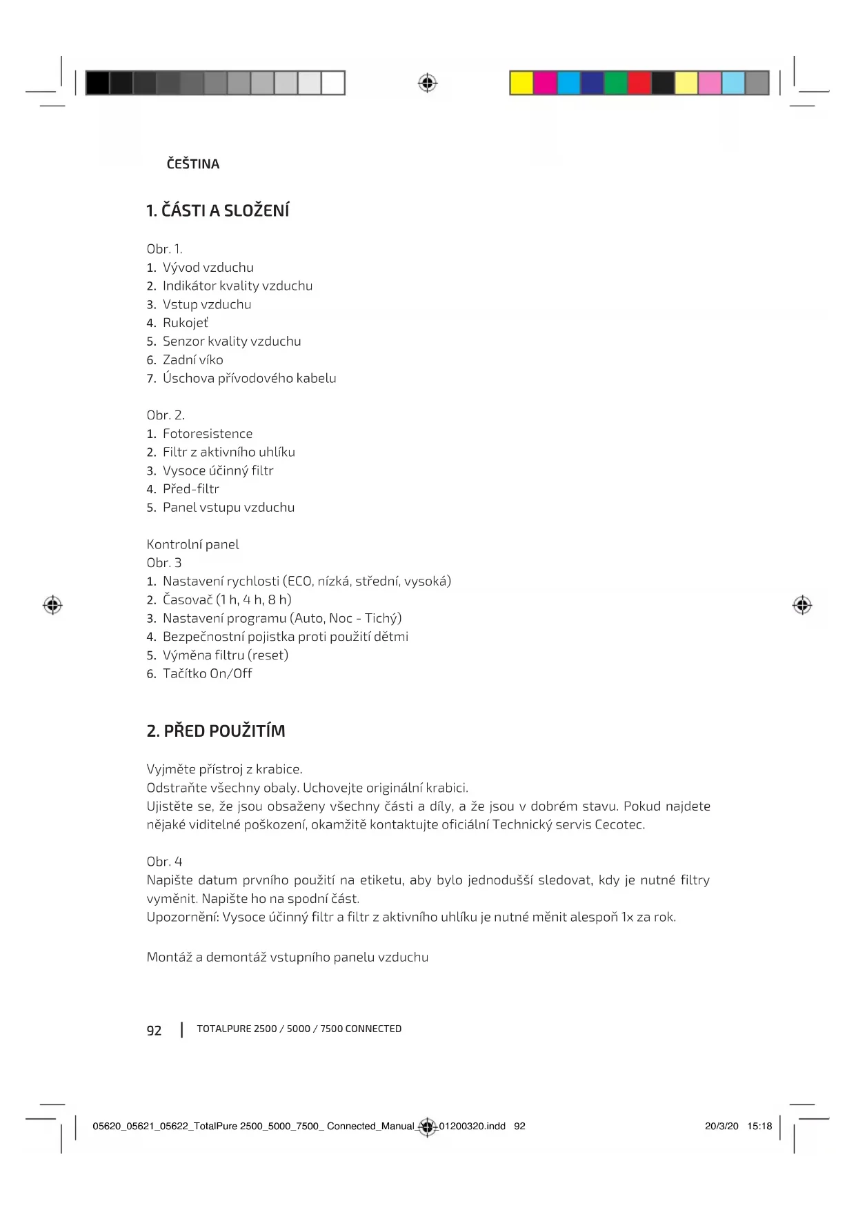 Vyjměte přístroj z krabice. Odstraňte všechny obaly. Uchovejte originální krabici. Ujistěte se, že jsou obsaženy všechny části a díly, a že jsou v dobrém stavu. Pokud najdete nějaké viditelné poškození, okamžitě kontaktujte oficiální Technický servis Cecotec. Obr. 4 Napište datum prvního použití na etiketu, aby bylo jednodušší sledovat, kdy je nutné filtry vyměnit. Napište ho na spodní část. Upozornění: Vysoce účinný filtr a filtr z aktivního uhlíku je nutné měnit alespoň 1x za rok. Montáž a demontáž vstupního panelu vzduchu 05620_05621_05622_TotalPure 2500_5000_7500_ Connected_Manual_YV_01200320.indd 9205620_05621_05622_TotalPure 2500_5000_7500_ Connected_Manual_YV_01200320.indd 92 20/3/20 15:1820/3/20 15:18TOTALPURE 2500 / 5000 / 7500 CONNECTED