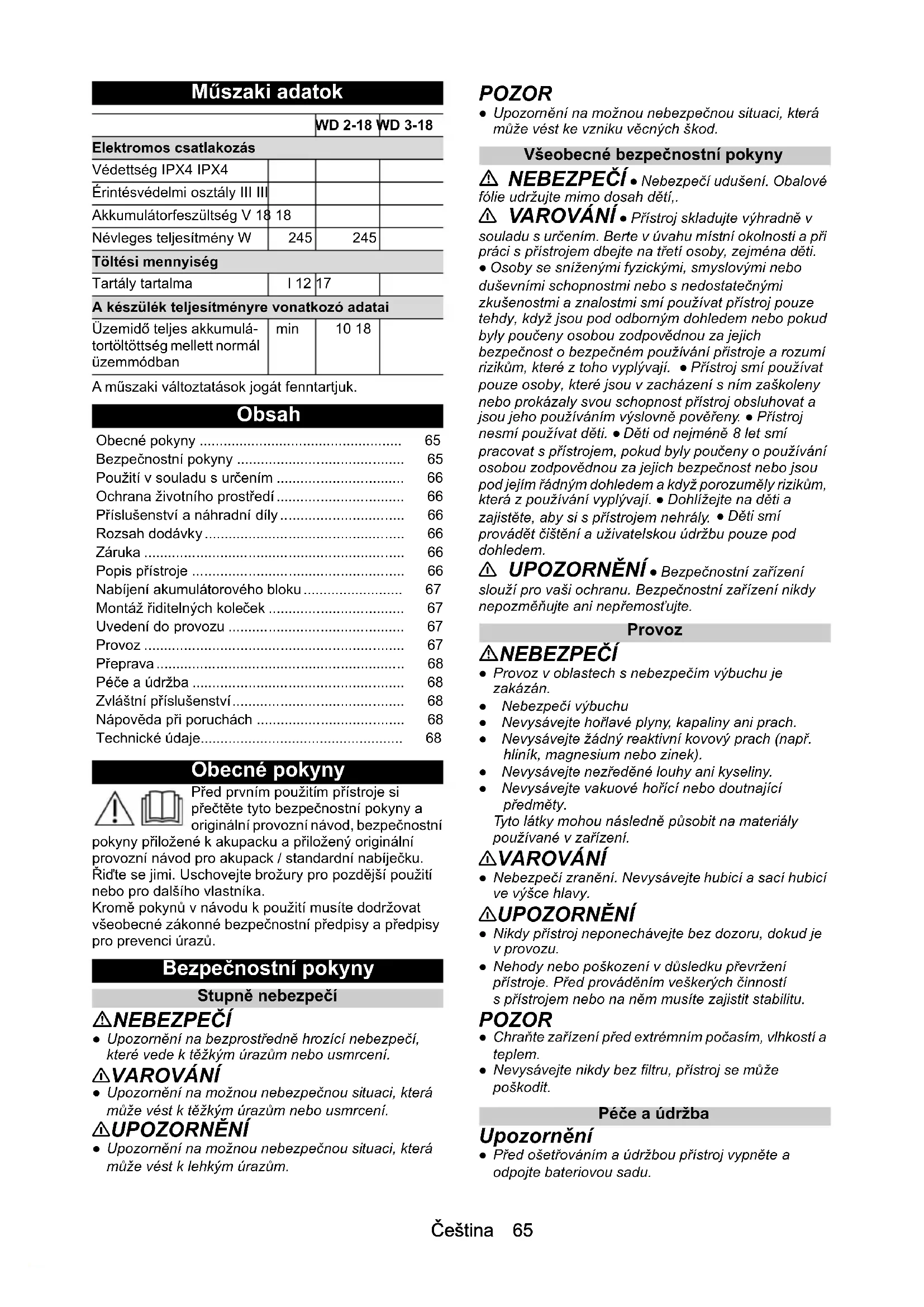 - A készülék magától lekapcsol A készülék / akkuegység túlmelegedett. Várjon, míg a készülék / akkuegység lehűl. Csökkenő szívóteljesítmény A tartozékok, a szívótömlő vagy a szívócsövek eldugul- tak. Távolítsa el a dugulást megfelelő segédeszközzel. A porzsák tele van. Cserélje ki a porzsákot. A habosított anyag szűrő/patronszűrő szennyezett. Tisztítsa meg a habosított anyag szűrőt / patronszű- rőt (lásd a(z) A habosított anyag szűrő / patronszűrő tisztítása fejezetet). A habosított anyag szűrő / patronszűrő sérült. Cserélje ki a habosított anyag szűrőt / patronszű rőt.Čeština 65 Műszaki adatok A műszaki változtatások jogát fenntartjuk. Obsah Obecné pokyny Před prvním použitím přístroje si přečtěte tyto bezpečnostní pokyny a originální provozní návod, bezpečnostní pokyny přiložené k akupacku a přiložený originální provozní návod pro akupack / standardní nabíječku. Řiďte se jimi. Uschovejte brožury pro pozdější použití nebo pro dalšího vlastníka. Kromě pokynů v návodu k použití musíte dodržovat všeobecné zákonné bezpečnostní předpisy a předpisy pro prevenci úrazů. Bezpečnostní pokyny Stupně nebezpečí NEBEZPEČÍ ● Upozornění na bezprostředně hrozící nebezpečí, které vede k těžkým úrazům nebo usmrcení. 몇 VAROVÁNÍ ● Upozornění na možnou nebezpečnou situaci, která může vést k těžkým úrazům nebo usmrcení. 몇 UPOZORNĚNÍ ● Upozornění na možnou nebezpečnou situaci, která může vést k lehkým úrazům. POZOR ● Upozornění na možnou nebezpečnou situaci, která může vést ke vzniku věcných škod. Všeobecné bezpečnostní pokyny NEBEZPEČÍ ● Nebezpečí udušení. Obalové fólie udržujte mimo dosah dětí,. 몇 VAROVÁNÍ ● Přístroj skladujte výhradně v souladu s určením. Berte v úvahu místní okolnosti a při práci s přístrojem dbejte na třetí osoby, zejména děti. ● Osoby se sníženými fyzickými, smyslovými nebo duševními schopnostmi nebo s nedostatečnými zkušenostmi a znalostmi smí používat přístroj pouze tehdy, když jsou pod odborným dohledem nebo pokud byly poučeny osobou zodpovědnou za jejich bezpečnost o bezpečném používání přistroje a rozumí rizikům, které z toho vyplývají. ● Přístroj smí používat pouze osoby, které jsou v zacházení s ním zaškoleny nebo prokázaly svou schopnost přístroj obsluhovat a jsou jeho používáním výslovně pověřeny. ● Přístroj nesmí používat děti. ● Děti od nejméně 8 let smí pracovat s přístrojem, pokud byly poučeny o používání osobou zodpovědnou za jejich bezpečnost nebo jsou pod jejím řádným dohledem a když porozuměly rizikům, která z používání vyplývají. ● Dohlížejte na děti a zajistěte, aby si s přístrojem nehrály. ● Děti smí provádět čištění a uživatelskou údržbu pouze pod dohledem. 몇 UPOZORNĚNÍ ● Bezpečnostní zařízení slouží pro vaši ochranu. Bezpečnostní zařízení nikdy nepozměňujte ani nepřemosťujte. Provoz NEBEZPEČÍ ● Provoz v oblastech s nebezpečím výbuchu je zakázán. ● Nebezpečí výbuchu ● Nevysávejte hořlavé plyny, kapaliny ani prach. ● Nevysávejte žádný reaktivní kovový prach (např. hliník, magnesium nebo zinek). ● Nevysávejte nezředěné louhy ani kyseliny. ● Nevysávejte vakuové hořící nebo doutnající předměty. Tyto látky mohou následně působit na materiály používané v zařízení. 몇 VAROVÁNÍ ● Nebezpečí zranění. Nevysávejte hubicí a sací hubicí ve výšce hlavy. 몇 UPOZORNĚNÍ ● Nikdy přístroj neponechávejte bez dozoru, dokud je v provozu. ● Nehody nebo poškození v důsledku převržení přístroje. Před prováděním veškerých činností s přístrojem nebo na něm musíte zajistit stabilitu. POZOR ● Chraňte zařízení před extrémním počasím, vlhkostí a teplem. ● Nevysávejte nikdy bez filtru, přístroj se může poškodit. Péče a údržba Upozornění ● Před ošetřováním a údržbou přístroj vypněte a odpojte bateriovou sadu. WD 2-18 WD 3-18 Elektromos csatlakozás Védettség IPX4 IPX4 Érintésvédelmi osztály III III Akkumulátorfeszültség V 18 18 Névleges teljesítmény W 245 245 Töltési mennyiség Tartály tartalma l 12 17 A készülék teljesítményre vonatkozó adatai Üzemidő teljes akkumulá- tortöltöttség mellett normál üzemmódban min 10 18 Obecné pokyny p. 65