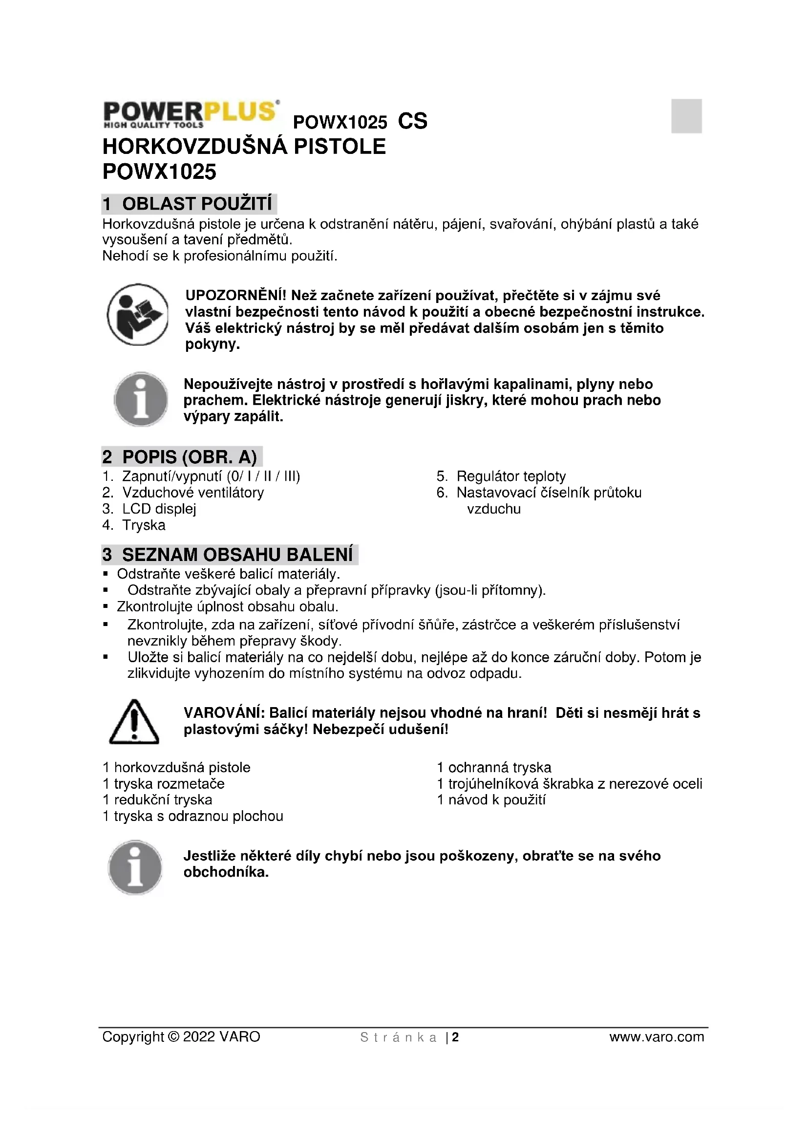 - Servisní práce na elektrickém nástroji přenechejte kvalifikovanému technikovi, který používá výhradně originální náhradní díly. Tak si zajistíte, že nástroj bude i nadále bezpečný.POWX1025 CS Copyright © 2022 VARO S t r á n k a | 5 www.varo.com 6 DALŠÍ BEZPEČNOSTNÍ POKYNY PRO HORKOVZDUŠNÉ PISTOLE
