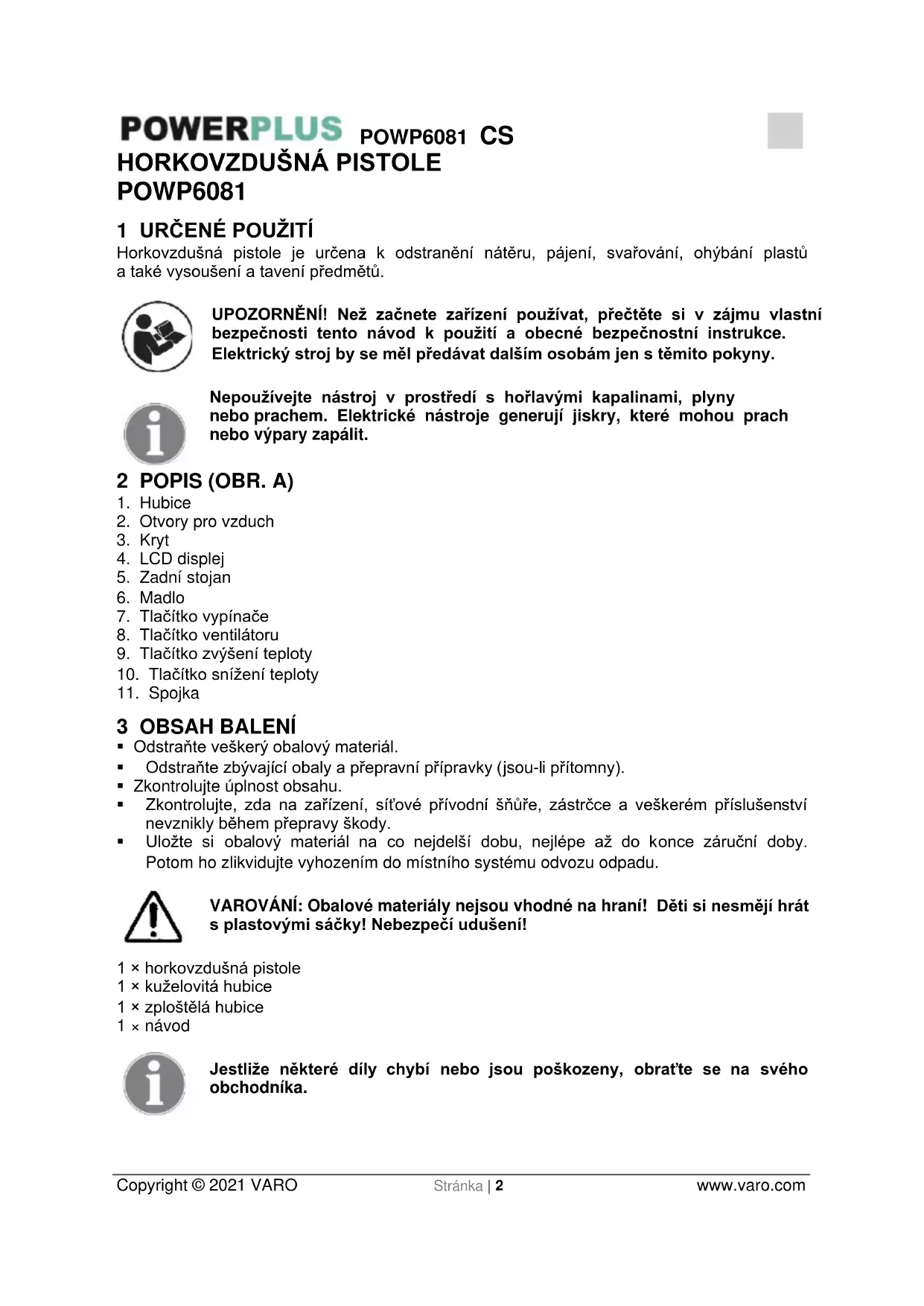 - Servisní práce na elektrickém stroji přenechejte kvalifikovanému technikovi, který používá výhradně originální náhradní díly. Tak zajistíte, že stroj bude i nadále bezpečný.POWP6081 CS Copyright © 2021 VARO Stránka | 5 www.varo.com 6 DALŠÍ BEZPEČNOSTNÍ POKYNY PRO HORKOVZDUŠNÉ PISTOLE