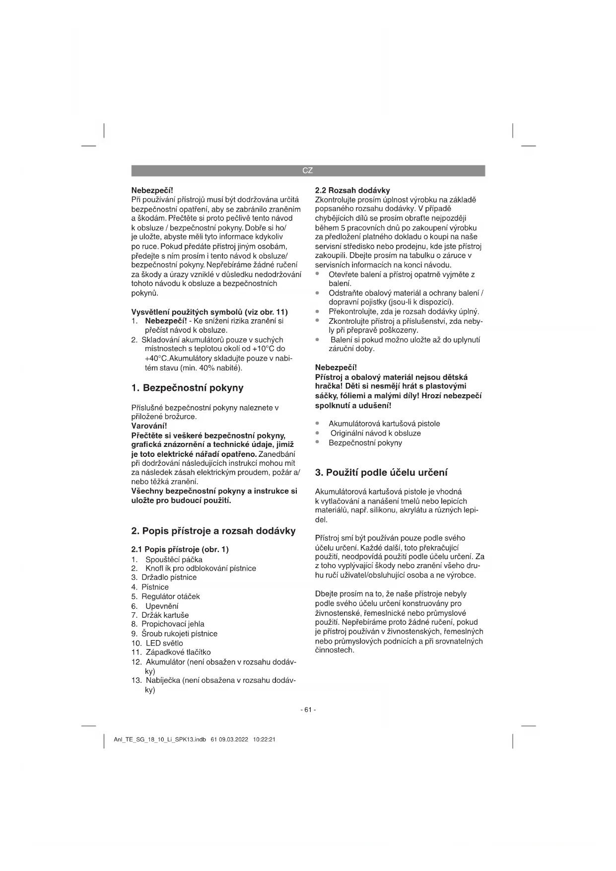 Akumulátorová kartušová pistole je vhodná k vytlačování a nanášení tmelů nebo lepicích materiálů, např. silikonu, akrylátu a různých lepi- del. Přístroj smí být používán pouze podle svého účelu určení. Každé další, toto překračující použití, neodpovídá použití podle účelu určení. Za z toho vyplývající škody nebo zranění všeho dru- hu ručí uživatel/obsluhující osoba a ne výrobce. Dbejte prosím na to, že naše přístroje nebyly podle svého účelu určení konstruovány pro živnostenské, řemeslnické nebo průmyslové použití. Nepřebíráme proto žádné ručení, pokud je přístroj používán v živnostenských, řemeslných nebo průmyslových podnicích a při srovnatelných činnostech. Anl_TE_SG_18_10_Li_SPK13.indb 61 09.03.2022 10:22:21CZ