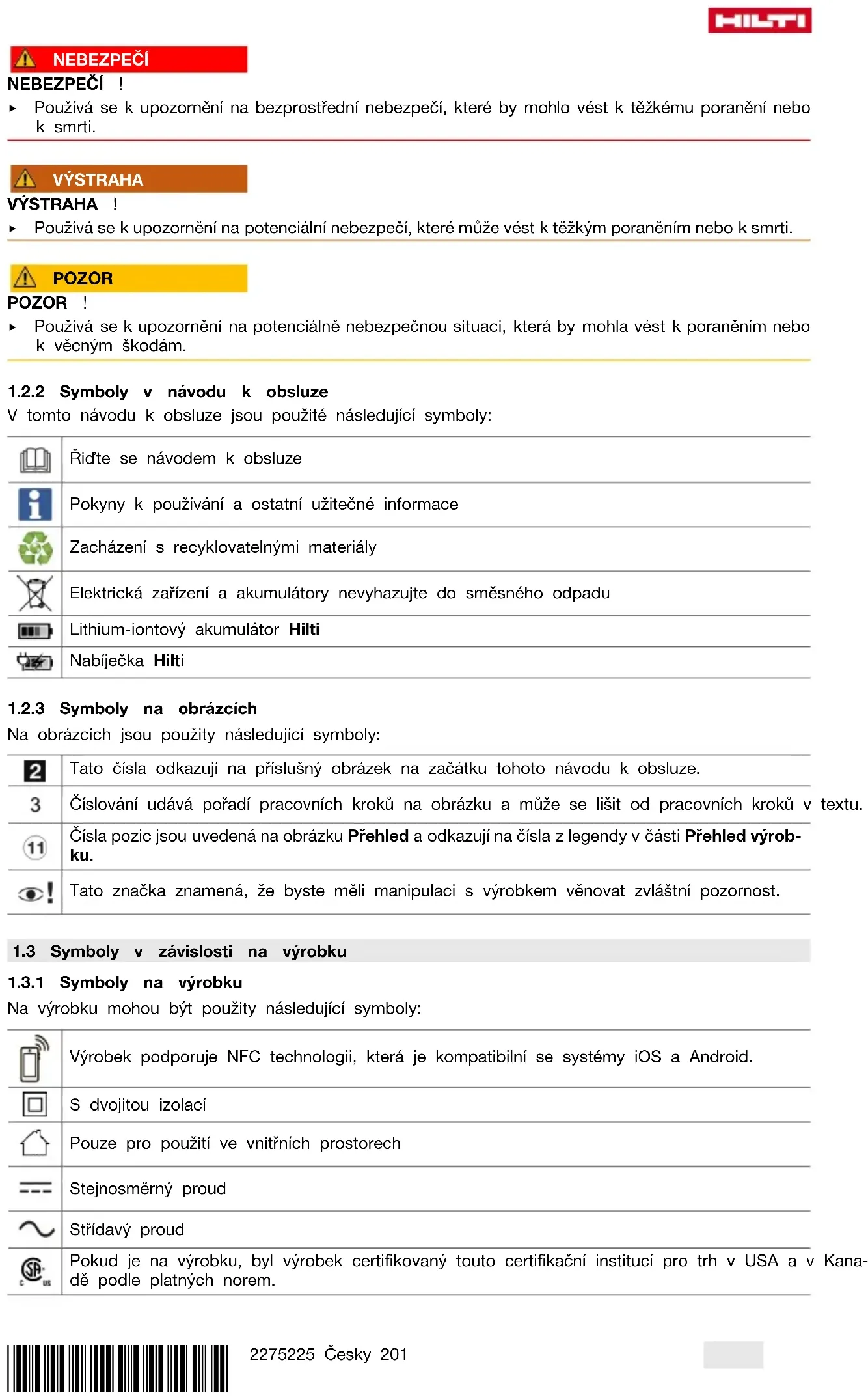 11 Záruka výrobce ▶ V případě otázek ohledně záručních podmínek se obraťte na místního partnera Hilti.208 Česky 2275225 *2275225* 12 Další informace C 6-22 (01) RoHS (směrnice o omezení používání nebezpečných látek) Tato tabulka platí pro čínský trh.*2275225* 2275225 Česky 209 Tato tabulka platí pro trh na Tchaj-wanu. C 8-22 (01)210 Česky 2275225 *2275225* RoHS (směrnice o omezení používání nebezpečných látek) Tato tabulka platí pro čínský trh.*2275225* 2275225 Česky 211 Tato tabulka platí pro trh na Tchaj-wanu. 13 Lithium-iontový akumulátor Hilti Pokyny k bezpečnosti a použití V této dokumentaci se pojem akumulátor používá pro nabíjecí lithium-iontové akumulátory Hilti, které obsahují několik lithium-iontových článků. Jsou určené pro elektrické nářadí Hilti a smí se používat pouze s tímto nářadím. Používejte pouze originální akumulátory Hilti! Popis Akumulátory Hilti jsou vybavené systémy řízení a ochrany článků. Akumulátory se skládají z článků, které obsahují lithium-iontový akumulační materiál, který umožňuje vysokou specifickou hustotu energie. U lithium-iontových článků se vyskytuje velmi malý paměťový efekt, jsou ale velmi citlivé vůči působení násilí, hlubokému vybití nebo vysokým teplotám. Výrobky schválené pro akumulátory Hilti najdete v Hilti Store nebo na: www.hilti.group Bezpečnost ▶ Dodržujte následující bezpečnostní pokyny pro bezpečnou manipulaci s lithium-iontovými akumu- látory a jejich bezpečné použití. Nedodržování může způsobit podráždění pokožky, těžká poranění poleptáním, chemické popáleniny, požár a/nebo výbuch. ▶ S akumulátory zacházejte opatrně, aby nedošlo k poškození a úniku kapalin, které jsou silně zdraví škodlivé! ▶ Akumulátory se nesmí v žádném případě přizpůsobovat nebo upravovat! ▶ Akumulátory se nesmějí rozebírat, lisovat, zahřívat nad 80 °C ani pálit. ▶ Nepoužívejte nebo nenabíjejte akumulátory, které utrpěly náraz nebo jsou jiným způsobem poškozené. Akumulátory pravidelně kontrolujte, zda nevykazují známky poškození. ▶ Nikdy nepoužívejte recyklované nebo opravené akumulátory.212 Česky 2275225 *2275225* ▶ Akumulátory a akumulátorové elektrické nářadí nikdy nepoužívejte jako úderové nářadí. ▶ Akumulátory vždy chraňte před přímým slunečním zářením, vyššími teplotami, jiskřením a otevřeným plamenem. Může by dojít k výbuchu. ▶ Nedotýkejte se pólů akumulátoru prsty, nástroji, šperky nebo jinými elektricky vodivými předměty. Může dojít k poškození akumulátoru, věcným škodám a poranění. ▶ Akumulátory chraňte před deštěm, vlhkostí a kapalinami. V případě proniknutí vlhkosti může dojít ke zkratu, zásahu elektrickým proudem, popáleninám, požáru a výbuchu. ▶ Používejte pouze nabíječky a elektrické nářadí určené pro tento typ akumulátoru. Řiďte se údaji v příslušných návodech k obsluze. ▶ Akumulátor nepoužívejte a neskladujte v prostředí s nebezpečím výbuchu. ▶ Pokud je akumulátor příliš horký na dotek, může být vadný. Akumulátor položte na nehořlavé místo, na které je vidět, v dostatečné vzdálenosti od hořlavých materiálů. Nechte akumulátor vychladnout. Když je akumulátor i za hodinu stále příliš horký na dotek, je vadný. Postupujte podle pokynů v kapitole Opatření v případě hořícího akumulátoru. Postup v případě poškozených akumulátorů ▶ Pokud je akumulátor poškozený, vždy se obraťte na servis Hilti. ▶ Nikdy nepoužívejte akumulátor, ze kterého vytéká kapalina. ▶ Dbejte na to, aby se vytékající kapalina nedostala do přímého kontaktu s očima a/nebo pokožkou. Při manipulaci s akumulátorovou kapalinou používejte vždy ochranné rukavice a ochranné brýle. ▶ Pro odstranění vyteklé akumulátorové kapaliny použijte schválený chemický čisticí prostředek. Dodržujte místní předpisy pro čištění akumulátorové kapaliny. ▶ Vadný akumulátor vložte do nehořlavé nádoby a zakryjte ho suchým pískem, křídovým práškem (CaCO₃) nebo silikátem (vermikulitem). Poté nádobu uzavřete víkem, aby dovnitř nemohl vzduch, a uložte ji mimo dosah hořlavých plynů, kapalin nebo předmětů. ▶ Nádobu odevzdejte k likvidaci v Hilti Store nebo se obraťte na příslušnou sběrnu odpadu. Dodržujte místní přepravní předpisy pro poškozené akumulátory. Postup v případě již nefunkčních akumulátorů ▶ Všímejte si neobvyklého chování akumulátorů, jako jsou nesprávné nabíjení, neobvykle dlouhé doby nabíjení, znatelný pokles výkonu, neobvyklé indikace LED nebo vytékající kapaliny. Jsou to známky problému uvnitř akumulátoru. ▶ Pokud se domníváte, že se vyskytl problém uvnitř akumulátoru, kontaktujte servis Hilti. ▶ Pokud již akumulátor nefunguje, nelze ho už nabít nebo vytéká kapalina, musíte ho zlikvidovat. Viz kapitolu Údržba a likvidace. Opatření v případě hořícího akumulátoru VÝSTRAHA Nebezpečí způsobené hořícím akumulátorem! Hořící akumulátor uvolňuje nebezpečné a výbušné kapaliny a výpary, které mohou způsobit poranění poleptáním, popáleniny nebo exploze. ▶ Při hašení hořícího akumulátoru noste osobní ochranné pomůcky. ▶ Zajistěte dostatečné větrání, aby mohly unikat nebezpečné a výbušné výpary. ▶ V případě vzniku velkého množství kouře okamžitě opusťte místnost. ▶ V případě podráždění dýchacích cest vyhledejte lékaře. ▶ Než začnete hasit, zavolejte požárníky. ▶ Hořící akumulátory haste pouze vodou z co možná největší vzdálenosti. Práškové hasicí prostředky a hasicí deky jsou u lithium-iontových akumulátorů neúčinné. Okolní požár lze hasit bě