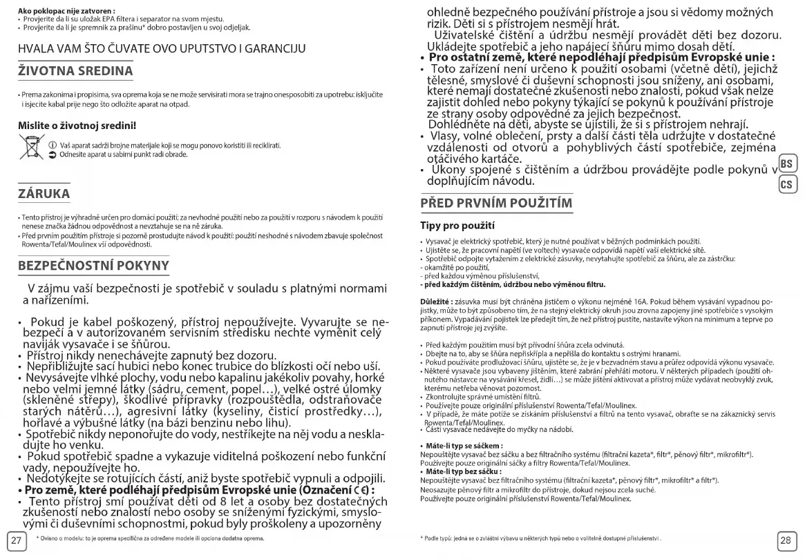 - Některé vysavače jsou vybaveny jištěním, které zabrání přehřátí motoru. V některých případech (použití oh- nutého nástavce na vysávání křesel, židlí…) se může jištění aktivovat a přístroj může vydávat neobvyklý zvuk, kterému netřeba věnovat pozornost. • Zkontrolujte správné umístění ltrů. • Používejte pouze originální příslušenství Rowenta/Tefal/Moulinex. • V případě, že máte potíže se získáním příslušenství a ltrů na tento vysavač, obraťte se na zákaznický servis Rowenta/Tefal/Moulinex. • Části vysavače nedávejte do myčky na nádobí.• Máte-li typ se sáčkem : Nepouštějte vysavač bez sáčku a bez ltračního systému (ltrační kazeta*, ltr*, pěnový ltr*, mikroltr*).Používejte pouze originální sáčky a ltry Rowenta/Tefal/Moulinex. • Máte-li typ bez sáčku :Nepouštějte vysavač bez ltračního systému (ltrační kazeta*, pěnový ltr*, mikroltr* a ltr*).Neosazujte pěnový ltr a mikroltr do přístroje, dokud nejsou zcela suché.Používejte pouze originální příslušenství Rowenta/Tefal/Moulinex.
