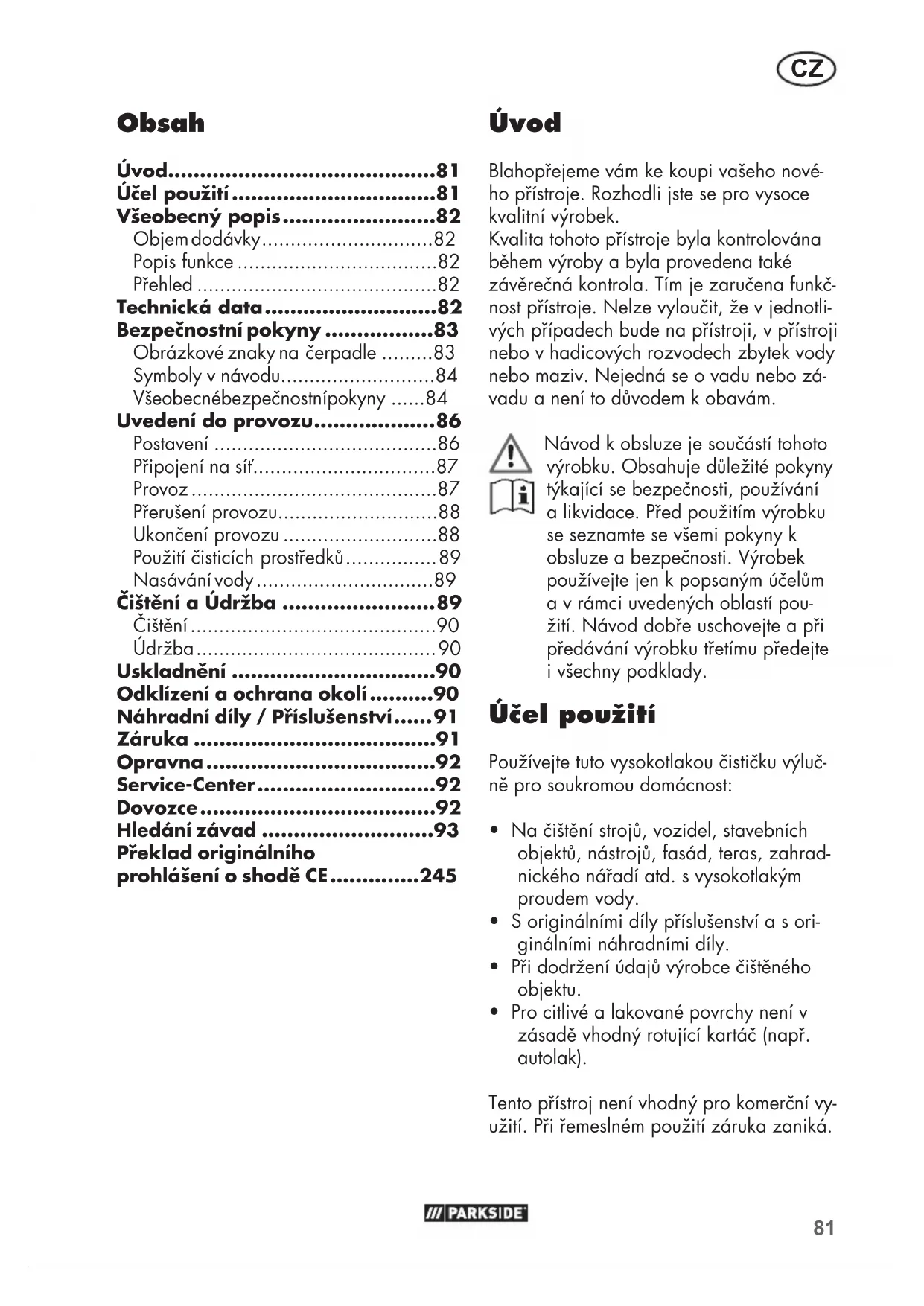 - Pro citlivé a lakované povrchy není v zásadě vhodný rotující kartáč (např. autolak). Tento přístroj není vhodný pro komerční vy- užití. Při řemeslném použití záruka zaniká. Obsah Úvod..........................................81 Účel použití ................................81 Všeobecný popis ........................82 Objem dodávky ..............................82 Popis funkce ...................................82 Přehled ..........................................82 Technická data ...........................82 Bezpečnostní pokyny .................83 Obrázkové znaky na čerpadle .........83 Symboly v návodu ...........................84 Všeobecné bezpečnostní pokyny ......84 Uvedení do provozu ................... 86 Postavení .......................................86 Připojení na síť ................................87 Provoz ...........................................87 Přerušení provozu............................88 Ukončení provozu ...........................88 Použití čisticích prostředků ................ 89 Nasávání vody ...............................89 Čištění a Údržba ........................89 Čištění ...........................................90 Údržba .......................................... 90 Uskladnění ................................90 Odklízení a ochrana okolí ..........90 Náhradní díly / Příslušenství ...... 91 Záruka ......................................91 Opravna ....................................92 Service-Center ............................92 Dovozce .....................................92 Hledání závad ...........................93 Překlad originálního prohlášení o shodě CE ..............24582