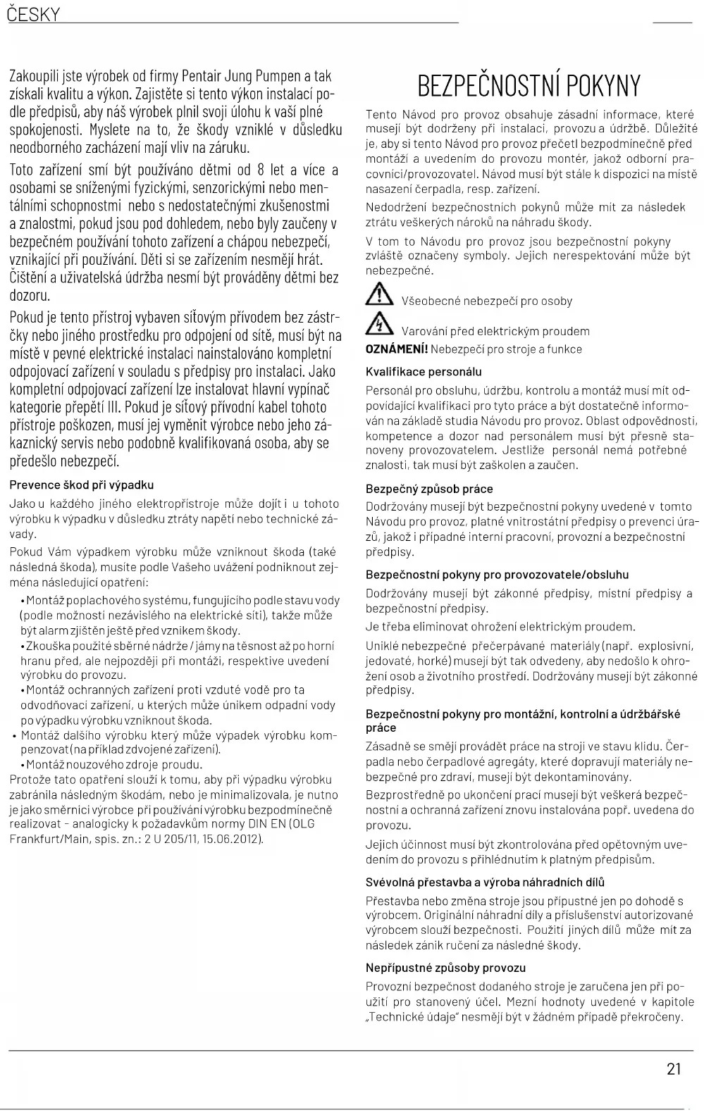 - Niewłaściwy kierunek obrotów przy prądzie trójfazowym = zamienić ze sobą 2 fazy na przewodzie zasilającym; zlecić to elektrykowi21 ČESKY Zakoupili jste výrobek od rmy Pentair Jung Pumpen a tak získali kvalitu a výkon. Zajistěte si tento výkon instalací po- dle předpisů, aby náš výrobek plnil svoji úlohu k vaší plné spokojenosti. Myslete na to, že škody vzniklé v důsledku neodborného zacházení mají vliv na záruku. Toto zařízení smí být používáno dětmi od 8 let a více a osobami se sníženými fyzickými, senzorickými nebo men- tálními schopnostmi nebo s nedostatečnými zkušenostmi a znalostmi, pokud jsou pod dohledem, nebo byly zaučeny v bezpečném používání tohoto zařízení a chápou nebezpečí, vznikající při používání. Děti si se zařízením nesmějí hrát. Čištění a uživatelská údržba nesmí být prováděny dětmi bez dozoru. Pokud je tento přístroj vybaven síťovým přívodem bez zástr- čky nebo jiného prostředku pro odpojení od sítě, musí být na místě v pevné elektrické instalaci nainstalováno kompletní odpojovací zařízení v souladu s předpisy pro instalaci. Jako kompletní odpojovací zařízení lze instalovat hlavní vypínač kategorie přepětí III. Pokud je síťový přívodní kabel tohoto přístroje poškozen, musí jej vyměnit výrobce nebo jeho zá- kaznický servis nebo podobně kvalikovaná osoba, aby se předešlo nebezpečí. Prevence škod při výpadku Jako u každého jiného elektropřístroje může dojít i u tohoto výrobku k výpadku v důsledku ztráty napětí nebo technické zá- vady. Pokud Vám výpadkem výrobku může vzniknout škoda (také následná škoda), musíte podle Vašeho uvážení podniknout zej- ména následující opatření: