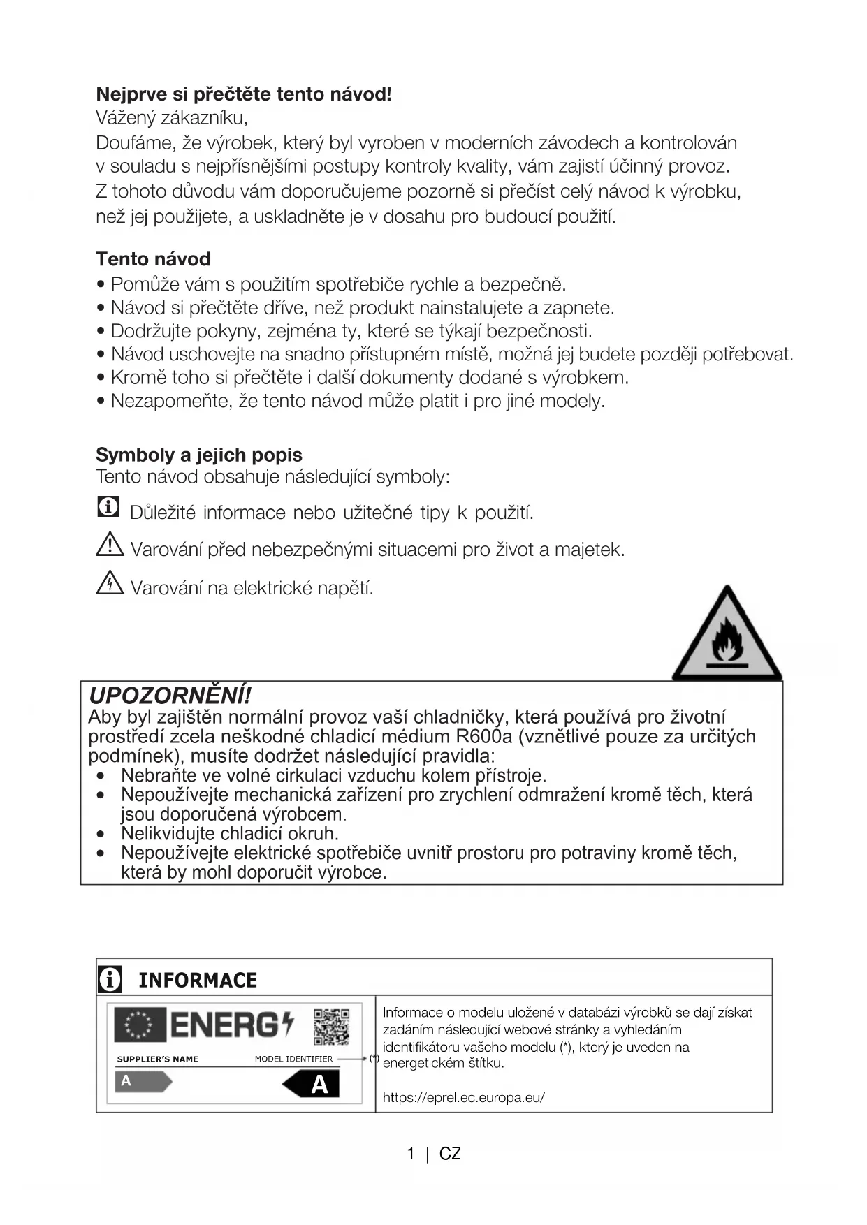 - Kromě toho si přečtěte i další dokumenty dodané s výrobkem.• Nezapomeňte, že tento návod může platit i pro jiné modely.Symboly a jejich popisTento návod obsahuje následující symboly: C Důležité informace nebo užitečné tipy k použití. A Varování před nebezpečnými situacemi pro život a majetek. B Varování na elektrické napětí. UPOZORNĚNÍ! Aby byl zajištěn normální provoz vaší chladničky, která používá pro životní prostředí zcela neškodné chladicí médium R600a (vznětlivé pouze za určitých podmínek), musíte dodržet následující pravidla: Nebraňte ve volné cirkulaci vzduchu kolem přístroje. Nepoužívejte mechanická zařízení pro zrychlení odmražení kromě těch, kterájsou doporučená výrobcem. Nelikvidujte chladicí okruh. Nepoužívejte elektrické spotřebiče uvnitř prostoru pro potraviny kromě těch,která by mohl doporučit výrobce.