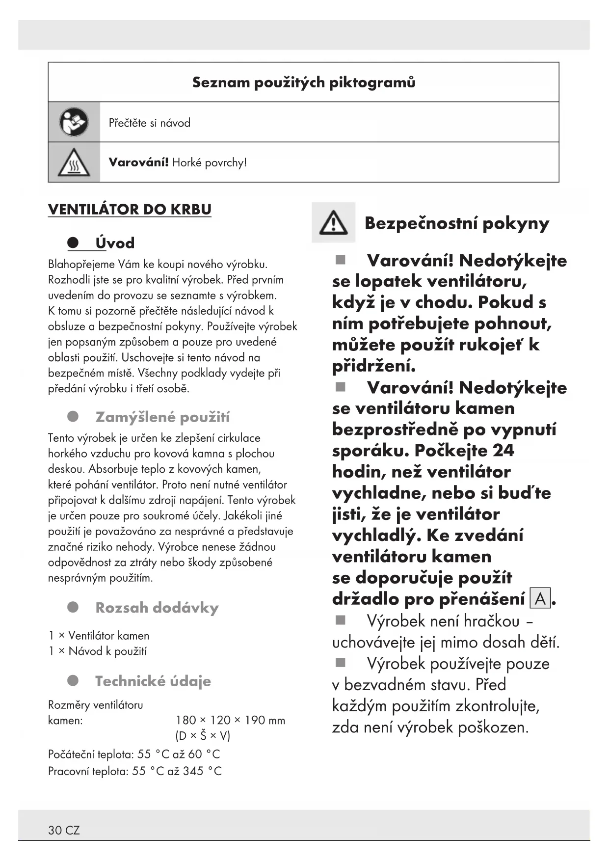 Úvod Blahopřejeme Vám ke koupi nového výrobku. Rozhodli jste se pro kvalitní výrobek. Před prvním uvedením do provozu se seznamte s výrobkem. K tomu si pozorně přečtěte následující návod k obsluze a bezpečnostní pokyny. Používejte výrobek jen popsaným způsobem a pouze pro uvedené oblasti použití. Uschovejte si tento návod na bezpečném místě. Všechny podklady vydejte při předání výrobku i třetí osobě. Zamýšlené použití Tento výrobek je určen ke zlepšení cirkulace horkého vzduchu pro kovová kamna s plochou deskou. Absorbuje teplo z kovových kamen, které pohání ventilátor. Proto není nutné ventilátor připojovat k dalšímu zdroji napájení. Tento výrobek je určen pouze pro soukromé účely. Jakékoli jiné použití je považováno za nesprávné a představuje značné riziko nehody. Výrobce nenese žádnou odpovědnost za ztráty nebo škody způsobené nesprávným použitím. Rozsah dodávky 1 × Ventilátor kamen 1 × Návod kpoužití Technické údaje Rozměry ventilátoru kamen: 180 × 120 × 190 mm (D × Š × V) Počáteční teplota: 55 °C až 60 °C Pracovní teplota: 55 °C až 345 °C Bezpečnostní pokyny Varování! Nedotýkejte se lopatek ventilátoru, když je v chodu. Pokud s ním potřebujete pohnout, můžete použít rukojeť k přidržení. Varování! Nedotýkejte se ventilátoru kamen bezprostředně po vypnutí sporáku. Počkejte 24 hodin, než ventilátor vychladne, nebo si buďte jisti, že je ventilátor vychladlý. Ke zvedání ventilátoru kamen se doporučuje použít držadlo pro přenášení [A]. Výrobek není hračkou – uchovávejte jej mimo dosah dětí. Výrobek používejte pouze vbezvadném stavu. Před každým použitím zkontrolujte, zda není výrobek poškozen. Seznam použitých piktogramů Přečtěte si návod Varování! Horké povrchy! 447428_2301_OS_DE_FR_PL_CZ_SK_03.indb 30447428_2301_OS_DE_FR_PL_CZ_SK_03.indb 30 5/2/2023 3:53:18 PM5/2/2023 3:53:18 PM31CZ Vzhledem k tomu, že teplota kamen je vyšší než maximální teplota výrobku, odstraňte ji před poškozením ventilátoru kamen.