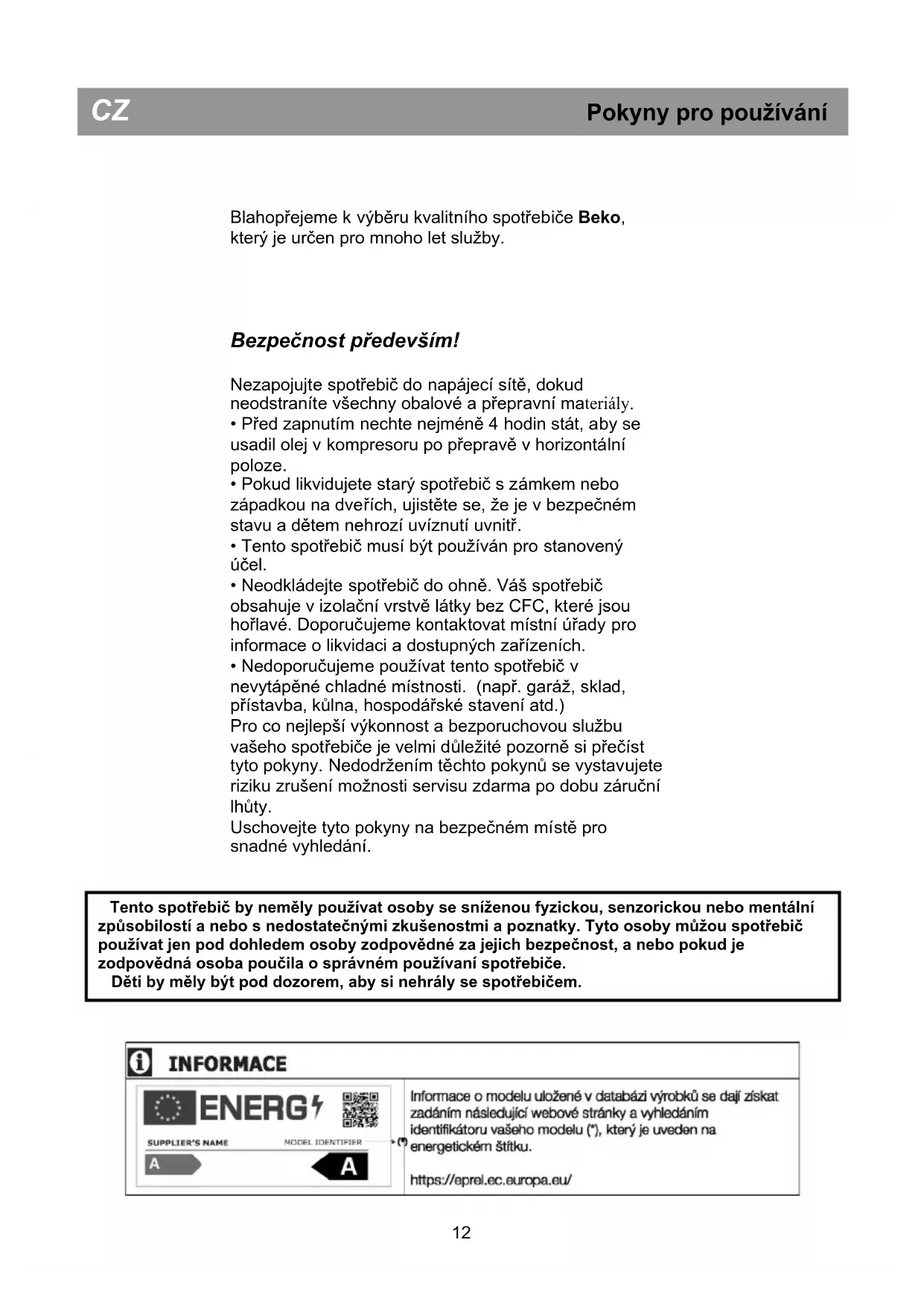 Tento spotřebič by neměly používat osoby se sníženou fyzickou, senzorickou nebo mentální způsobilostí a nebo s nedostatečnými zkušenostmi a poznatky. Tyto osoby můžou spotřebič používat jen pod dohledem osoby zodpovědné za jejich bezpečnost, a nebo pokud je zodpovědná osoba poučila o správném používaní spotřebiče. Děti by měly být pod dozorem, aby si nehrály se spotřebičem. CZ Pokyny pro používáníCZ Pokyny pro používání Elektrické požadavk