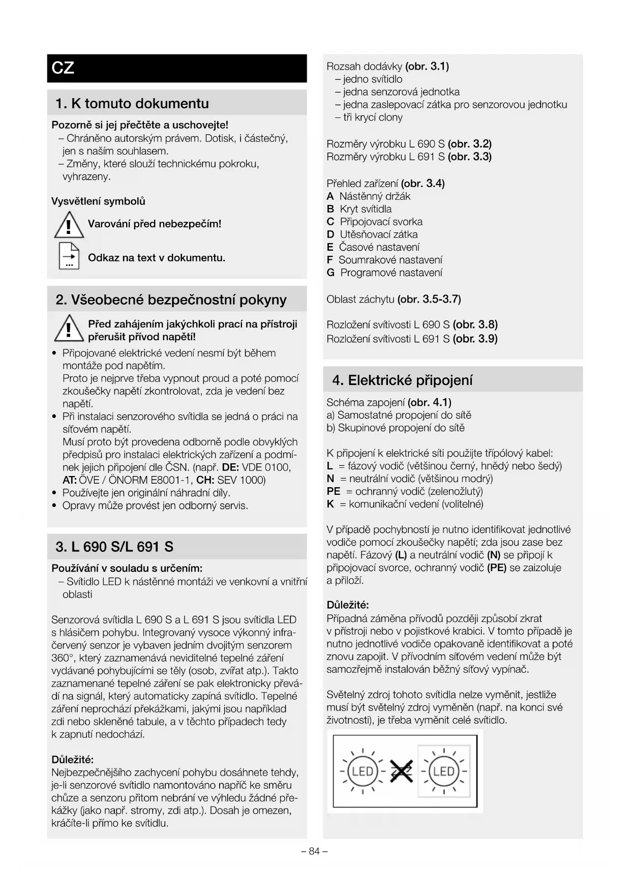 Používání vsouladu surčením: – Svítidlo LED knástěnné montáži ve venkovní avnitřní oblasti Senzorová svítidla L690 S a L691 S jsou svítidla LED s hlásičem pohybu. Integrovaný vysoce výkonný infra- červený senzor je vybaven jedním dvojitým senzorem 360°, který zaznamenává neviditelné tepelné záření vydávané pohybujícími se těly (osob, zvířat atp.). Takto zaznamenané tepelné záření se pak elektronicky převá- dí na signál, který automaticky zapíná svítidlo. Tepelné záření neprochází překážkami, jakými jsou například zdi nebo skleněné tabule, avtěchto případech tedy kzapnutí nedochází. Důležité: Nejbezpečnějšího zachycení pohybu dosáhnete tehdy, je-li senzorové svítidlo namontováno napříč ke směru chůze a senzoru přitom nebrání ve výhledu žádné pře- kážky (jako např. stromy, zdi atp.). Dosah je omezen, kráčíte-li přímo ke svítidlu. Rozsah dodávky (obr.3.1) – jedno svítidlo – jedna senzorová jednotka – jedna zaslepovací zátka pro senzorovou jednotku – tři krycí clony Rozměry výrobku L690 S (obr.3.2) Rozměry výrobku L691 S (obr.3.3) Přehled zařízení (obr.3.4) A Nástěnný držák B Kryt svítidla C Připojovací svorka D Utěsňovací zátka E Časové nastavení F Soumrakové nastavení G Programové nastavení Oblast záchytu (obr.3.5-3.7) Rozložení svítivosti L690S (obr.3.8) Rozložení svítivosti L691S (obr.3.9)