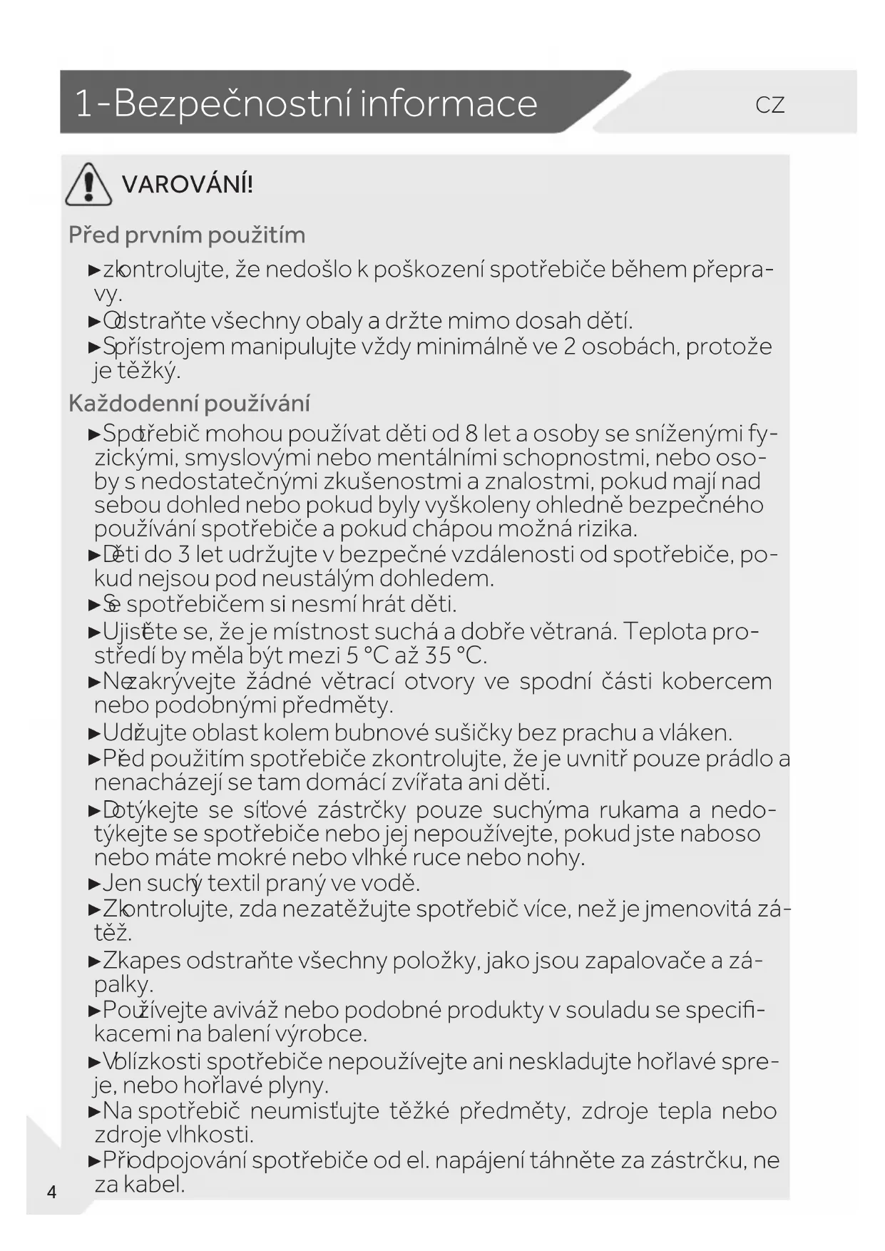VAROVÁNÍ! Před prvním použitím ▶ zk ontrolujte, že nedošlo k poškození spotřebiče během přepra- vy. ▶ O dstraňte všechny obaly a držte mimo dosah dětí. ▶ S přístrojem manipulujte vždy minimálně ve 2 osobách, protože je těžký. Každodenní používání ▶ Spo třebič mohou používat děti od 8 let a osoby se sníženými fy- zickými, smyslovými nebo mentálními schopnostmi, nebo oso- by s nedostatečnými zkušenostmi a znalostmi, pokud mají nad sebou dohled nebo pokud byly vyškoleny ohledně bezpečného používání spotřebiče a pokud chápou možná rizika. ▶ D ěti do 3 let udržujte v bezpečné vzdálenosti od spotřebiče, po- kud nejsou pod neustálým dohledem. ▶ S e spotřebičem si nesmí hrát děti. ▶ Ujist ěte se, že je místnost suchá a dobře větraná. Teplota pro- středí by měla být mezi 5°C až 35°C. ▶ Ne zakrývejte žádné větrací otvory ve spodní části kobercem nebo podobnými předměty. ▶ Udr žujte oblast kolem bubnové sušičky bez prachu a vláken. ▶ Př ed použitím spotřebiče zkontrolujte, že je uvnitř pouze prádlo a nenacházejí se tam domácí zvířata ani děti. ▶ D otýkejte se síťové zástrčky pouze suchýma rukama a nedo- týkejte se spotřebiče nebo jej nepoužívejte, pokud jste naboso nebo máte mokré nebo vlhké ruce nebo nohy. ▶ Jen such ý textil praný ve vodě. ▶ Zk ontrolujte, zda nezatěžujte spotřebič více, než je jmenovitá zá- těž. ▶ Z kapes odstraňte všechny položky, jako jsou zapalovače a zá- palky. ▶ Pou žívejte aviváž nebo podobné produkty v souladu se speci- kacemi na balení výrobce. ▶ V blízkosti spotřebiče nepoužívejte ani neskladujte hořlavé spre- je, nebo hořlavé plyny. ▶ Na spotřebič neumisťujte těžké předměty, zdroje tepla nebo zdroje vlhkosti. ▶ Při odpojování spotřebiče od el. napájení táhněte za zástrčku, ne za kabel.CZ 1-Be zpečnostní informace