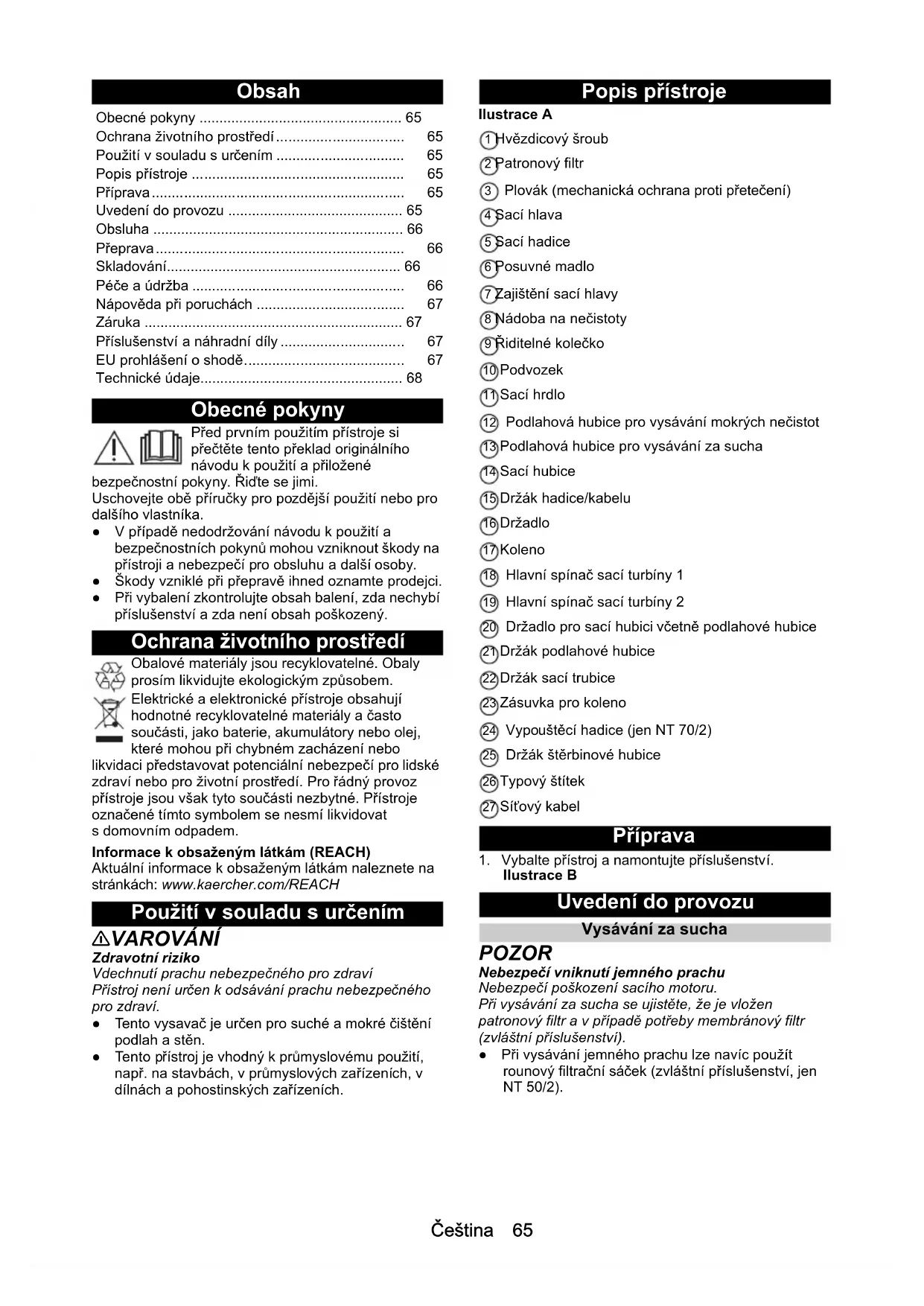 H05VV-F 2x1,0 H05VV-F 2x1,0 H05VV-F 2x1,0 Alkatrészszám (EU) 9.770-933.0 9.770-933.0 9.770-933.0 Kábelhossz m 7,5 7,5 7,5Čeština 65 Obsah Obecné pokyny Před prvním použitím přístroje si přečtěte tento překlad originálního návodu k použití a přiložené bezpečnostní pokyny. Řiďte se jimi. Uschovejte obě příručky pro pozdější použití nebo pro dalšího vlastníka. ● V případě nedodržování návodu k použití a bezpečnostních pokynů mohou vzniknout škody na přístroji a nebezpečí pro obsluhu a další osoby. ● Škody vzniklé při přepravě ihned oznamte prodejci. ● Při vybalení zkontrolujte obsah balení, zda nechybí příslušenství a zda není obsah poškozený. Ochrana životního prostředí Obalové materiály jsou recyklovatelné. Obaly prosím likvidujte ekologickým způsobem. Elektrické a elektronické přístroje obsahují hodnotné recyklovatelné materiály a často součásti, jako baterie, akumulátory nebo olej, které mohou při chybném zacházení nebo likvidaci představovat potenciální nebezpečí pro lidské zdraví nebo pro životní prostředí. Pro řádný provoz přístroje jsou však tyto součásti nezbytné. Přístroje označené tímto symbolem se nesmí likvidovat s domovním odpadem. Informace k obsaženým látkám (REACH) Aktuální informace k obsaženým látkám naleznete na stránkách: www.kaercher.com/REACH Použití v souladu s určením 몇 VAROVÁNÍ Zdravotní riziko Vdechnutí prachu nebezpečného pro zdraví Přístroj není určen k odsávání prachu nebezpečného pro zdraví. ● Tento vysavač je určen pro suché a mokré čištění podlah a stěn. ● Tento přístroj je vhodný k průmyslovému použití, např. na stavbách, v průmyslových zařízeních, v dílnách a pohostinských zařízeních. Popis přístroje Ilustrace A 1 Hvězdicový šroub 2 Patronový filtr 3 Plovák (mechanická ochrana proti přetečení) 4 Sací hlava 5 Sací hadice 6 Posuvné madlo 7 Zajištění sací hlavy 8 Nádoba na nečistoty 9 Řiditelné kolečko 10 Podvozek 11 Sací hrdlo 12 Podlahová hubice pro vysávání mokrých nečistot 13 Podlahová hubice pro vysávání za sucha 14 Sací hubice 15 Držák hadice/kabelu 16 Držadlo 17 Koleno 18 Hlavní spínač sací turbíny 1 19 Hlavní spínač sací turbíny 2 20 Držadlo pro sací hubici včetně podlahové hubice 21 Držák podlahové hubice 22 Držák sací trubice 23 Zásuvka pro koleno 24 Vypouštěcí hadice (jen NT 70/2) 25 Držák štěrbinové hubice 26 Typový štítek 27 Síťový kabel Příprava